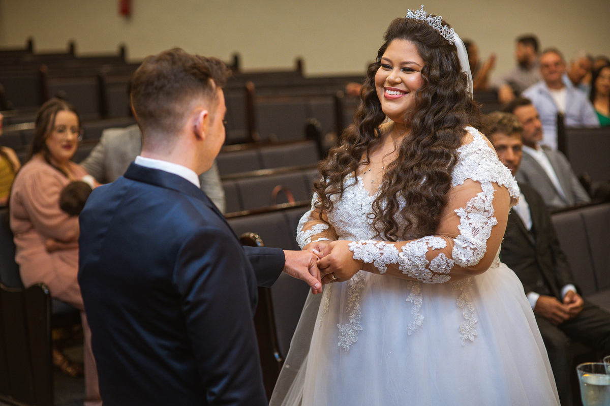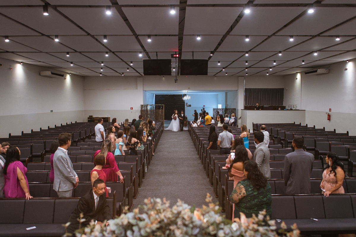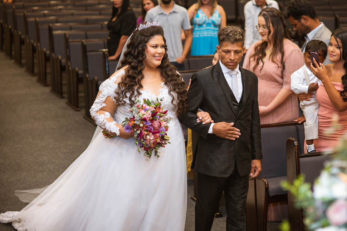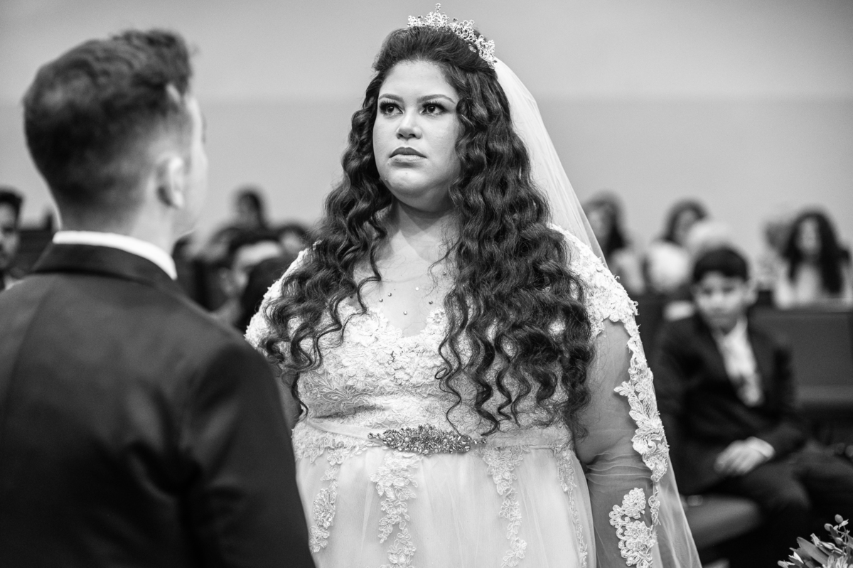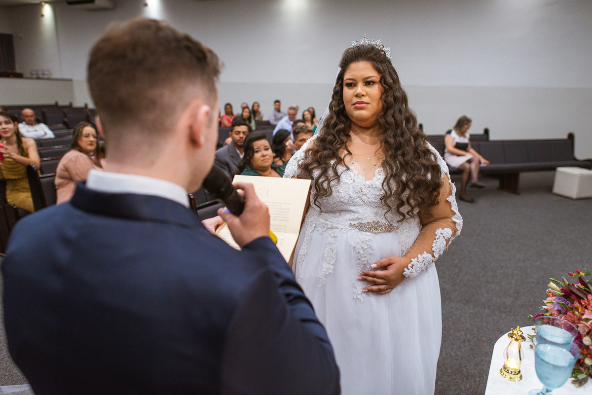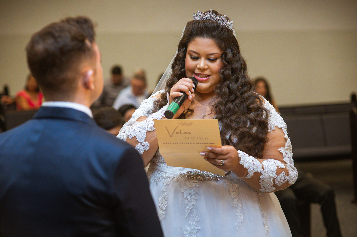 Assim, demos sequência aos preparativos. Alexandre foi para a Igreja e Géssiley finalizou sua produção colocando o véu e tudo mais. Fizemos algumas fotos da noiva pronta e já partimos para a celebração. A Igreja em que o casamento foi celebrado é a Casa de Oração. Pela primeira vez eu estive presente por lá e já nos surpreendemos pela estrutura belíssima do local. Os padrinhos e convidados estavam posicionados e o noivo ansioso pela chegada de sua amada noiva. Aguardamos alguns minutinhos e ela chegou. Fizemos nossas tradicionais fotografias dela no carro e partimos para dar início à cerimônia. O grupo musical não poderia ser melhor, a equipe do Som do Coração estava apostos e já deu os acordes iniciais para que tudo começasse.