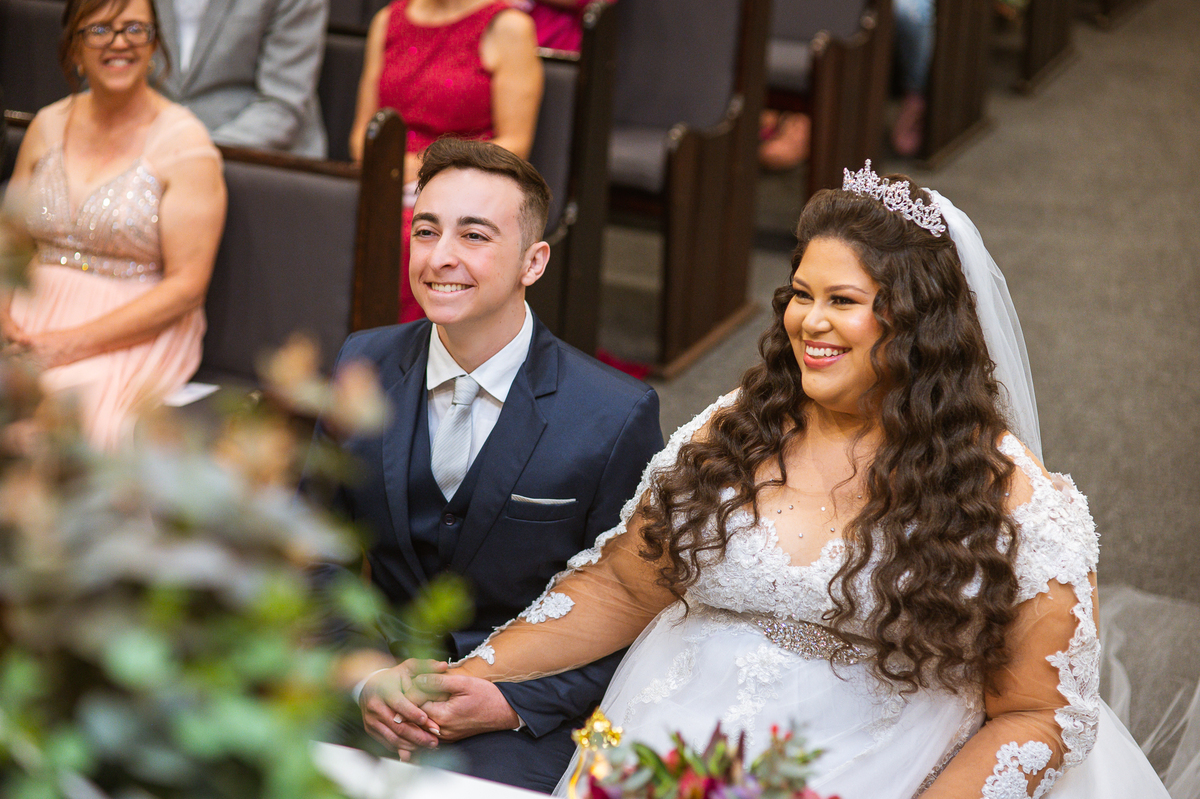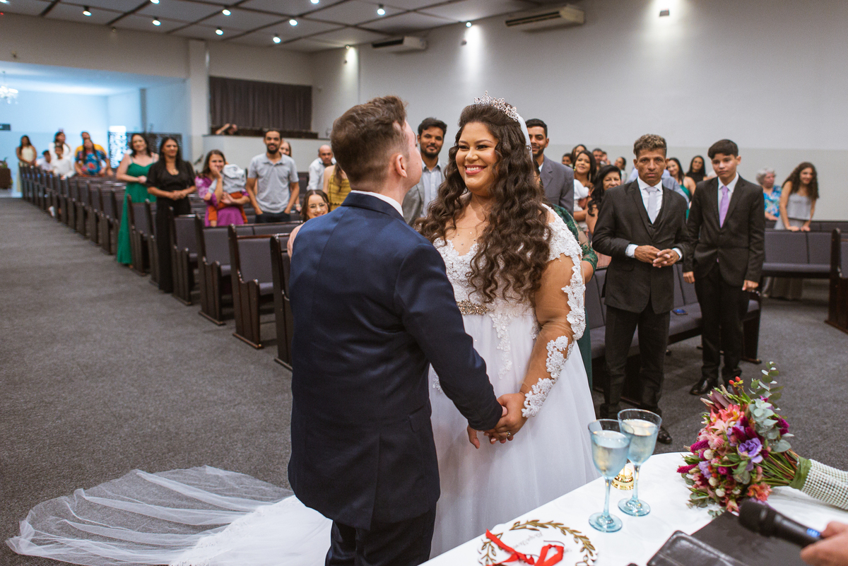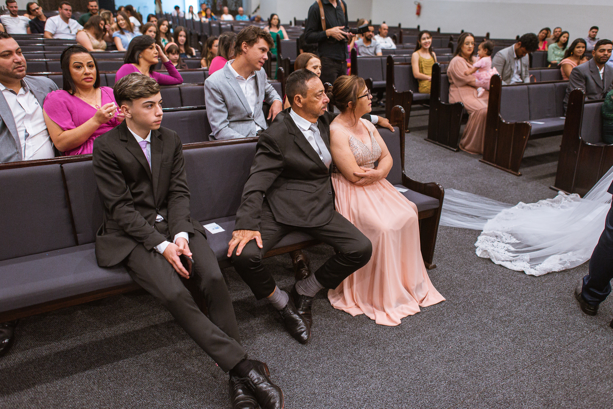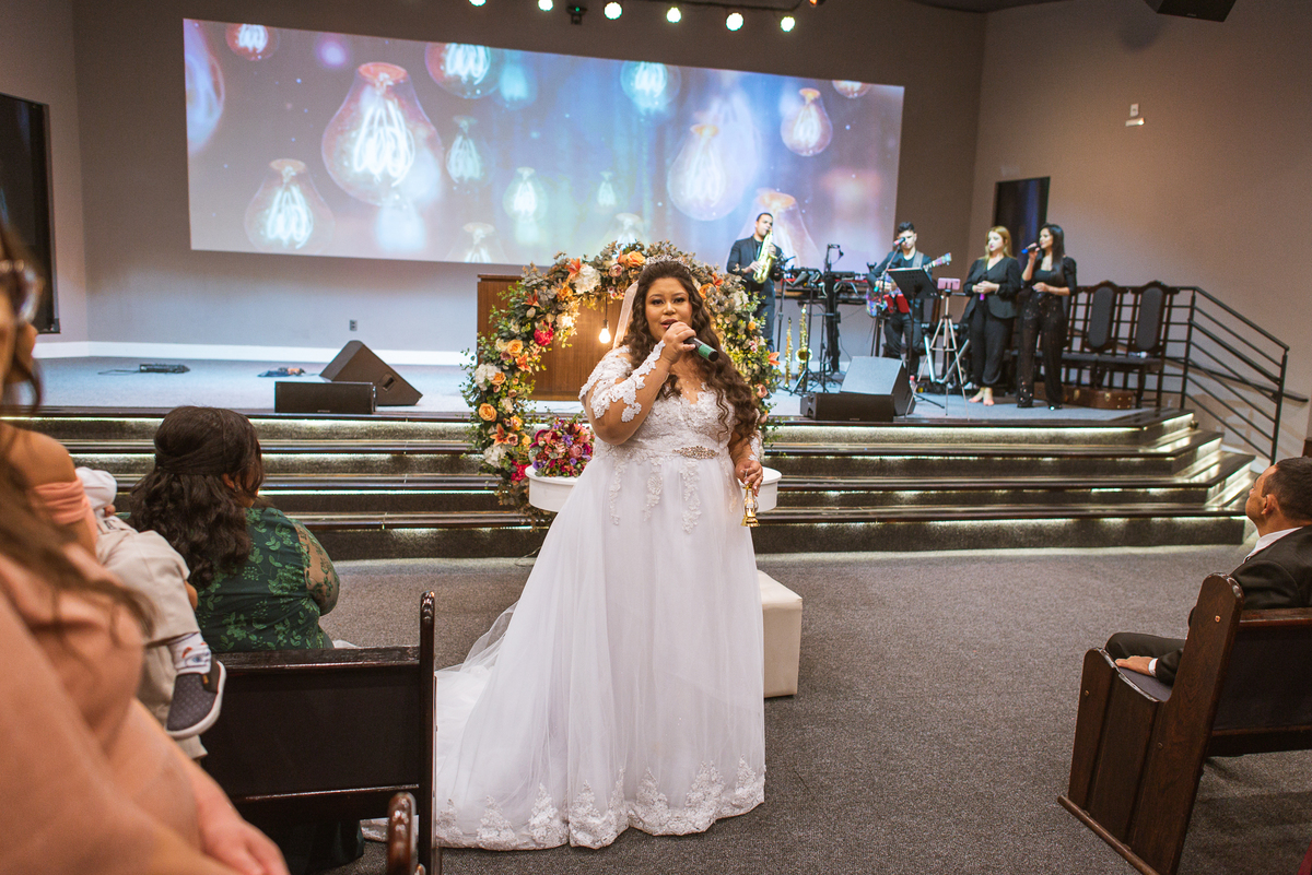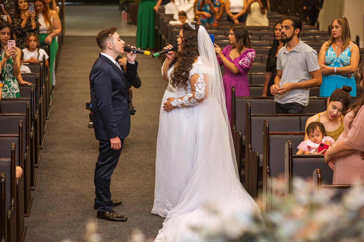 Assim, demos sequência aos preparativos. Alexandre foi para a Igreja e Géssiley finalizou sua produção colocando o véu e tudo mais. Fizemos algumas fotos da noiva pronta e já partimos para a celebração. A Igreja em que o casamento foi celebrado é a Casa de Oração. Pela primeira vez eu estive presente por lá e já nos surpreendemos pela estrutura belíssima do local. Os padrinhos e convidados estavam posicionados e o noivo ansioso pela chegada de sua amada noiva. Aguardamos alguns minutinhos e ela chegou. Fizemos nossas tradicionais fotografias dela no carro e partimos para dar início à cerimônia. O grupo musical não poderia ser melhor, a equipe do Som do Coração estava apostos e já deu os acordes iniciais para que tudo começasse.