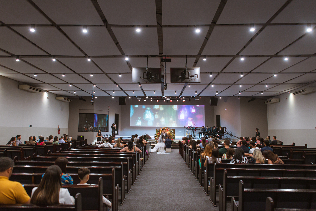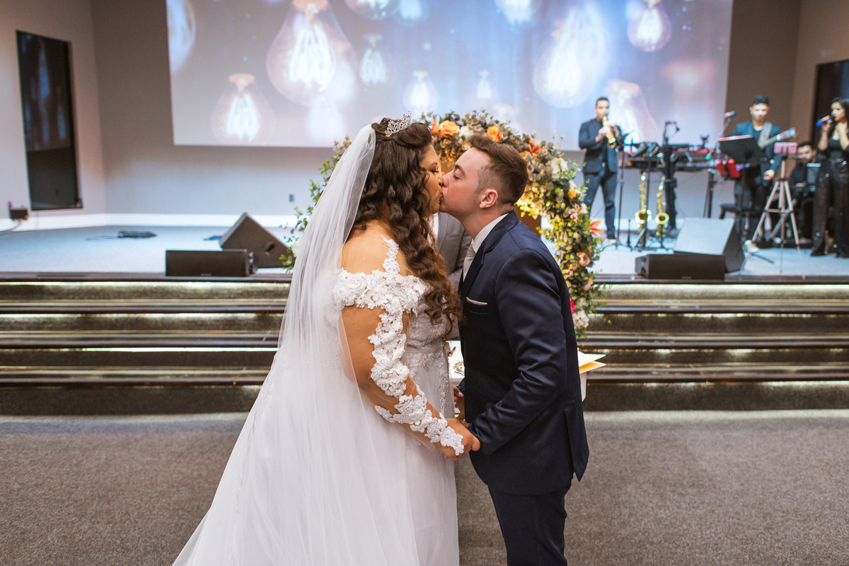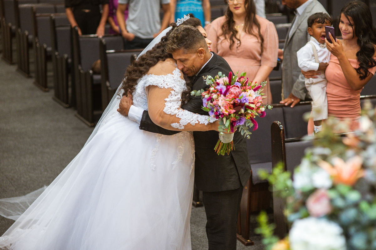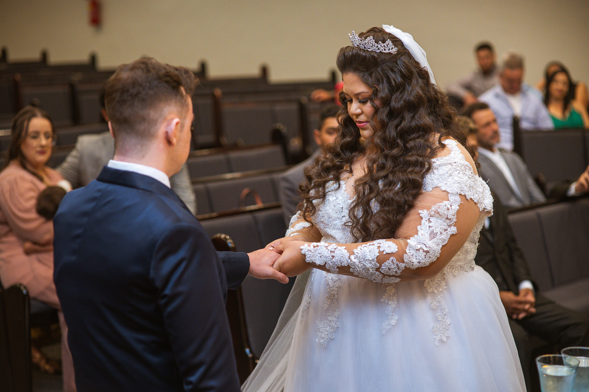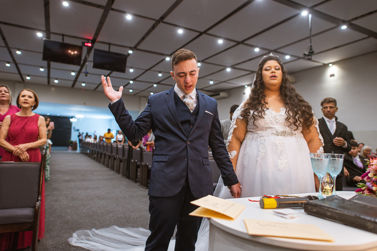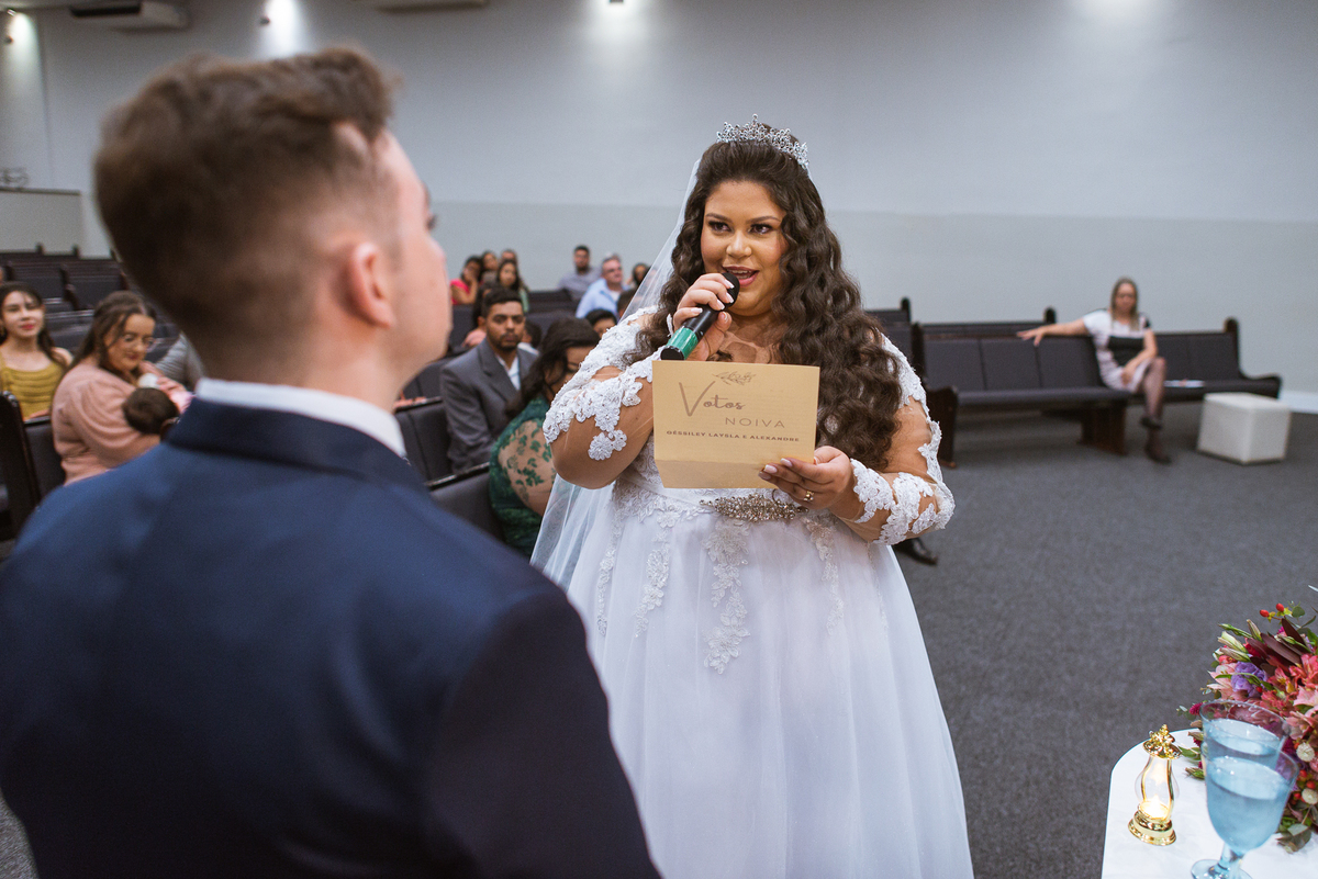 Assim, demos sequência aos preparativos. Alexandre foi para a Igreja e Géssiley finalizou sua produção colocando o véu e tudo mais. Fizemos algumas fotos da noiva pronta e já partimos para a celebração. A Igreja em que o casamento foi celebrado é a Casa de Oração. Pela primeira vez eu estive presente por lá e já nos surpreendemos pela estrutura belíssima do local. Os padrinhos e convidados estavam posicionados e o noivo ansioso pela chegada de sua amada noiva. Aguardamos alguns minutinhos e ela chegou. Fizemos nossas tradicionais fotografias dela no carro e partimos para dar início à cerimônia. O grupo musical não poderia ser melhor, a equipe do Som do Coração estava apostos e já deu os acordes iniciais para que tudo começasse.