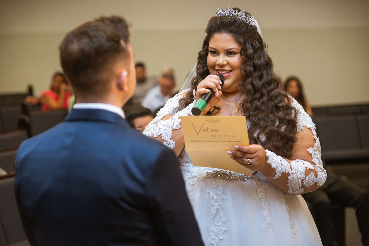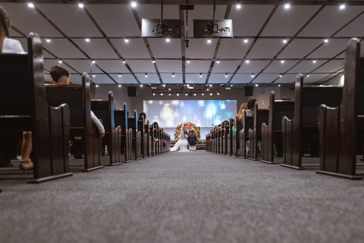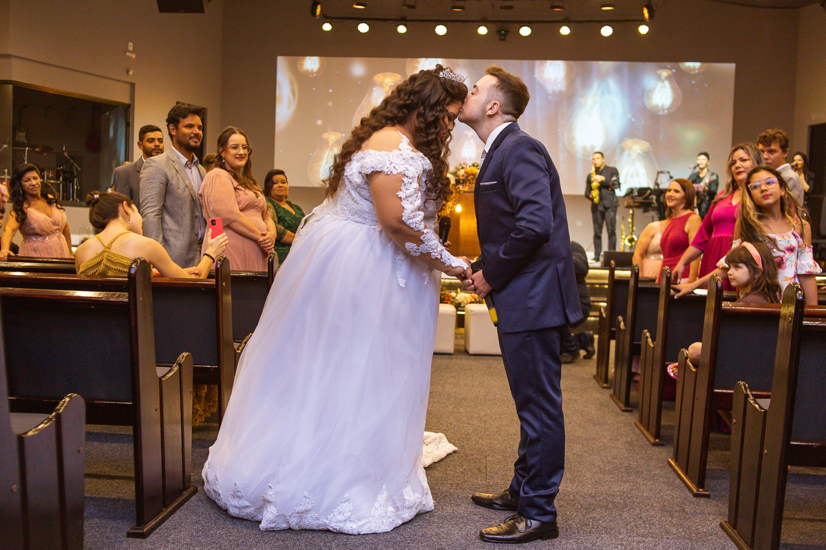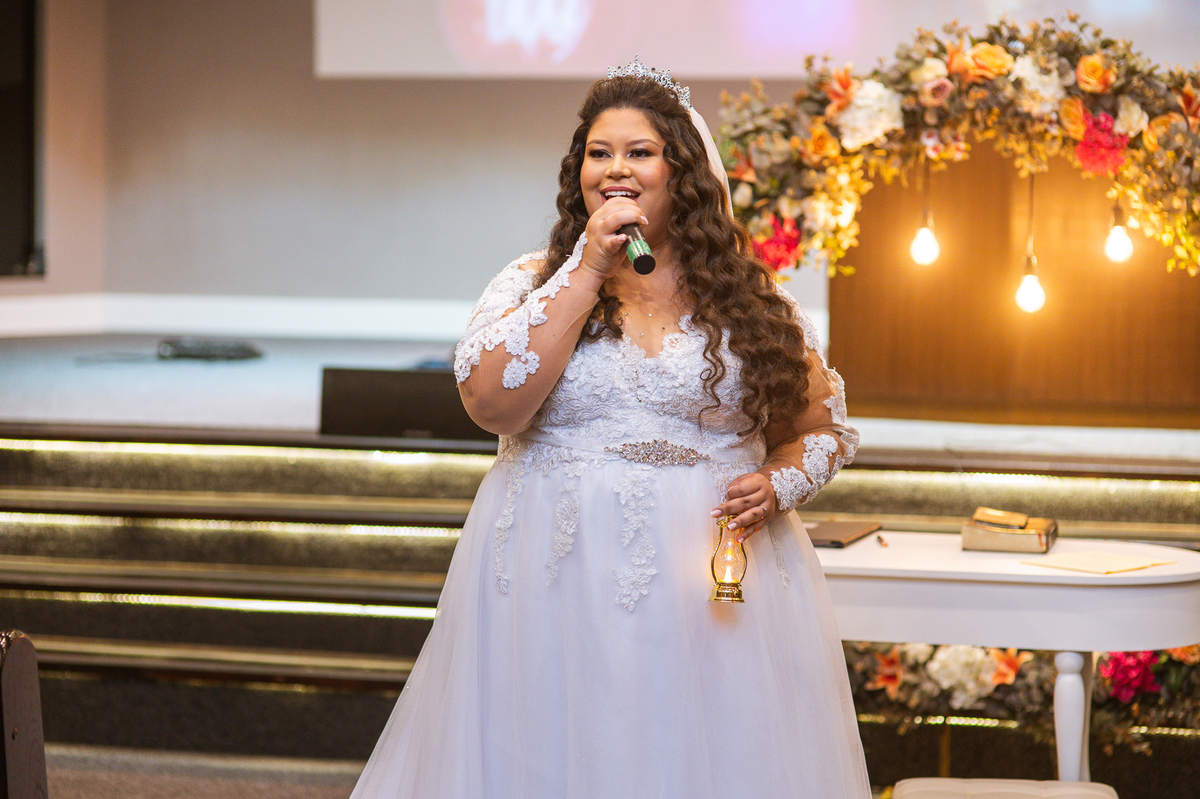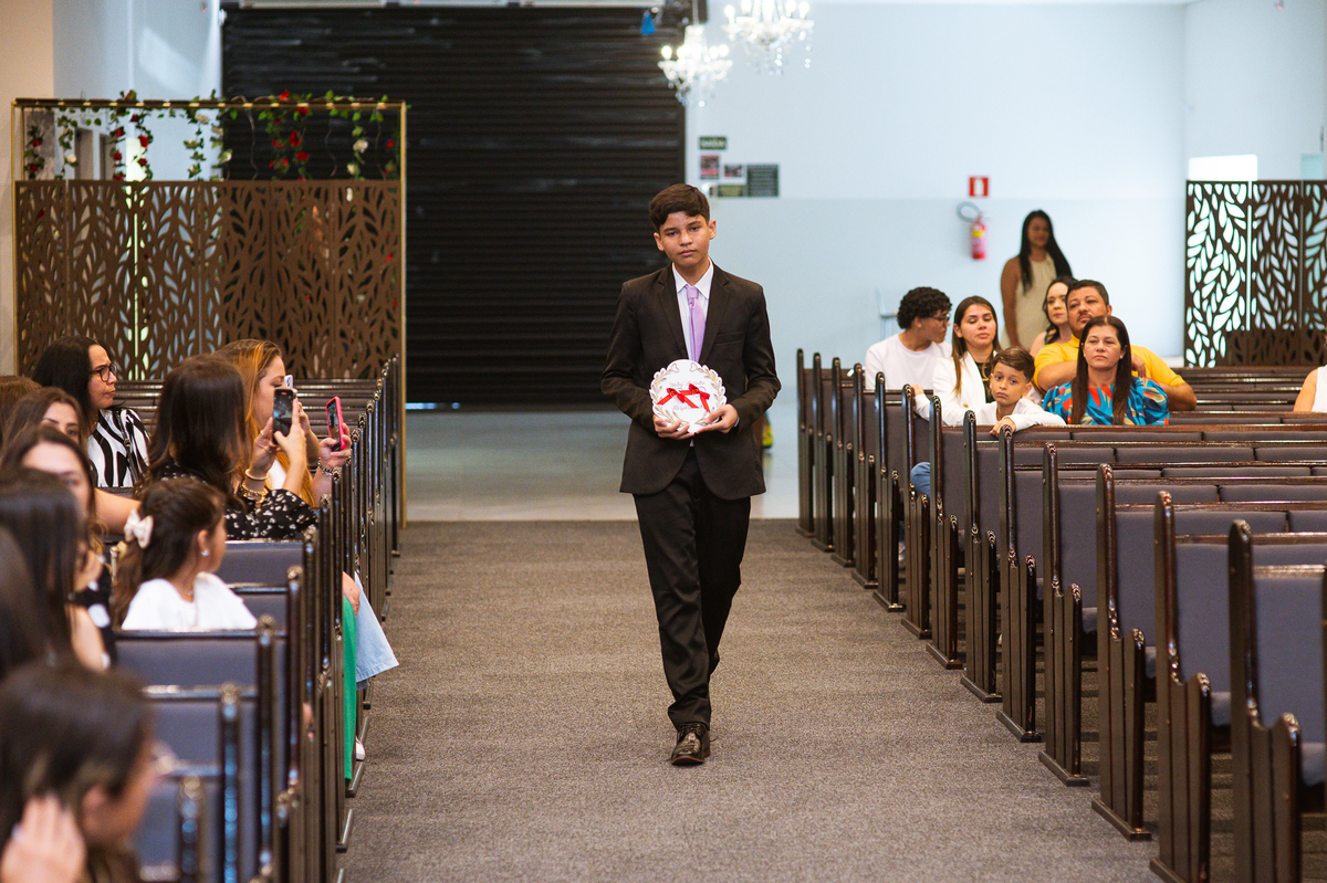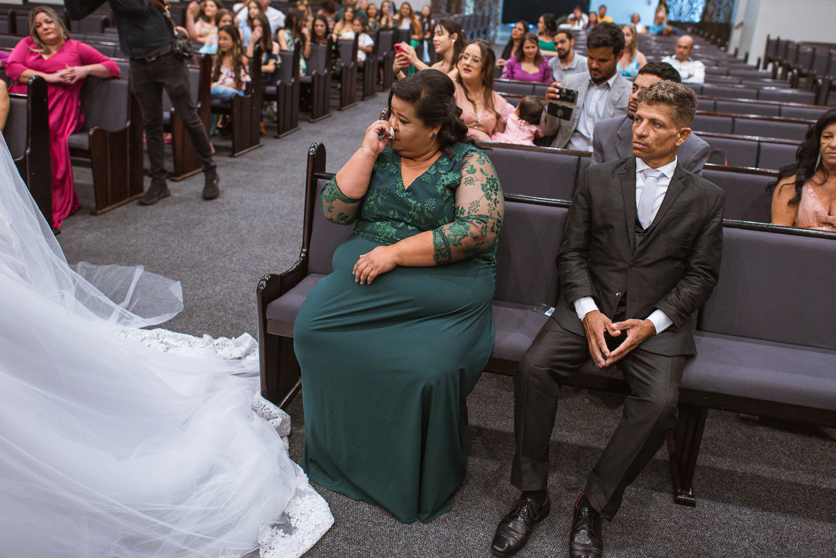 Assim, demos sequência aos preparativos. Alexandre foi para a Igreja e Géssiley finalizou sua produção colocando o véu e tudo mais. Fizemos algumas fotos da noiva pronta e já partimos para a celebração. A Igreja em que o casamento foi celebrado é a Casa de Oração. Pela primeira vez eu estive presente por lá e já nos surpreendemos pela estrutura belíssima do local. Os padrinhos e convidados estavam posicionados e o noivo ansioso pela chegada de sua amada noiva. Aguardamos alguns minutinhos e ela chegou. Fizemos nossas tradicionais fotografias dela no carro e partimos para dar início à cerimônia. O grupo musical não poderia ser melhor, a equipe do Som do Coração estava apostos e já deu os acordes iniciais para que tudo começasse.