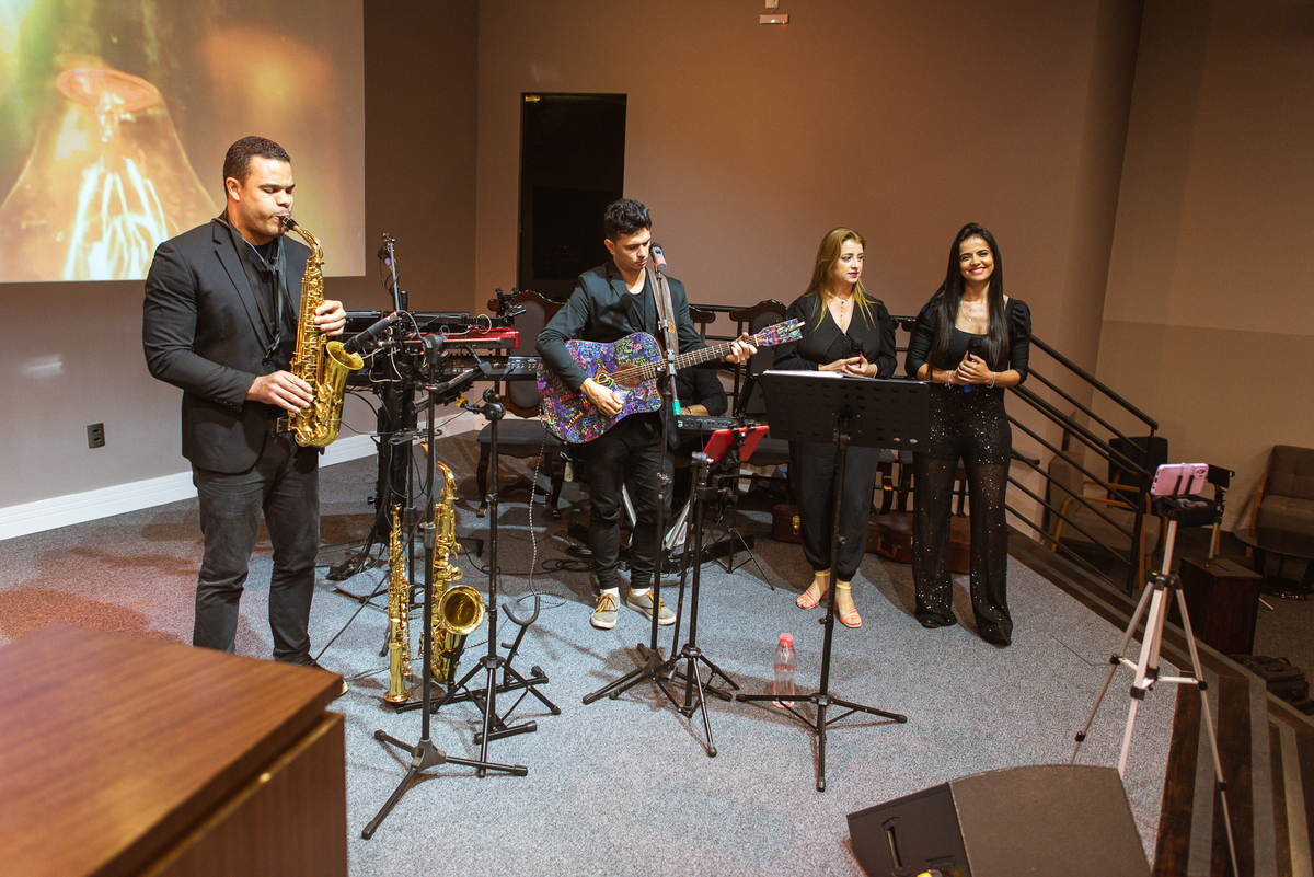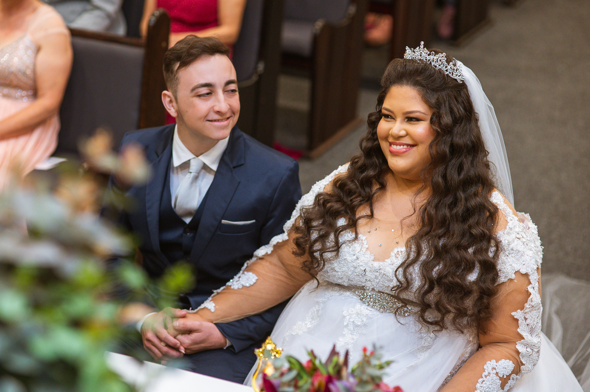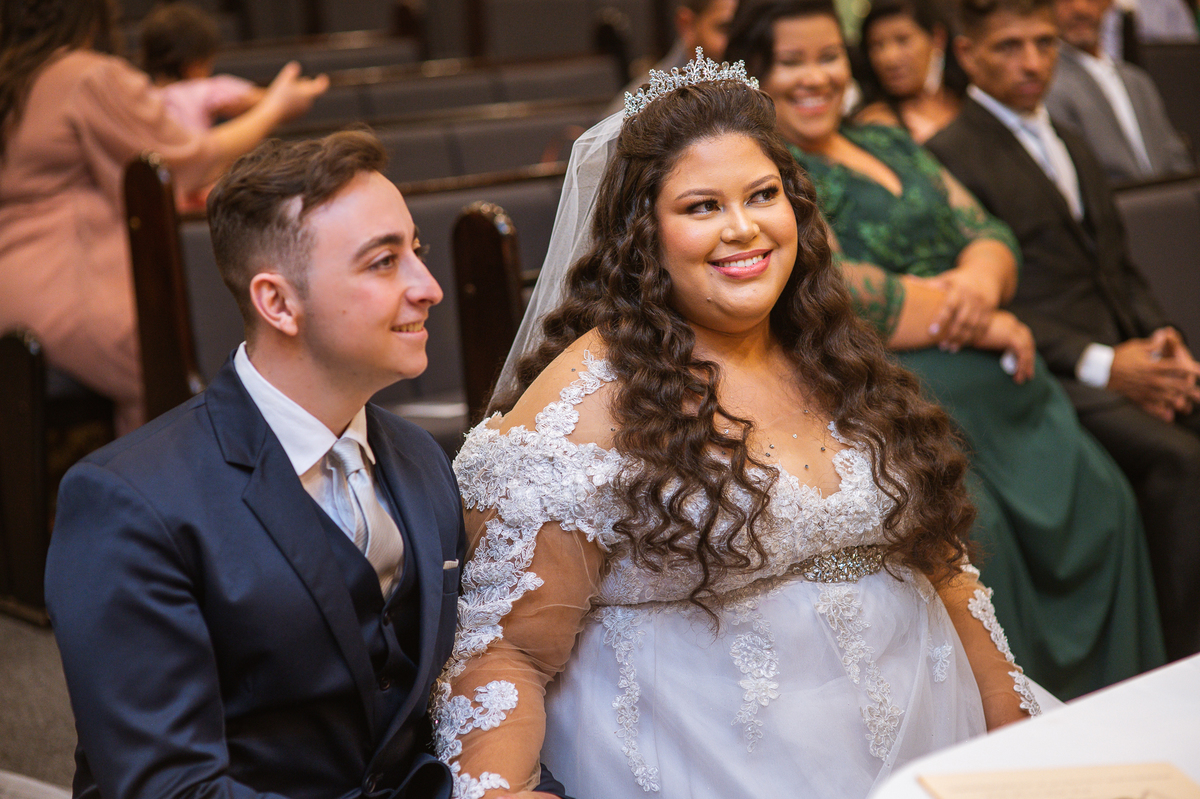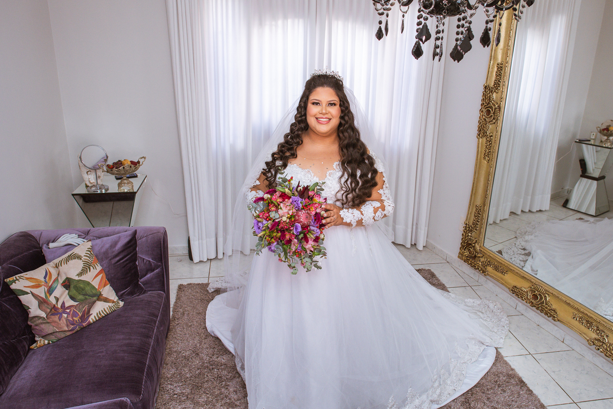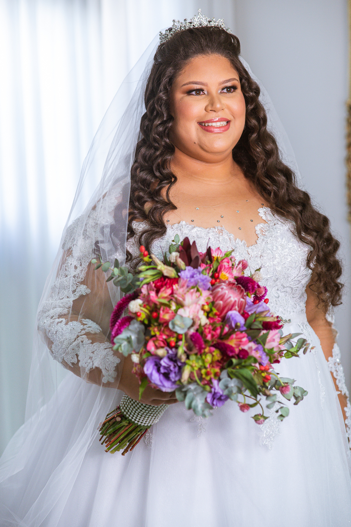 Assim, demos sequência aos preparativos. Alexandre foi para a Igreja e Géssiley finalizou sua produção colocando o véu e tudo mais. Fizemos algumas fotos da noiva pronta e já partimos para a celebração. A Igreja em que o casamento foi celebrado é a Casa de Oração. Pela primeira vez eu estive presente por lá e já nos surpreendemos pela estrutura belíssima do local. Os padrinhos e convidados estavam posicionados e o noivo ansioso pela chegada de sua amada noiva. Aguardamos alguns minutinhos e ela chegou. Fizemos nossas tradicionais fotografias dela no carro e partimos para dar início à cerimônia. O grupo musical não poderia ser melhor, a equipe do Som do Coração estava apostos e já deu os acordes iniciais para que tudo começasse.