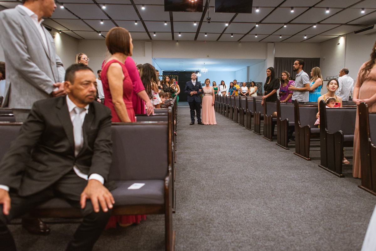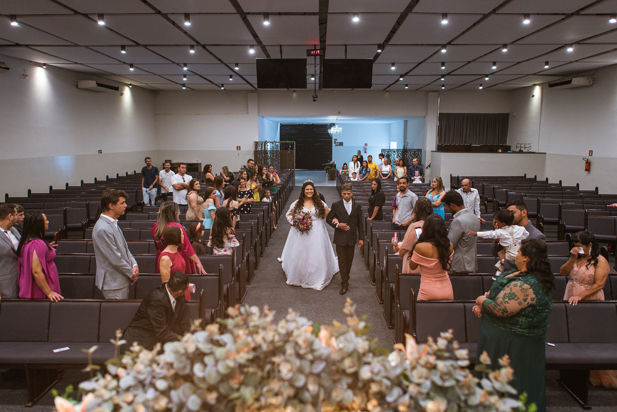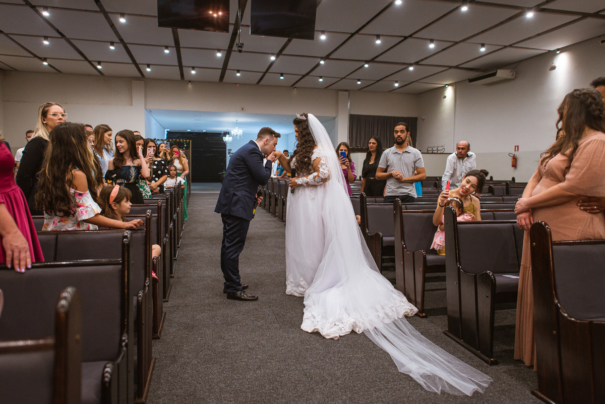 Aqui preciso fazer um adendo e explicar o simbolismo que representa a entrada da noiva. Alguns casais evangélicos seguem a tradição de que a noiva deve entrar primeiro que o noivo, e esperá-lo no altar. Mas qual o simbolismo envolvido nisso? A bíblia nos relata: A igreja é a noiva de Cristo. Com frequência a relação entre Cristo e sua igreja é comparada a um noivado ou casamento. O casamento é o mistério em que o homem e a mulher “se tornarão uma só carne” (Gênesis 2.24), o símbolo da mais íntima união. Assim, Cristo é denominado o Noivo que convida os seus para a festa de casamento (Mateus 9.15; Apocalipse 19.17), que aguarda as virgens que prepararam óleo para suas lâmpadas (Mateus 25.1) e que voltará para recepcionar a igreja, a Jerusalém celestial como “uma noiva adornada para o seu marido” (Apocalipse 21.2). Essa virgem pura é a igreja que – lavada no sangue do Cordeiro – poderá ir sem máculas e rugas ao encontro do seu Senhor (Apocalipse 7.14; Efésios 5.27)
