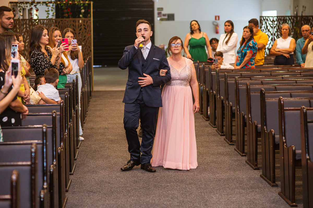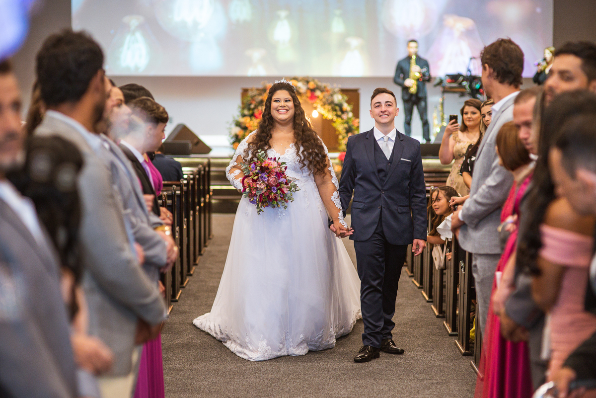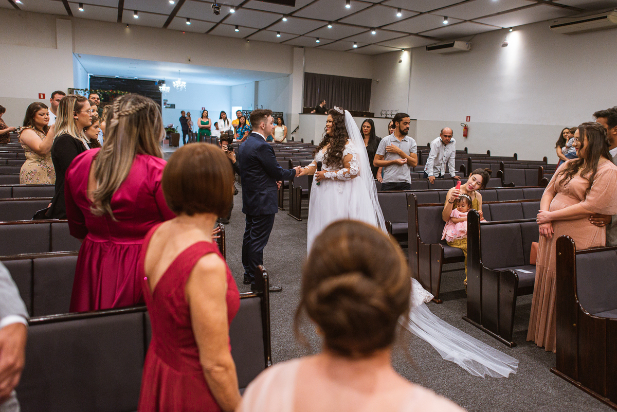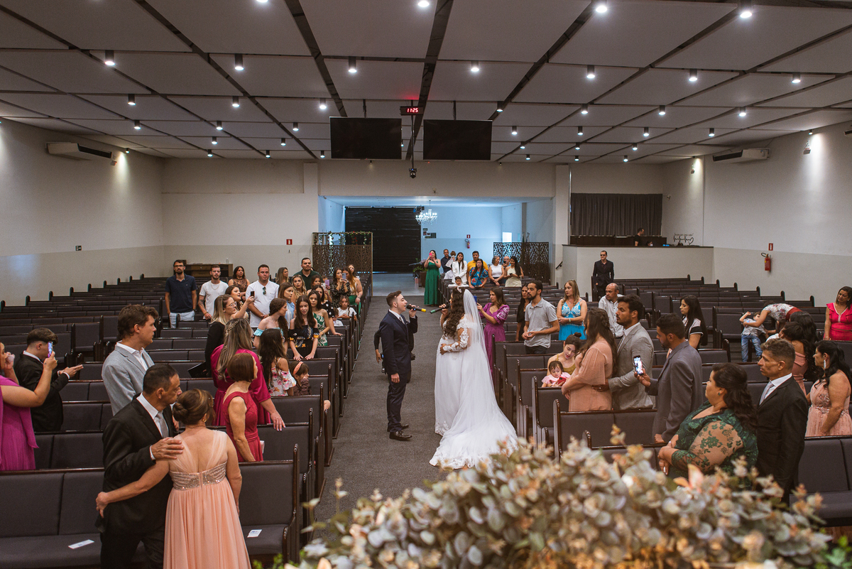 Aqui preciso fazer um adendo e explicar o simbolismo que representa a entrada da noiva. Alguns casais evangélicos seguem a tradição de que a noiva deve entrar primeiro que o noivo, e esperá-lo no altar. Mas qual o simbolismo envolvido nisso? A bíblia nos relata: A igreja é a noiva de Cristo. Com frequência a relação entre Cristo e sua igreja é comparada a um noivado ou casamento. O casamento é o mistério em que o homem e a mulher “se tornarão uma só carne” (Gênesis 2.24), o símbolo da mais íntima união. Assim, Cristo é denominado o Noivo que convida os seus para a festa de casamento (Mateus 9.15; Apocalipse 19.17), que aguarda as virgens que prepararam óleo para suas lâmpadas (Mateus 25.1) e que voltará para recepcionar a igreja, a Jerusalém celestial como “uma noiva adornada para o seu marido” (Apocalipse 21.2). Essa virgem pura é a igreja que – lavada no sangue do Cordeiro – poderá ir sem máculas e rugas ao encontro do seu Senhor (Apocalipse 7.14; Efésios 5.27)