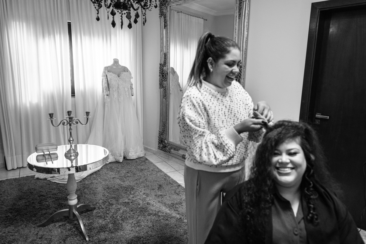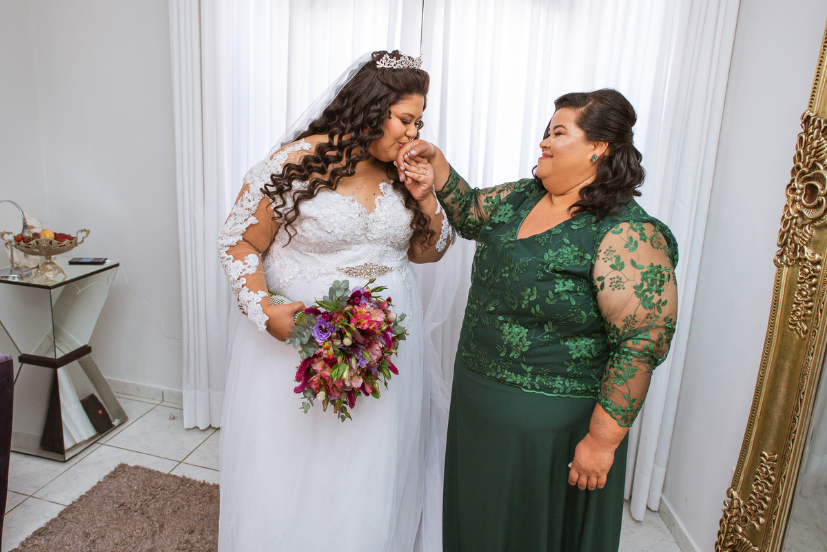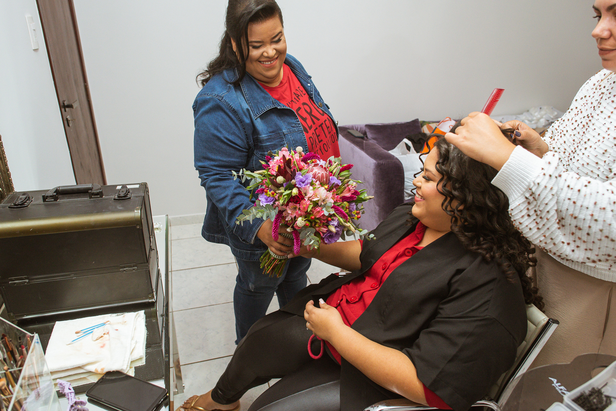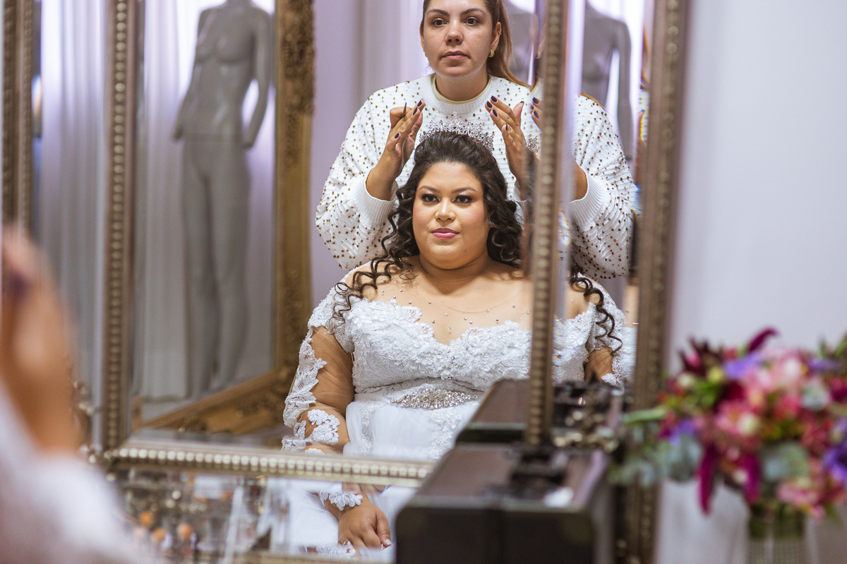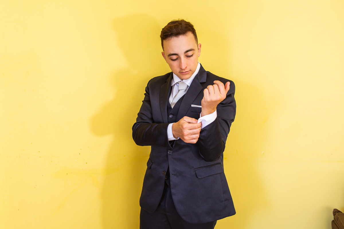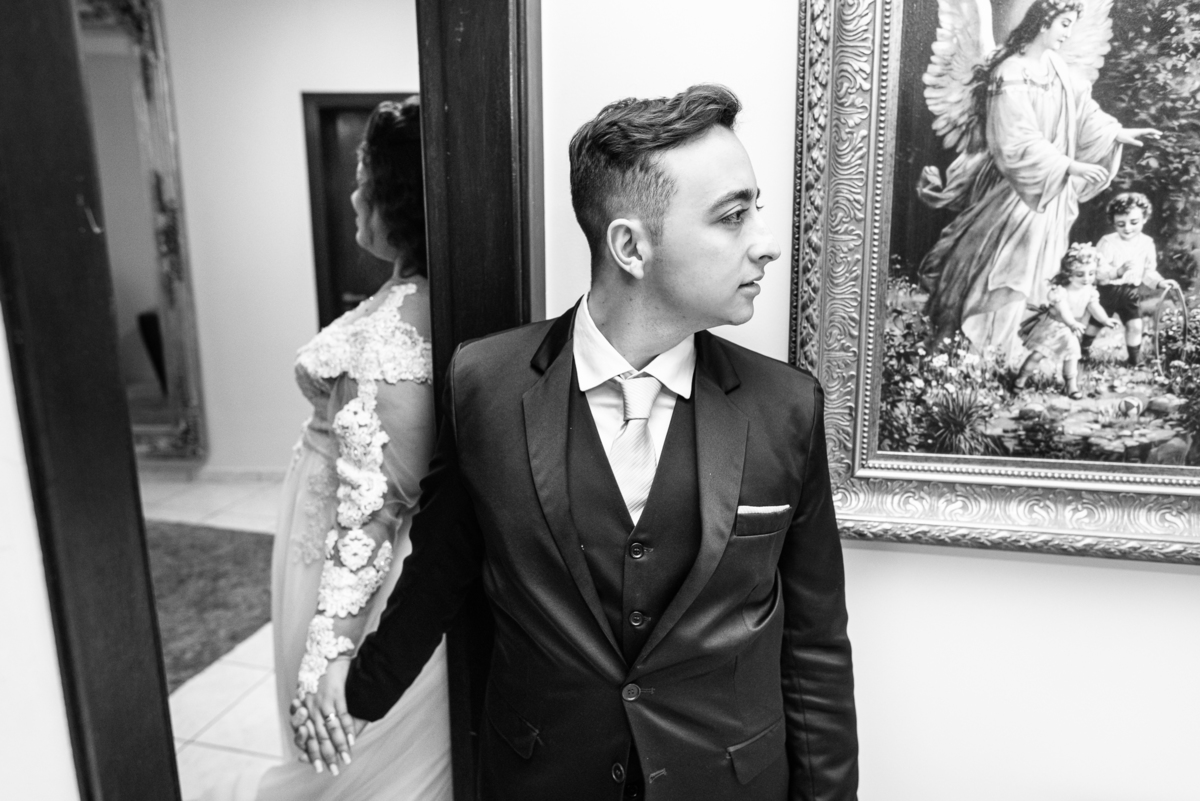 Enquanto finalizava sua produção, a sua mãe a acompanhava quietinha no canto, tentando não demonstrar muito nervosismo nem ansiedade, mas por dentro eu sabia que seu coração estava a mil. Os olhares diziam isso. A avó da noiva e a sua sogra também estavam acompanhando a noiva em seu dia. Enquanto isso, na casa do noivo, os preparativos também estavam à mil. Alexandre contou com a participação de seu pai e seu irmão para lhe ajudar. Vestiu seu traje e ficou pronto em questão de minutos. Fizemos as fotos e ele logo queria descer para fazer a tão sonhada foto do momento "First Touch". Ele estava preocupado com o tempo e sobre o casamento atrasar, mas tudo deu certinho.