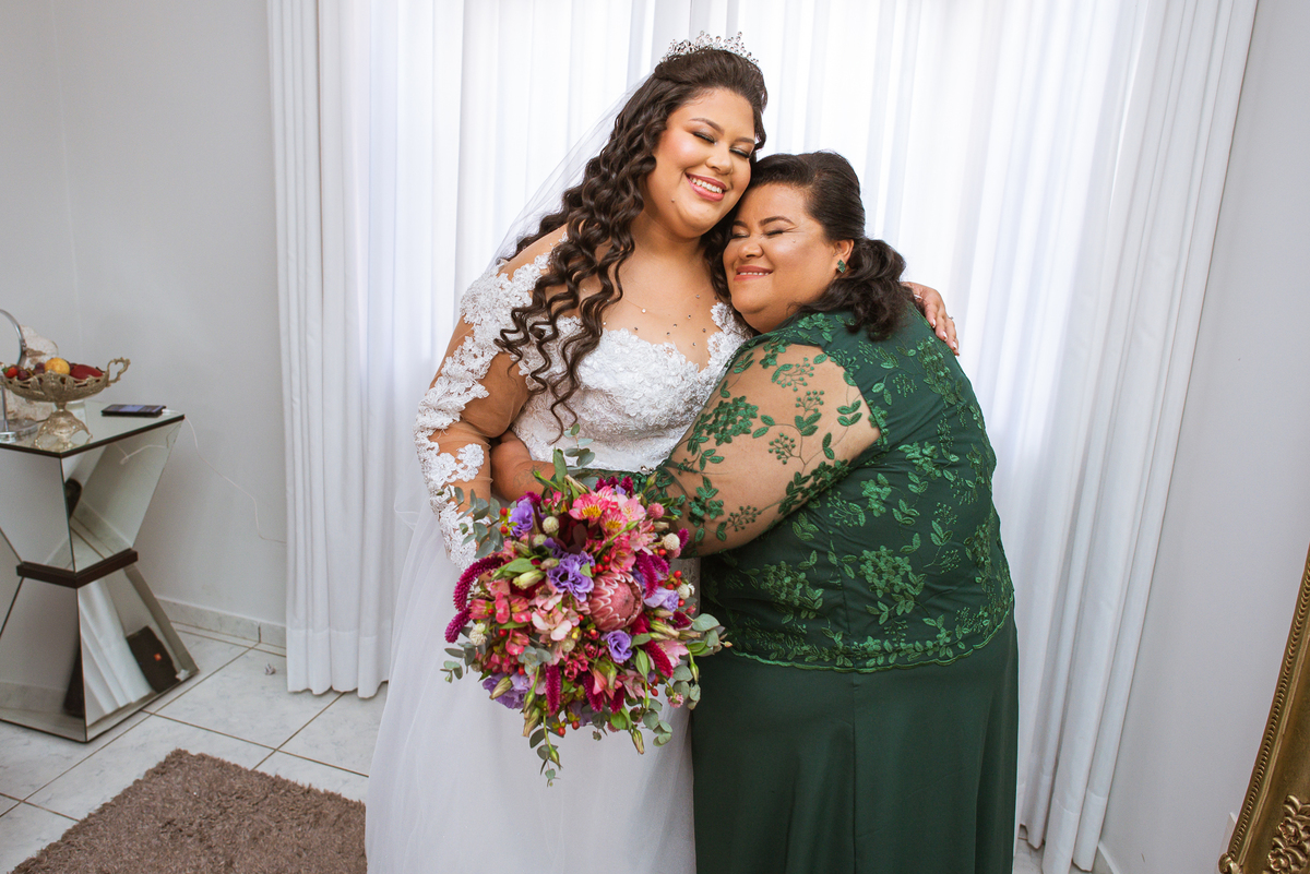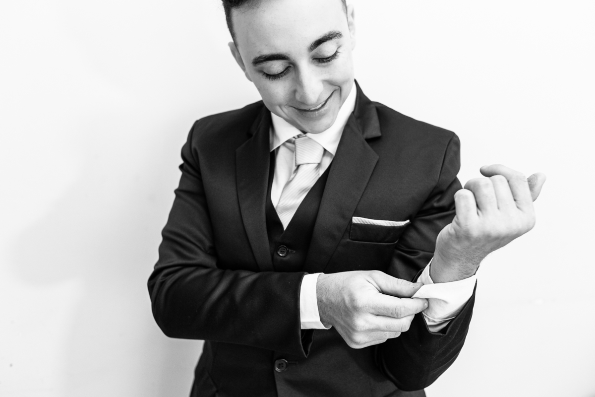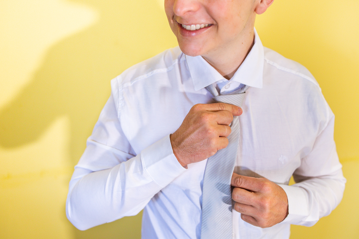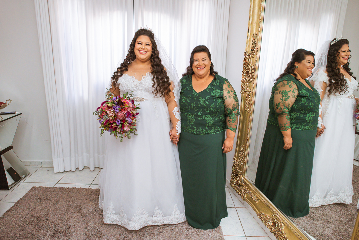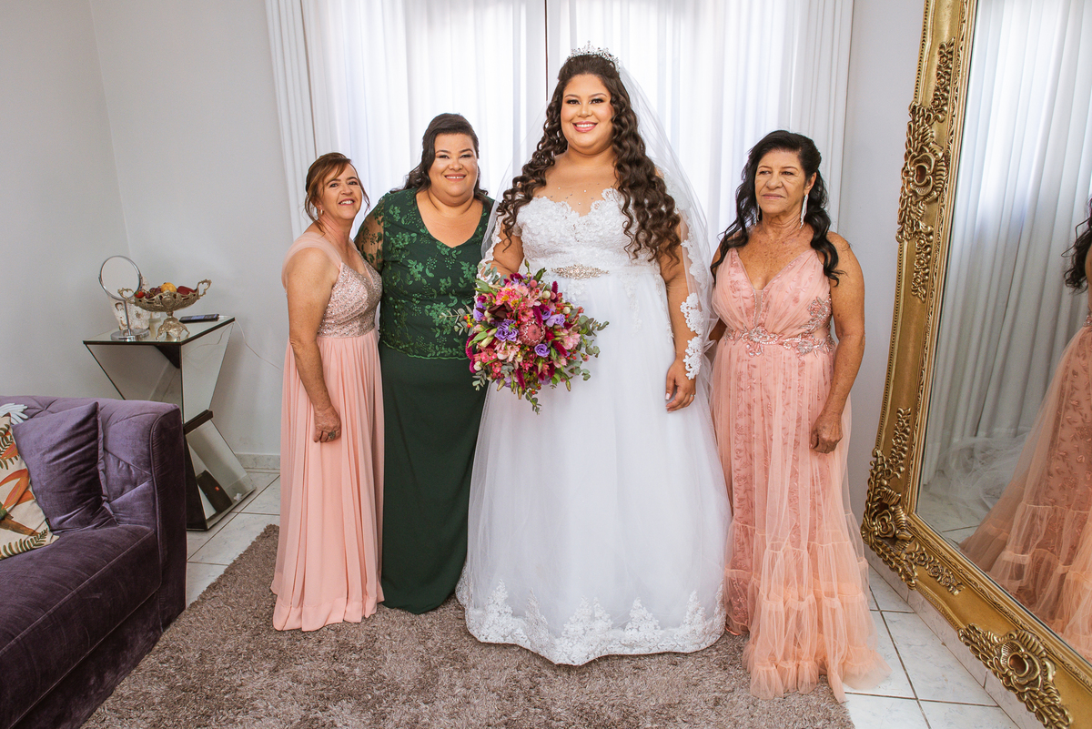 Enquanto finalizava sua produção, a sua mãe a acompanhava quietinha no canto, tentando não demonstrar muito nervosismo nem ansiedade, mas por dentro eu sabia que seu coração estava a mil. Os olhares diziam isso. A avó da noiva e a sua sogra também estavam acompanhando a noiva em seu dia. Enquanto isso, na casa do noivo, os preparativos também estavam à mil. Alexandre contou com a participação de seu pai e seu irmão para lhe ajudar. Vestiu seu traje e ficou pronto em questão de minutos. Fizemos as fotos e ele logo queria descer para fazer a tão sonhada foto do momento "First Touch". Ele estava preocupado com o tempo e sobre o casamento atrasar, mas tudo deu certinho.