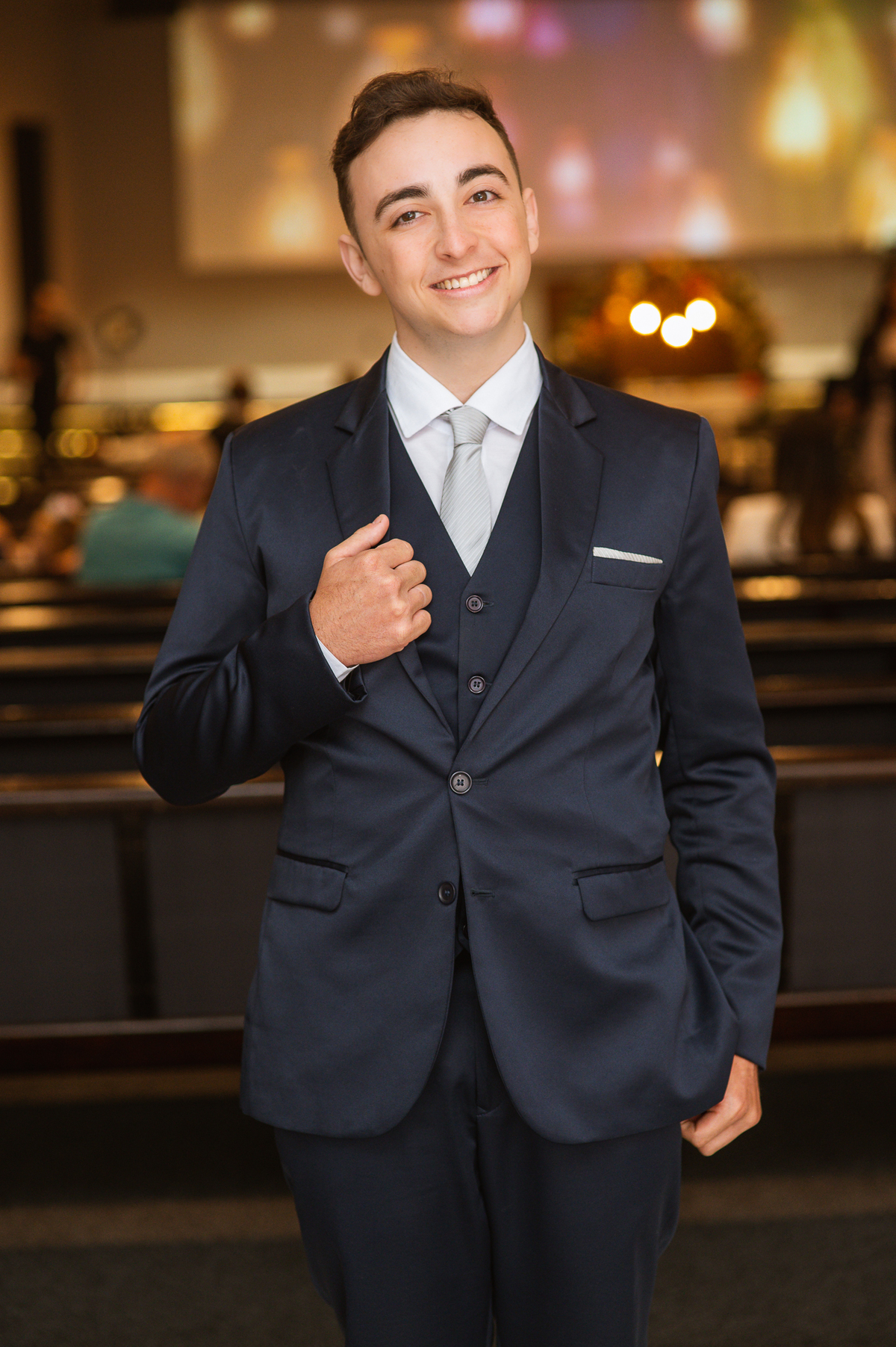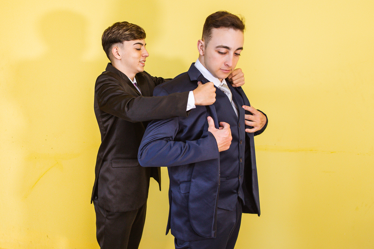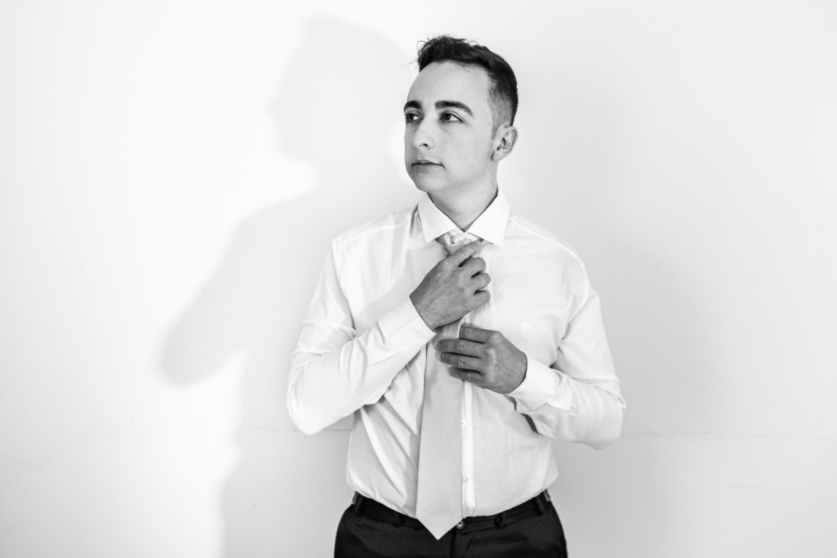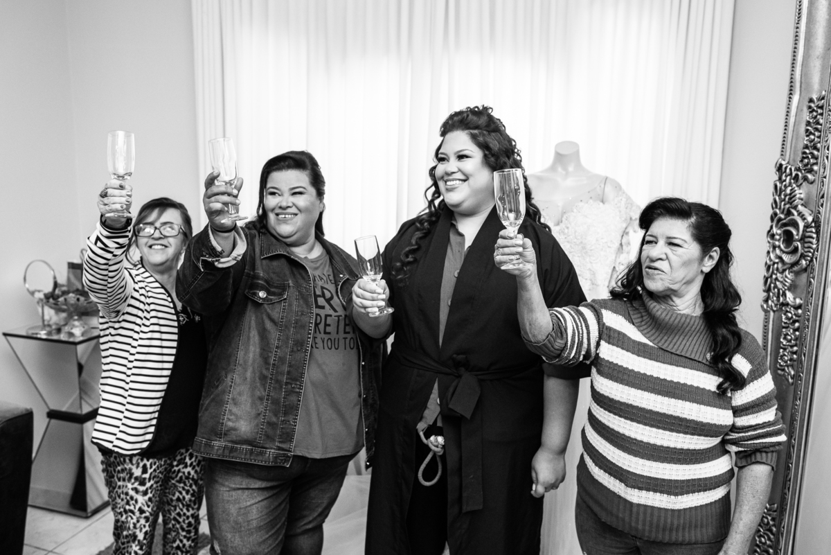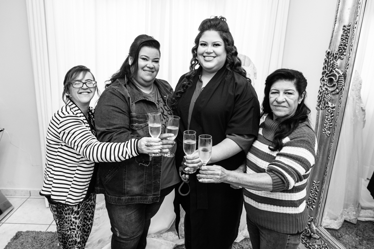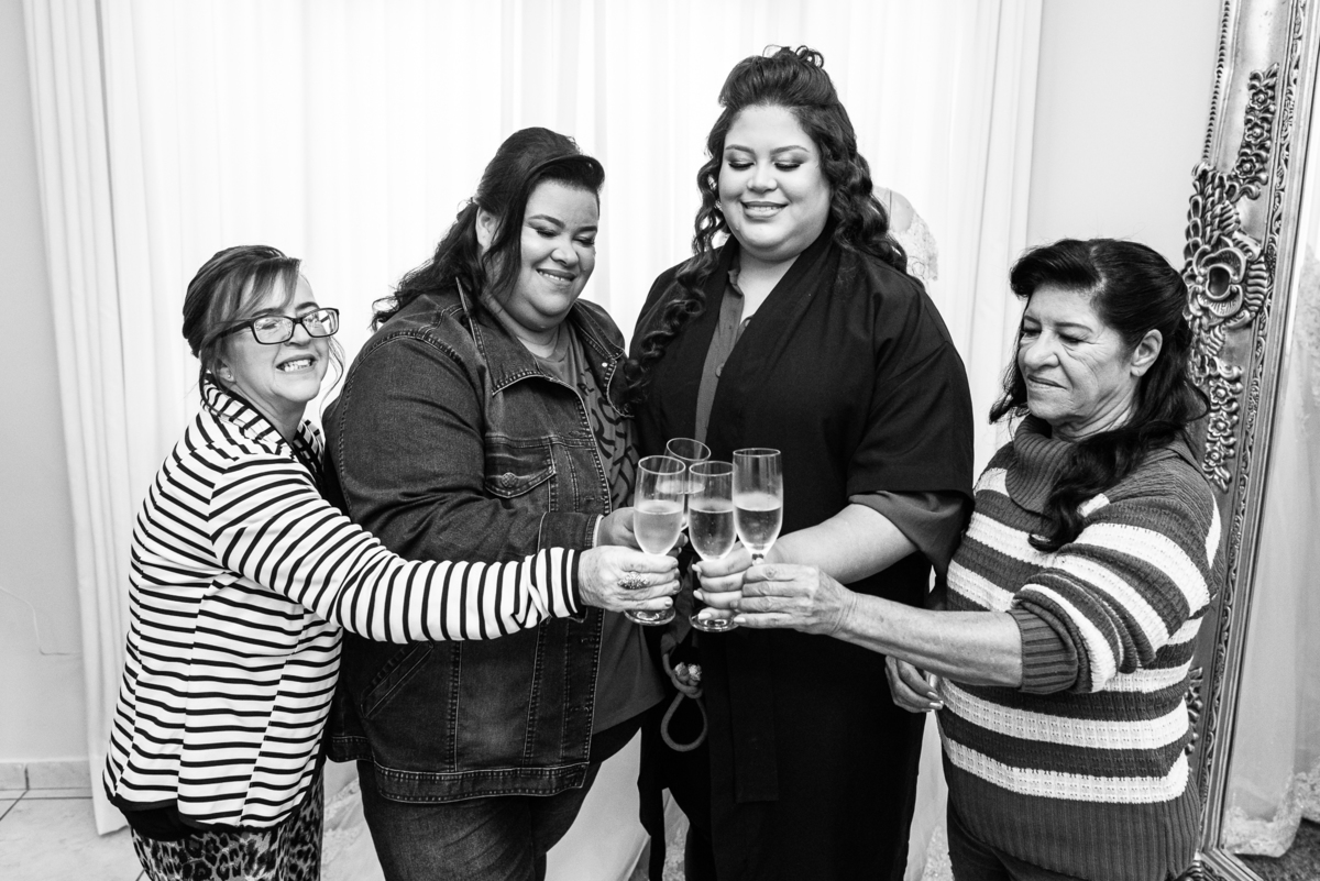 Enquanto finalizava sua produção, a sua mãe a acompanhava quietinha no canto, tentando não demonstrar muito nervosismo nem ansiedade, mas por dentro eu sabia que seu coração estava a mil. Os olhares diziam isso. A avó da noiva e a sua sogra também estavam acompanhando a noiva em seu dia. Enquanto isso, na casa do noivo, os preparativos também estavam à mil. Alexandre contou com a participação de seu pai e seu irmão para lhe ajudar. Vestiu seu traje e ficou pronto em questão de minutos. Fizemos as fotos e ele logo queria descer para fazer a tão sonhada foto do momento "First Touch". Ele estava preocupado com o tempo e sobre o casamento atrasar, mas tudo deu certinho.