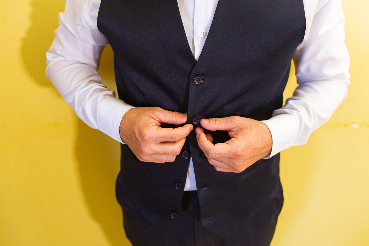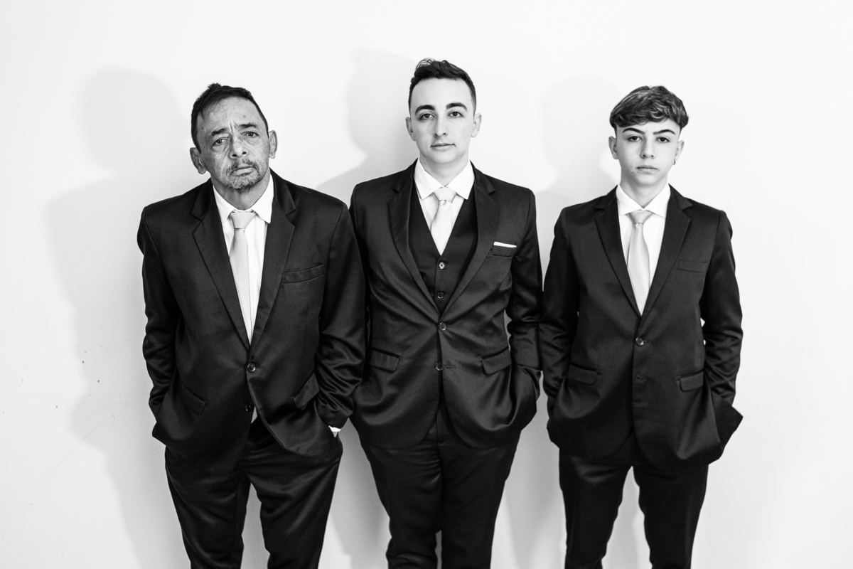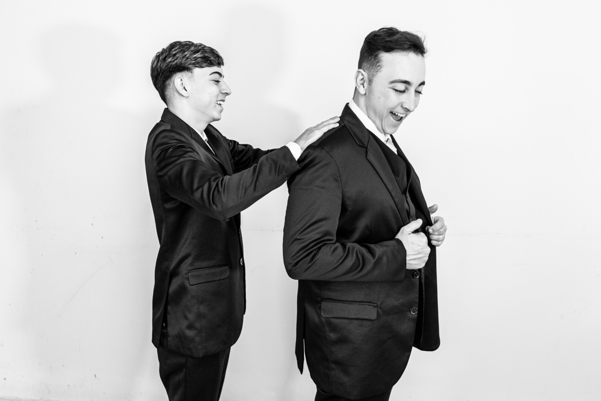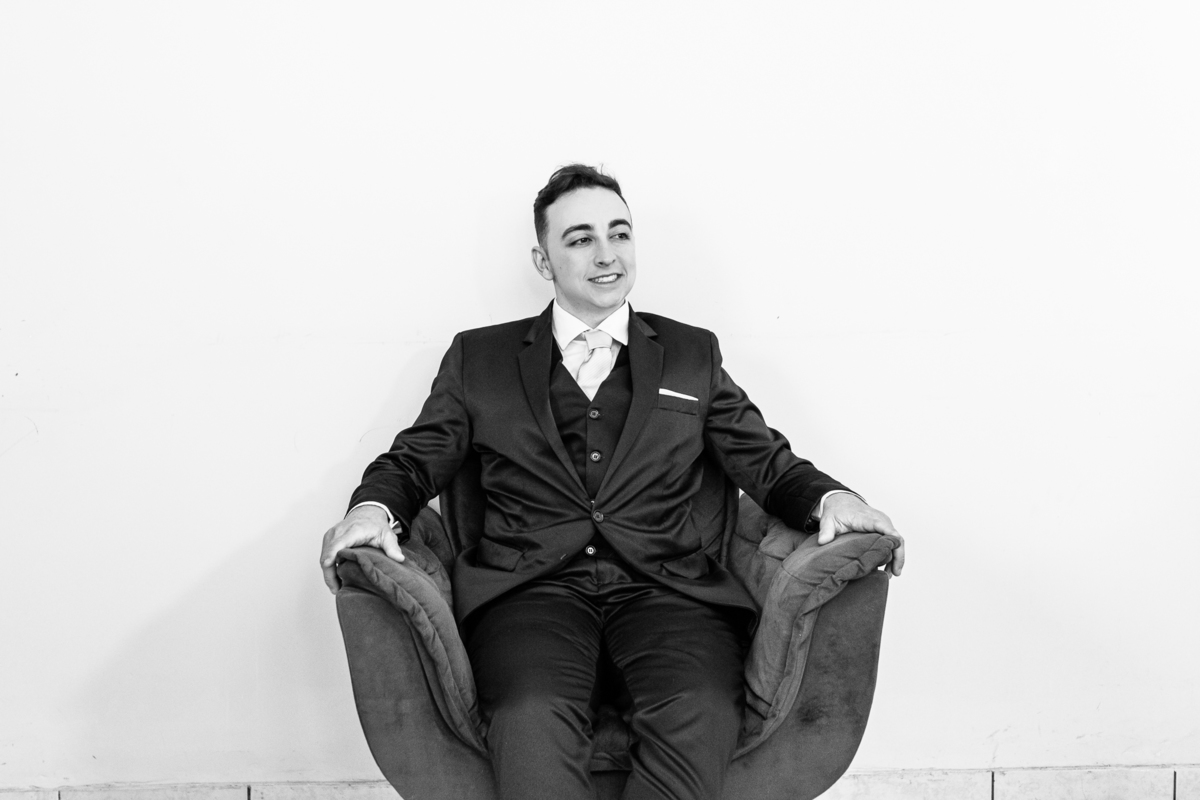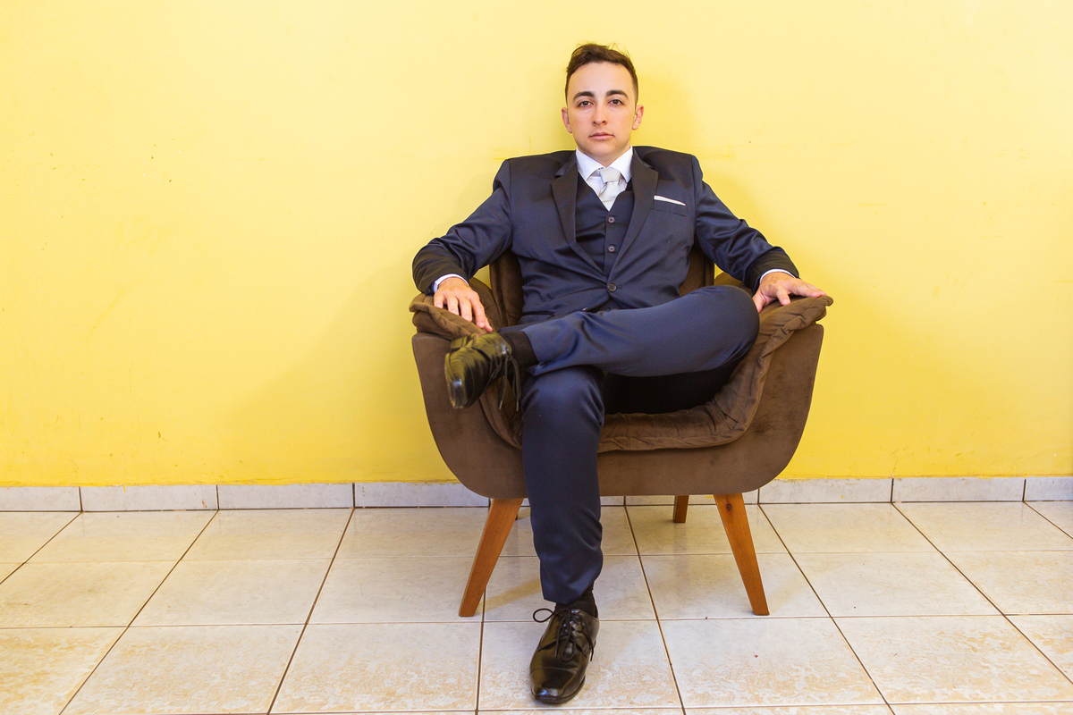 Enquanto finalizava sua produção, a sua mãe a acompanhava quietinha no canto, tentando não demonstrar muito nervosismo nem ansiedade, mas por dentro eu sabia que seu coração estava a mil. Os olhares diziam isso. A avó da noiva e a sua sogra também estavam acompanhando a noiva em seu dia. Enquanto isso, na casa do noivo, os preparativos também estavam à mil. Alexandre contou com a participação de seu pai e seu irmão para lhe ajudar. Vestiu seu traje e ficou pronto em questão de minutos. Fizemos as fotos e ele logo queria descer para fazer a tão sonhada foto do momento "First Touch". Ele estava preocupado com o tempo e sobre o casamento atrasar, mas tudo deu certinho.