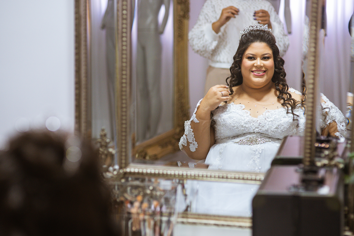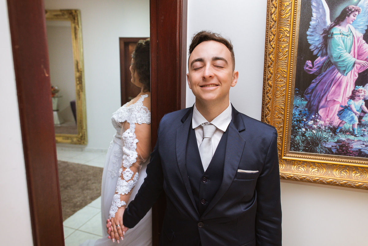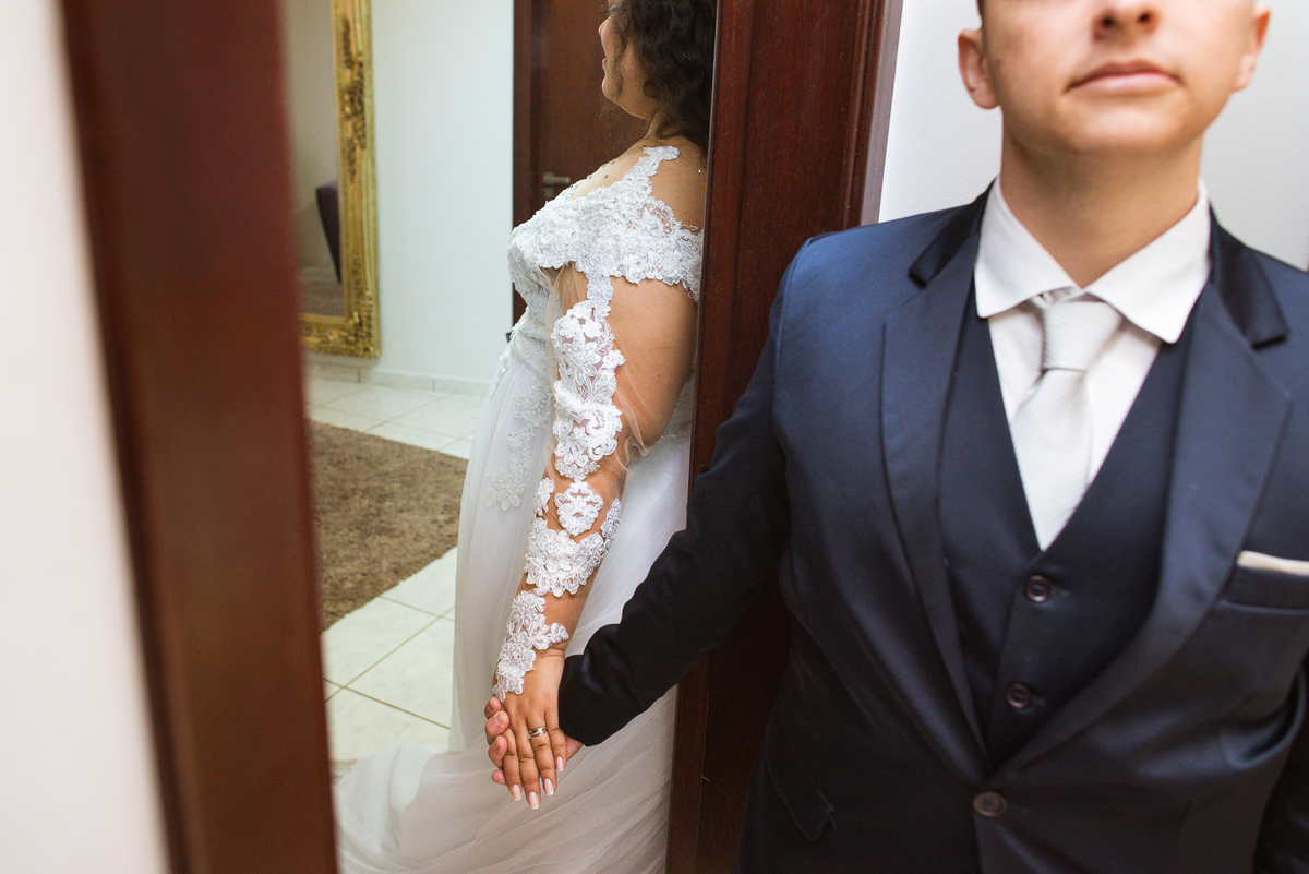 Enquanto eles desciam, a noiva já foi colocar o vestido. Poucos minutos depois, Alexandre chegou. A noiva estava pronta, ajustando os últimos detalhes quando preparamos os dois para a foto esperada. Posicionei os dois noivinhos de costas para a parede, ambos com muito medo de virem um ao outro, mas tudo foi perfeitinho. Pedi ao noivo que virasse o rosto para um lado, e disse que abriria a porta e que sua noiva estaria ali, portanto não poderia mais virar. Ele cumpriu o prometido, fechou os olhos e virou. Ao abrir a porta, Géssiley estava lá também de costas. Ambos deram as mãos em seu primeiro toque, com a emoção à flor da pele. Os dois com seus sorrisos contidos e ao mesmo tempo incontidos, se tocavam como na primeira vez em que se encontraram. Foi um momento inesquecível e eternizado no coração dos dois e nas fotos que virão logo abaixo.