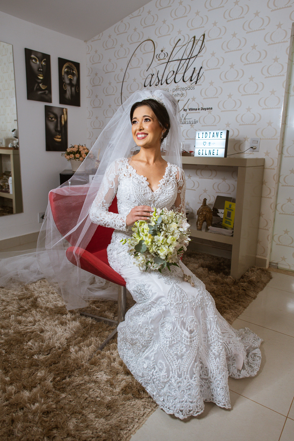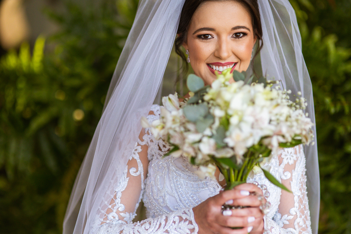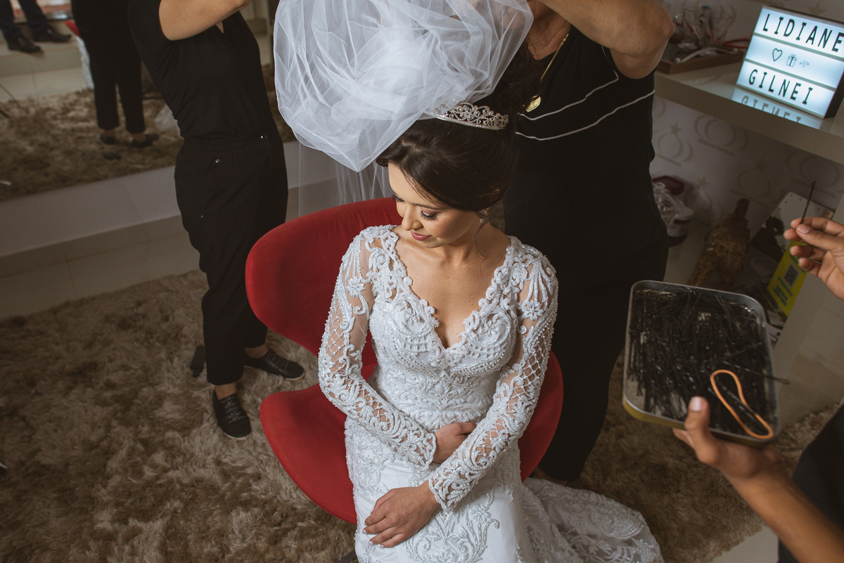 Enquanto o noivo terminava de se arrumar, Lidiane já colocava seu vestido, logo após ter finalizado seu belíssimo penteado. Antes, recebeu uma surpresa do noivo: Um belo buquê de rosas com um cartão escrito à mão que ela sequer conseguiu ler, devido a emoção e felicidade envolvidas naquele momento. Agora vestida de noiva, ela estava impecável. A produção estava maravilhosa, com uma make leve conforme ela solicitou. Os acessórios e o véu foram colocados e enfim ela estava prontinha para também ir para a Igreja. A capela escolhida por eles foi a de São José, uma belíssima estrutura abençoada por Deus naquele local. Finalizamos o making of e fomos quase juntos para lá.