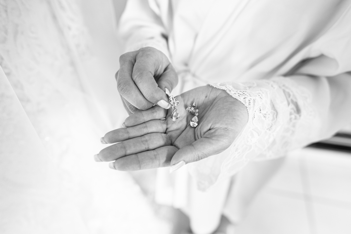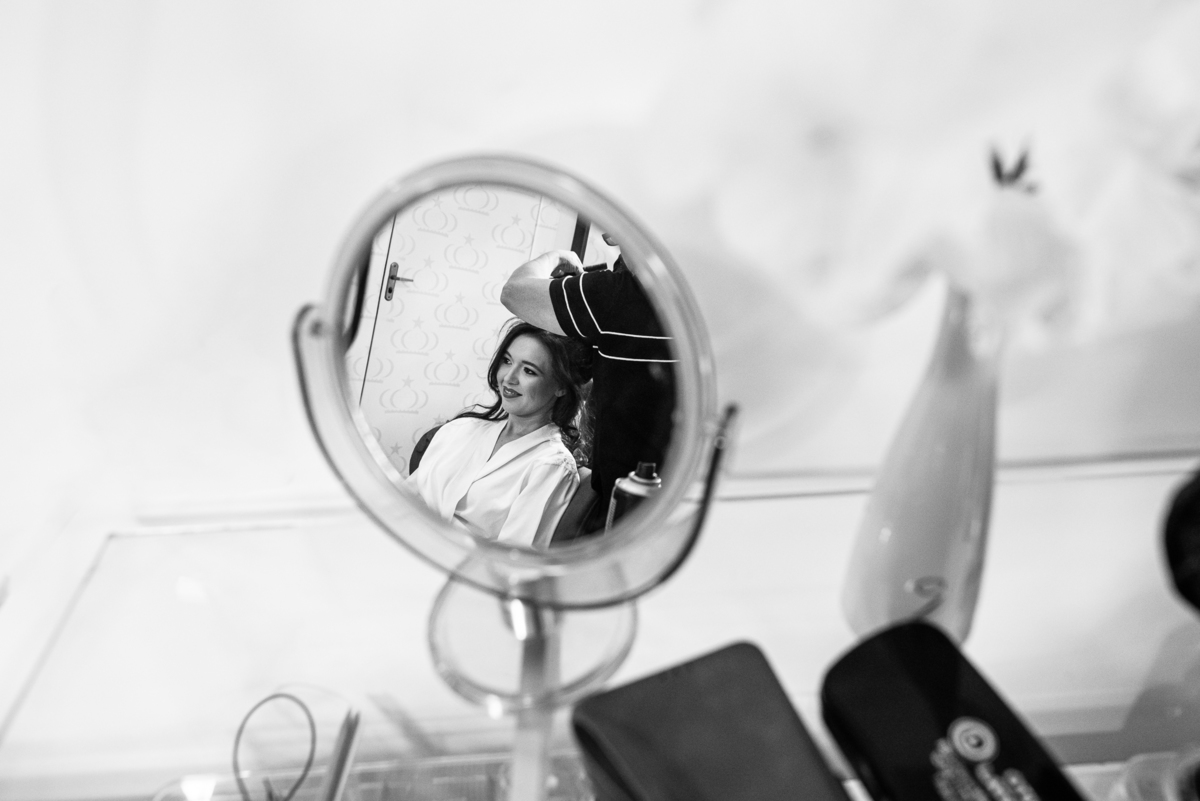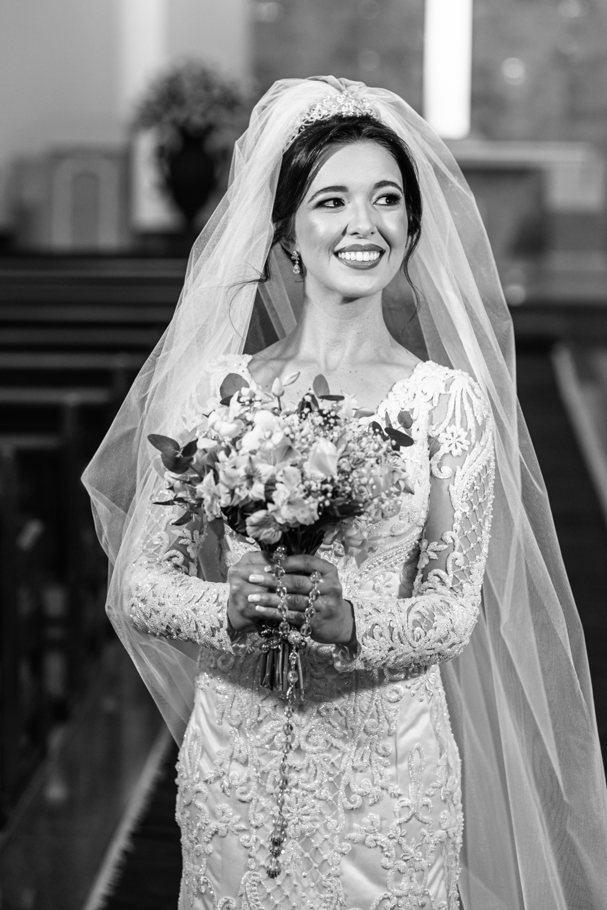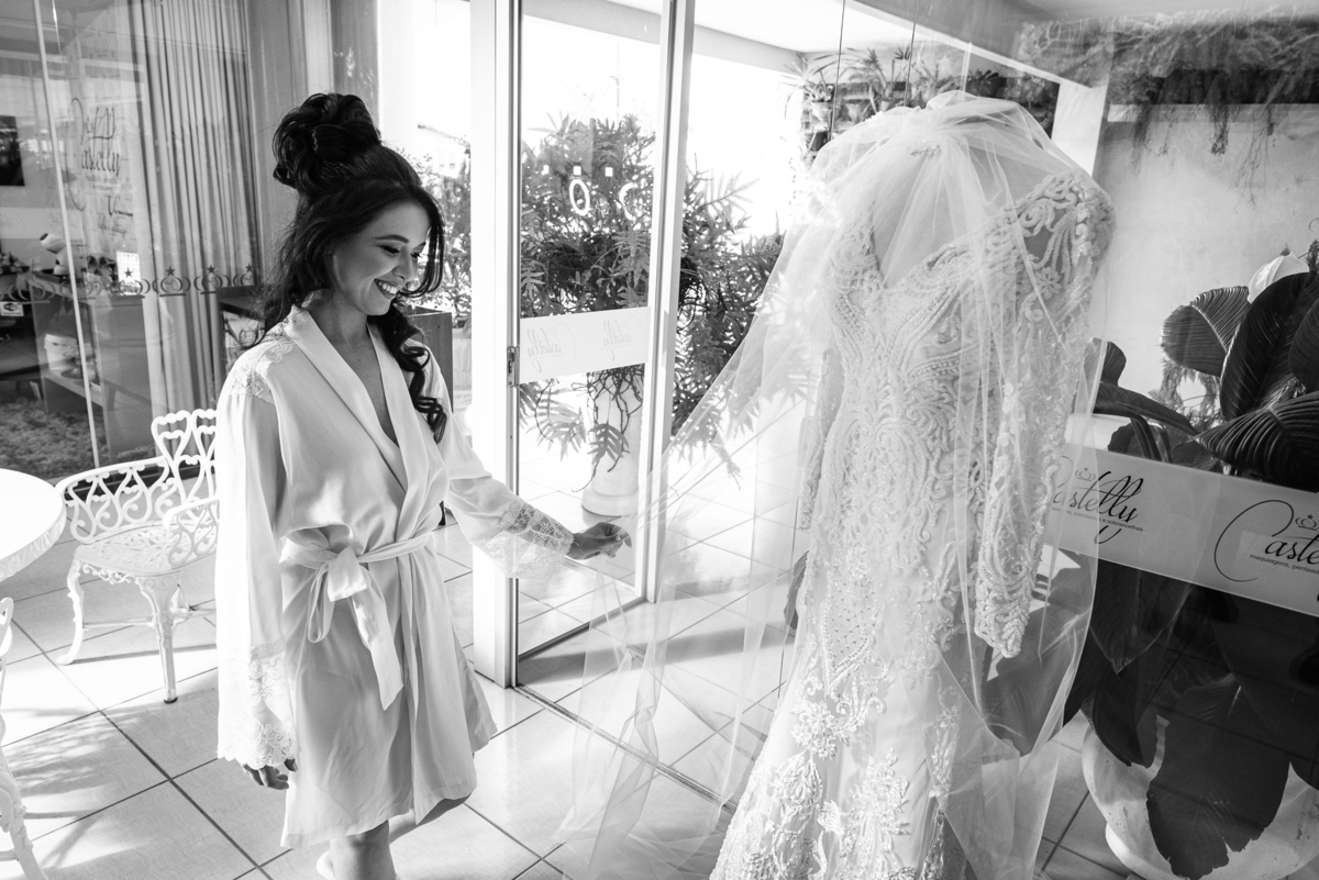 Enquanto o noivo terminava de se arrumar, Lidiane já colocava seu vestido, logo após ter finalizado seu belíssimo penteado. Antes, recebeu uma surpresa do noivo: Um belo buquê de rosas com um cartão escrito à mão que ela sequer conseguiu ler, devido a emoção e felicidade envolvidas naquele momento. Agora vestida de noiva, ela estava impecável. A produção estava maravilhosa, com uma make leve conforme ela solicitou. Os acessórios e o véu foram colocados e enfim ela estava prontinha para também ir para a Igreja. A capela escolhida por eles foi a de São José, uma belíssima estrutura abençoada por Deus naquele local. Finalizamos o making of e fomos quase juntos para lá.