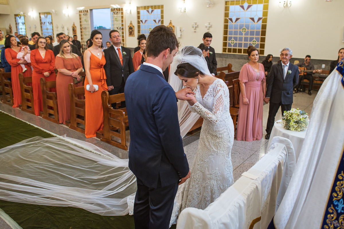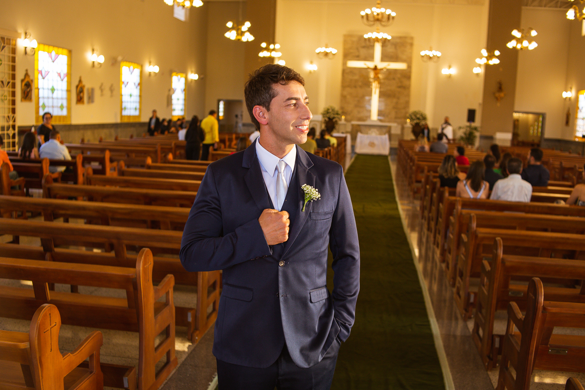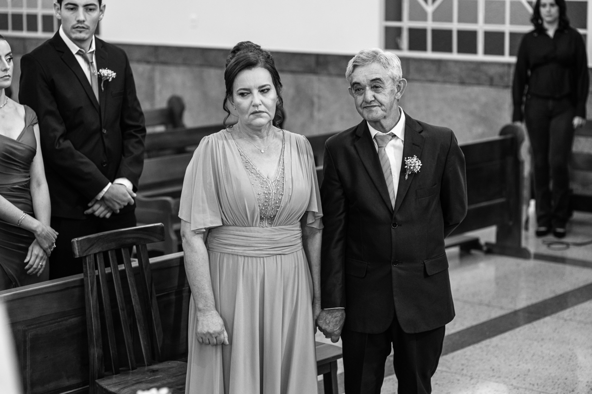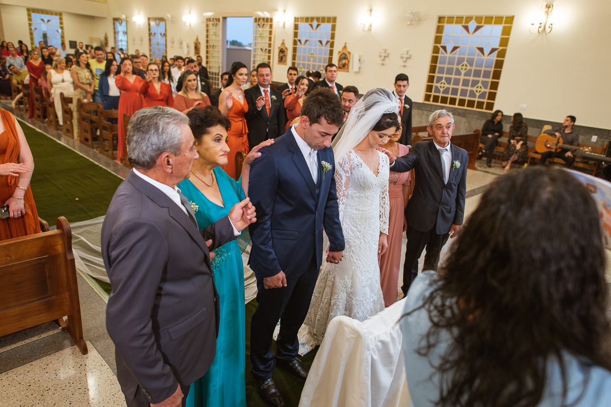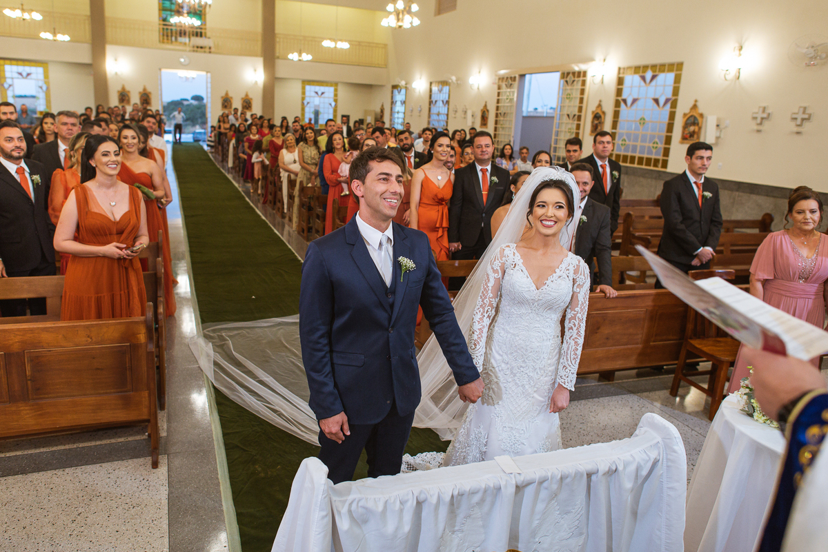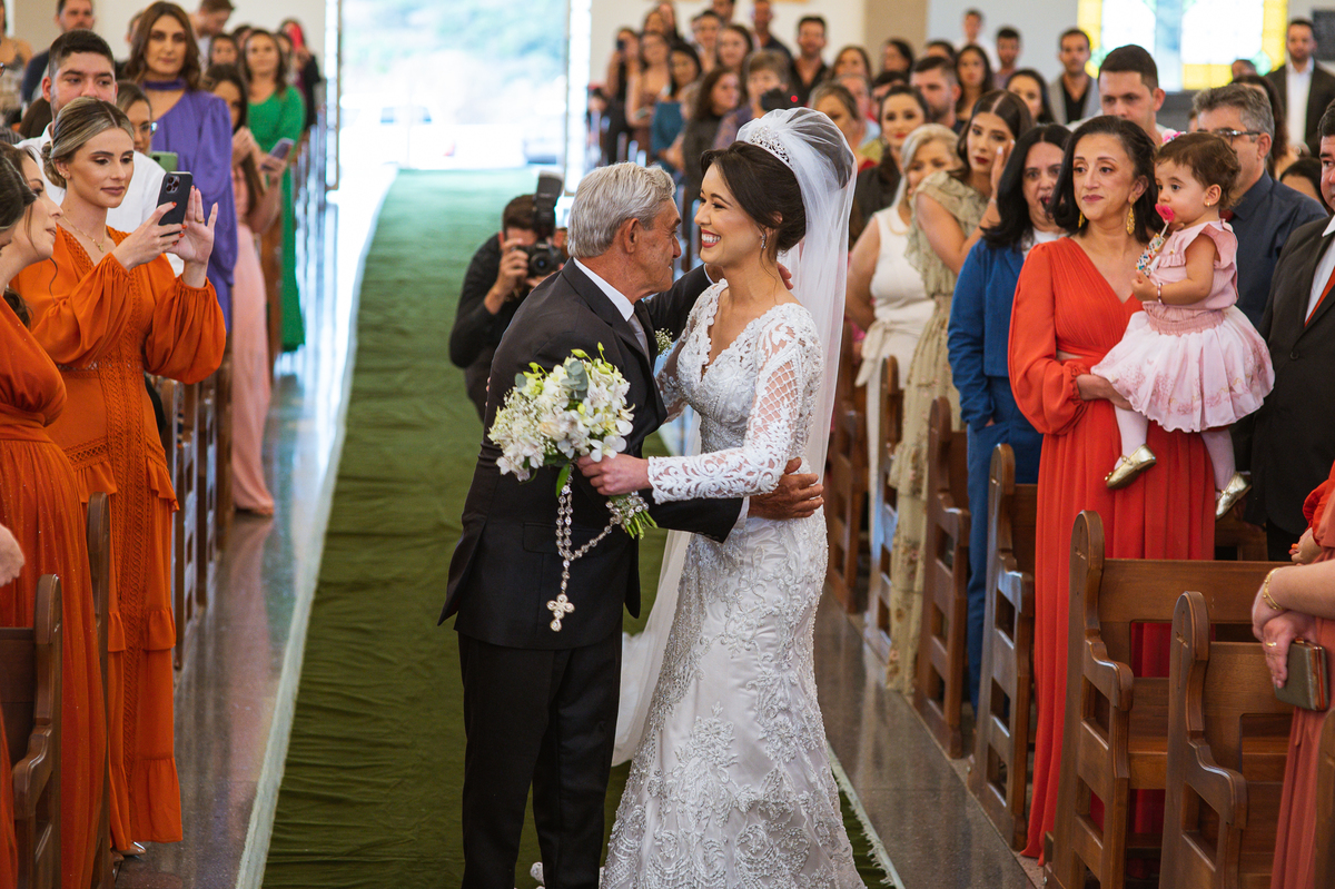 Agora, com as portas da Igreja já fechadas, Lidiane deu as mãos para seu pai e eles foram juntos para a última caminhada antes do sim. A emoção daquele momento era palpável. Apenas as portas separavam a união dos dois. Enfim, o momento mais esperado chegou. A música escolhida por ela começou a ser tocada e as portas se abriram, revelando toda a beleza da noiva. Com suspiros, sorrisos e também lágrimas de emoção, a entrada da noiva acontecia. Com passos de princesa, Lidiane caminhava cuidadosamente e muito sorridente. Gilnei despediu-se de seus pais e caminhou rumo ao encontro final com sua noiva. Ele despediu-se do seu sogro com um forte abraço e recebeu a mão de sua amada com um beijo respeitoso. Após isso, beijou também a testa de sua noiva e ambos caminharam rumo à bênção final.