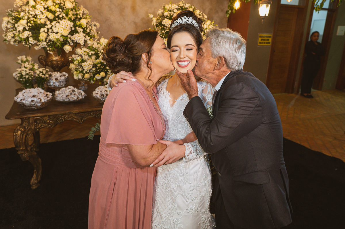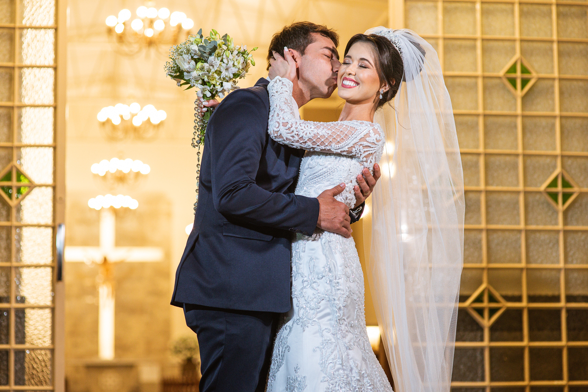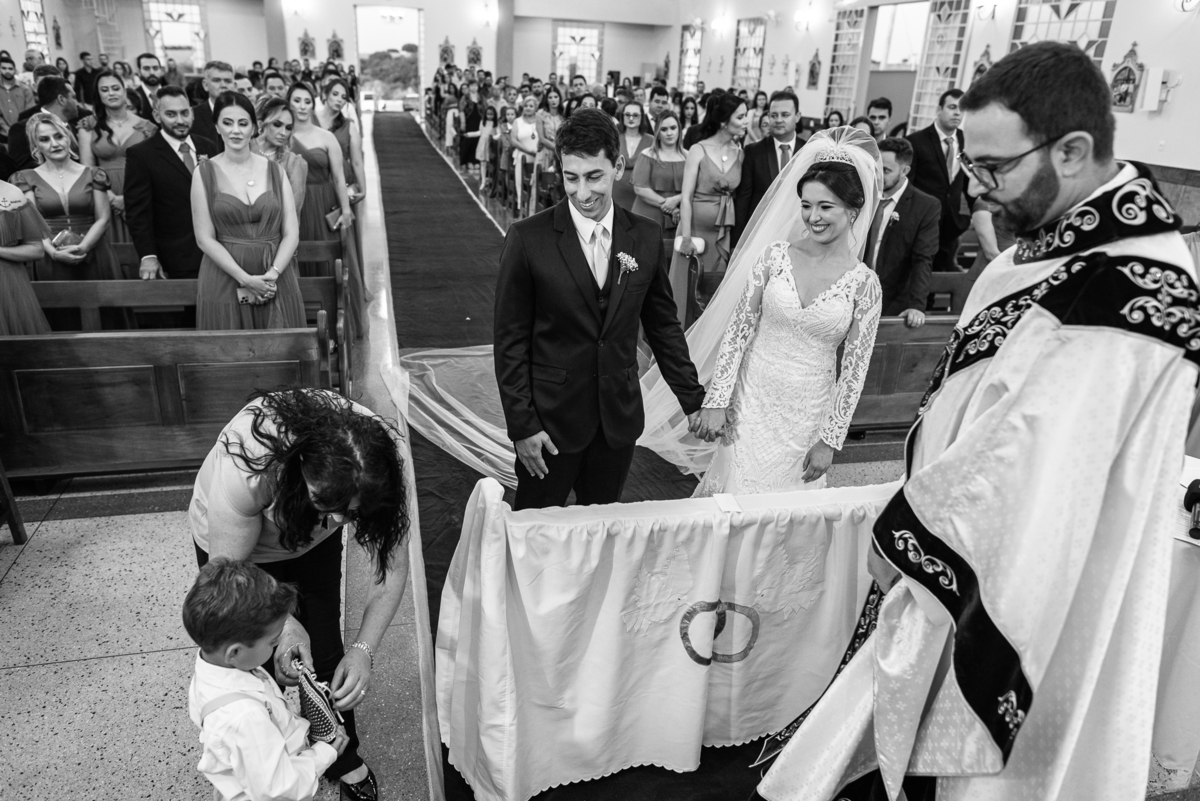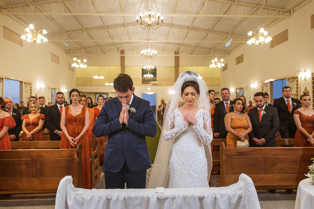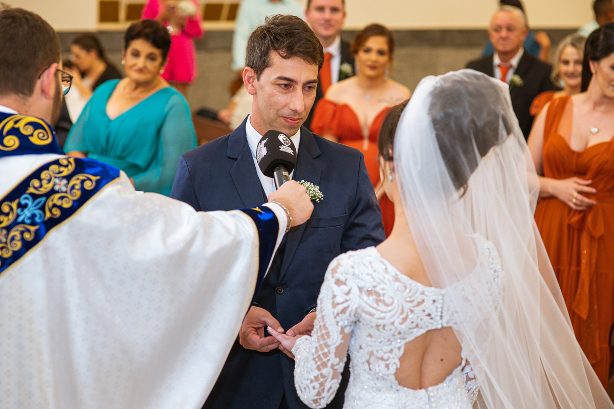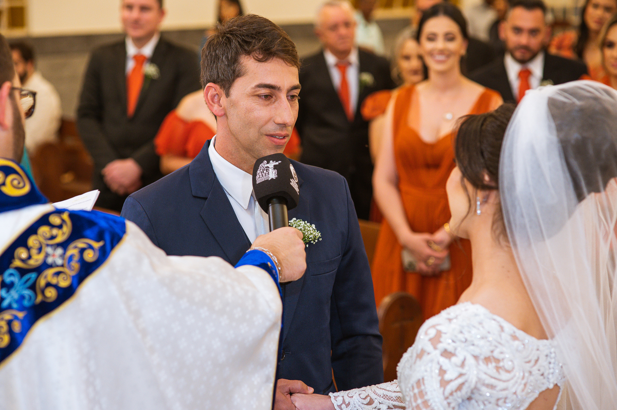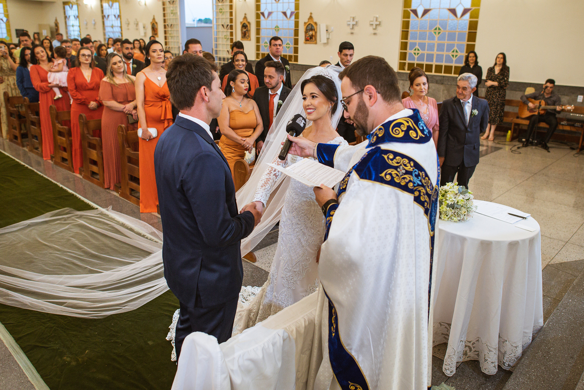 Agora, com as portas da Igreja já fechadas, Lidiane deu as mãos para seu pai e eles foram juntos para a última caminhada antes do sim. A emoção daquele momento era palpável. Apenas as portas separavam a união dos dois. Enfim, o momento mais esperado chegou. A música escolhida por ela começou a ser tocada e as portas se abriram, revelando toda a beleza da noiva. Com suspiros, sorrisos e também lágrimas de emoção, a entrada da noiva acontecia. Com passos de princesa, Lidiane caminhava cuidadosamente e muito sorridente. Gilnei despediu-se de seus pais e caminhou rumo ao encontro final com sua noiva. Ele despediu-se do seu sogro com um forte abraço e recebeu a mão de sua amada com um beijo respeitoso. Após isso, beijou também a testa de sua noiva e ambos caminharam rumo à bênção final.