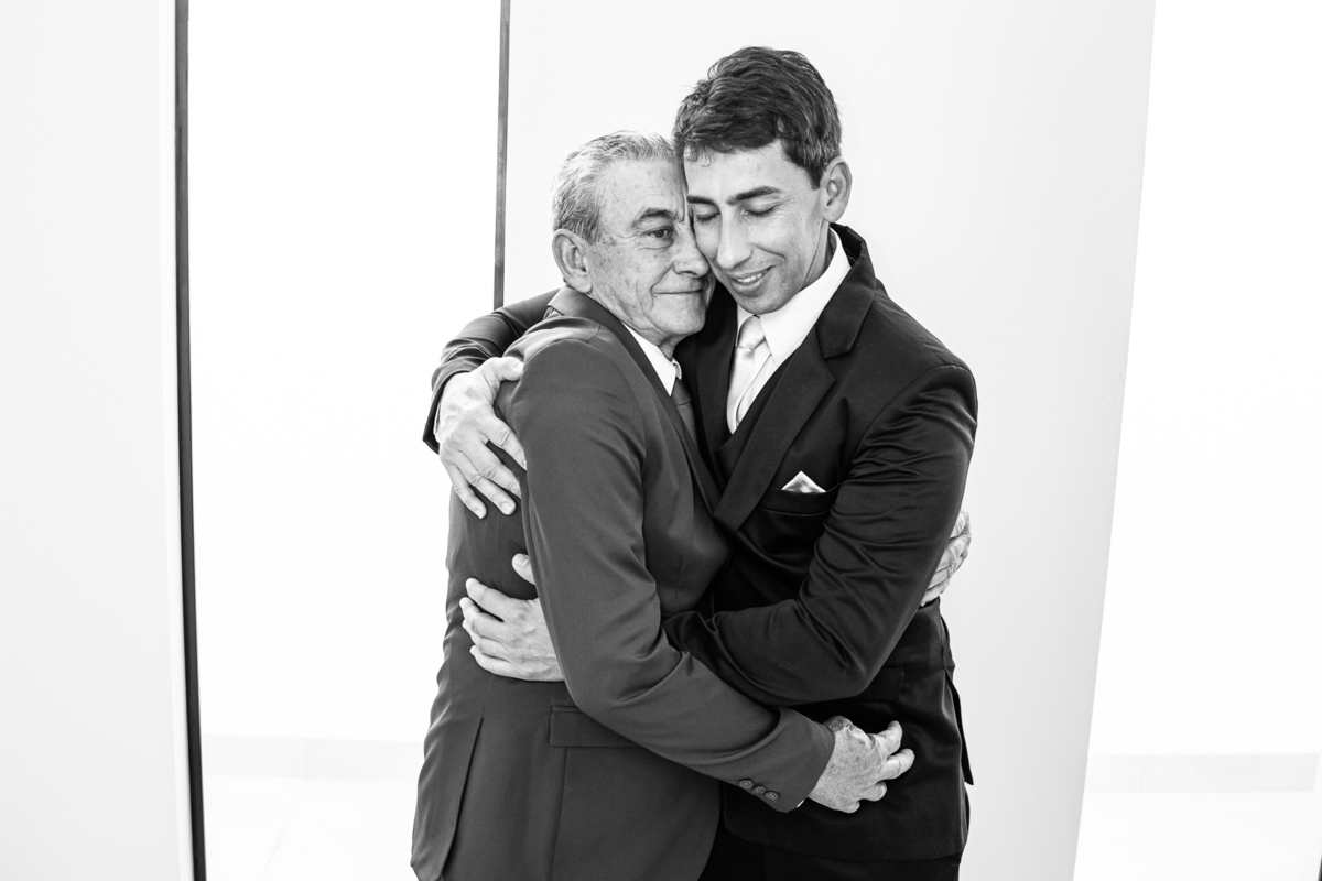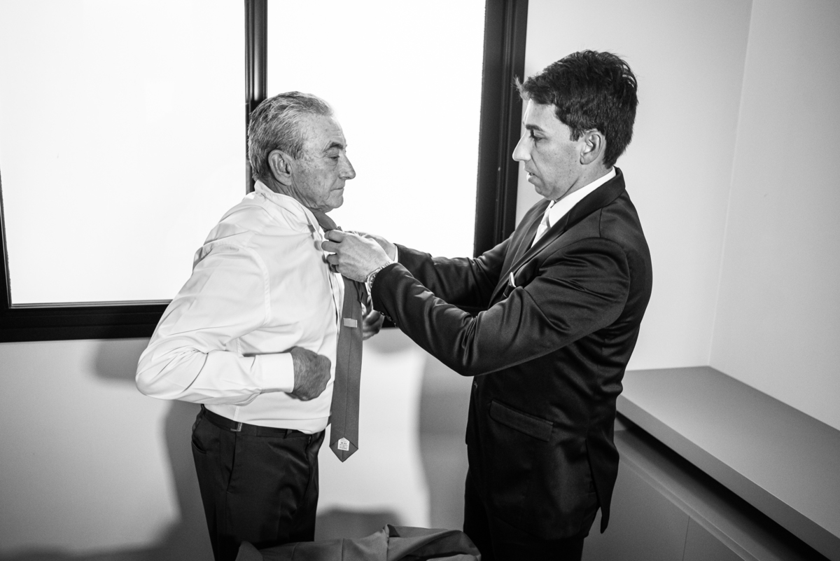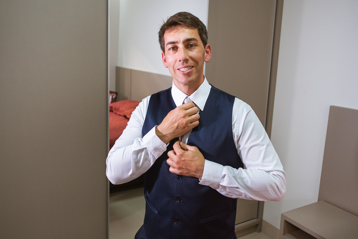 O vestido escolhido por ela é assinado pela Hermanas Noivas e Festas de Patos de Minas. Um vestido maravilhoso e que abrilhantava o salão com toda sua exuberância. Enquanto a make ficava pronta, fotografei os detalhes do vestido e também o sapato que a noiva escolheu. A plaquinha com o nome dos noivos estava lá anunciando para todos que o grande dia deles chegou. Do outro lado da cidade estava Gilnei, com sua família em casa se arrumando também para o seu sim eterno. Com o auxílio de seu pai, ele se trajou com o mais belo terno, calçou seu sapato, ajustou a gravata e ficou prontinho para ir para a celebração.