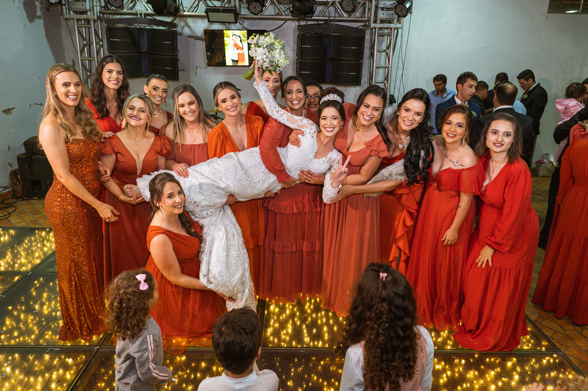 O local escolhido por eles foi a Chácara Resende, que é tradicional para comemorar os casamentos que acontecem na cidade. Um lugar muito bonito e aconchegante. A decoração chamou a atenção de todos que passavam por lá e ela ficou a cargo do Tuca Decorações e eles brilharam com todo capricho. A mesa do bolo estava belíssima. Lidiane e Gilnei foram anunciados para entrar e os padrinhos já os esperavam na pista de dança. Com muita festa, eles foram recebidos, brindaram com os padrinhos e comemoraram muito a realização desse grande sonho em forma de festa. Agradeceram a presença dos convidados e fizemos as fotos no bolo. Os recém-casados receberam os cumprimentos e curtiram a noite, dançando, bebendo e festejando com seus convidados.