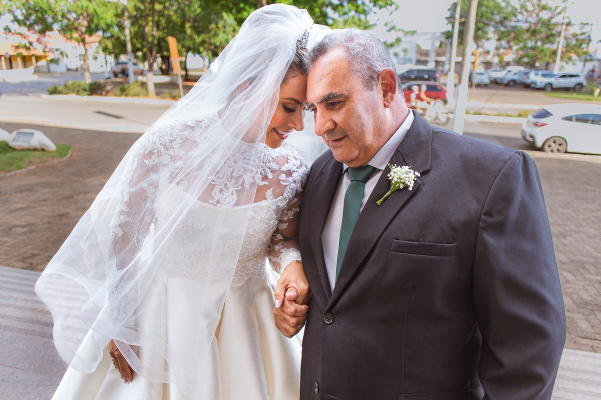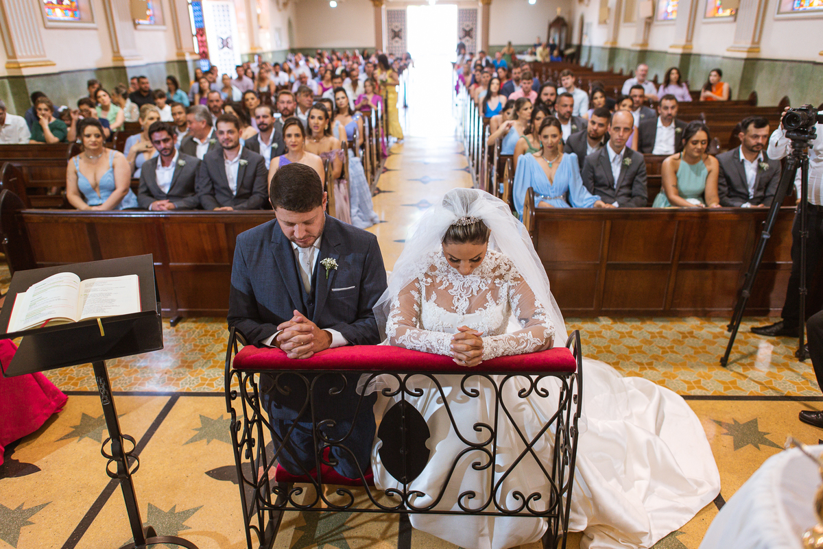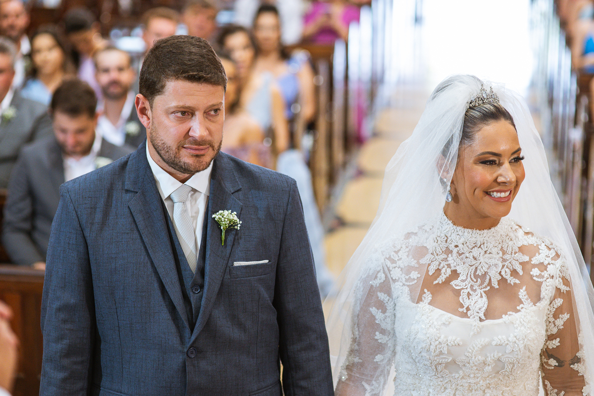 Lucas se despediu de sua mãe com um carinhoso abraço e também fez questão de abraçar sua sogra e sogro quando eles entraram. Por fim, agora só faltava mais um encontro. Aquele momento parece passar tão lentamente que é possível sentir a respiração forte de todos os convidados. Os olhos de todos brilhavam, Bianca estava linda e aguardava somente alguns passos que a separavam de seu noivo. Lucas chegou, despediu-se do seu sogro, recebeu dele a mão de sua noiva e beijou respeitosamente sua futura esposa. Agora juntos, eles caminharam para receber a bênção final sobre a sua união. No altar, o padre já os aguardava e arrancou sorrisos muito sinceros com suas palavras. Sua homilia foi linda e com certeza será inesquecível para os noivos. As alianças foram recebidas, ungidas e trocadas um pelo outro. O padre os declarou casados e pediu para que seus pais os abençoasse também. Assim, após essa cerimônia linda, fizemos nossas tradicionais fotografias dos padrinhos e familiares.