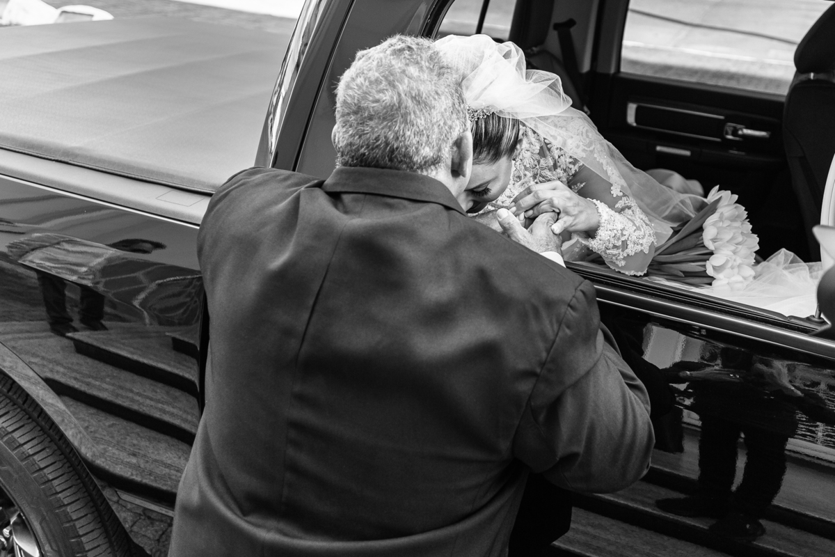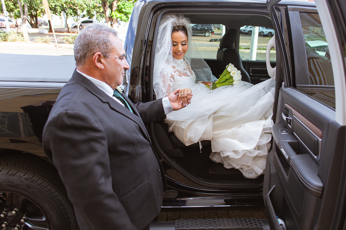Quando a porta da sala da se abriu, surgiu uma noiva indescritível. O vestido repleto de detalhes sutis e com um caimento perfeito no corpo dela enchia os olhos de todos que a viam. Além do vestido ser lindo, um acessório especial só para a sessão de fotos estava lá também. Posteriormente Bianca o colocou também e fizemos a sessão com ele. Depois de fazermos diversos retratos lindíssimos daquele momento, perfume passado, era hora de partir. Como os dois são brutos e sistemáticos (Se é que me entendem os cowboys) uma grandiosa Dodge Ram veio buscar a noiva. Uma super camionete para uma super noiva sorridente e feliz. Na porta da Igreja dos Capuchinhos, paramos para uma pequena sessão de fotos dela com o veículo. Assim, era chegada a hora de iniciarmos a cerimônia.