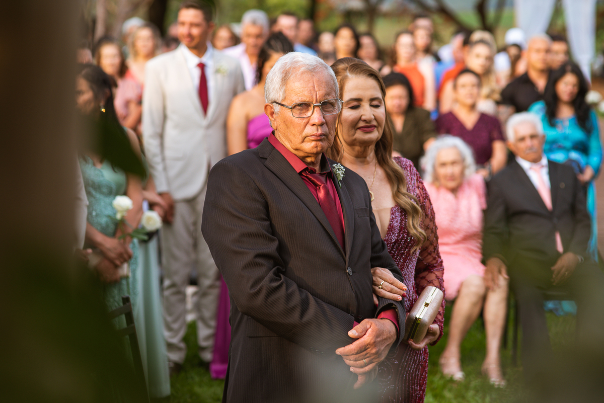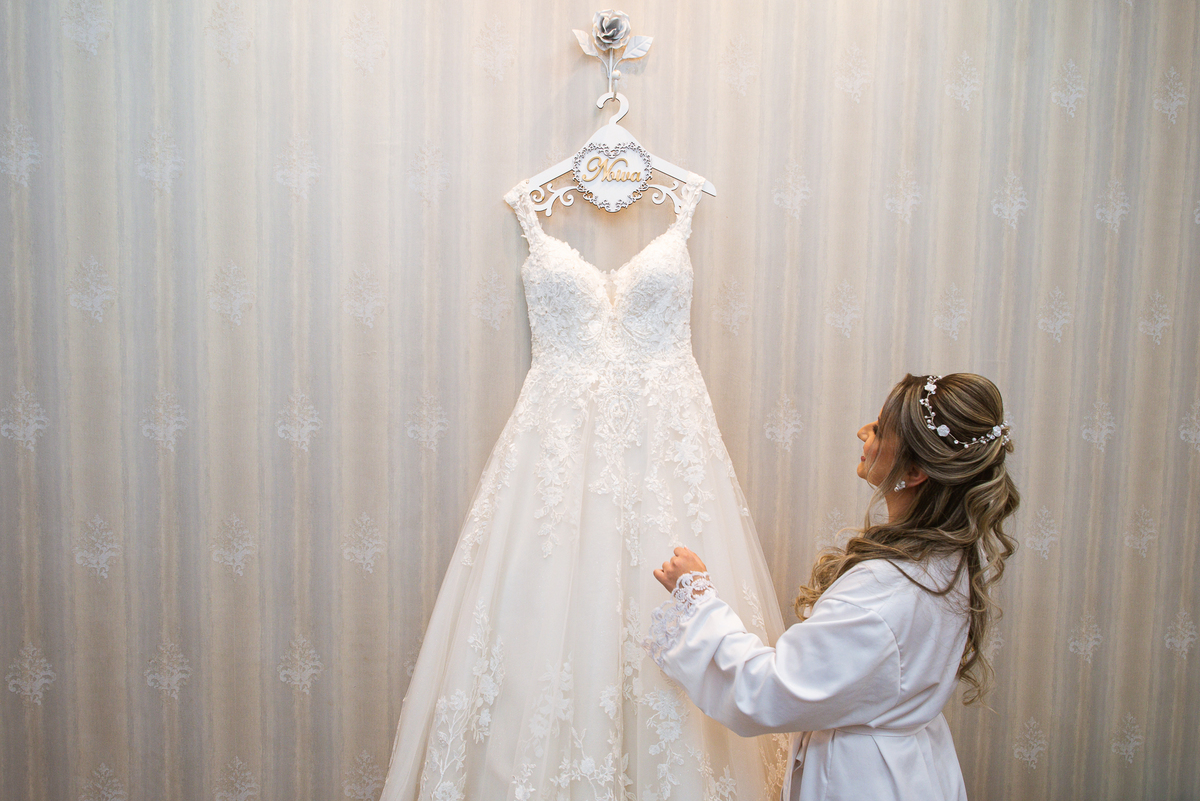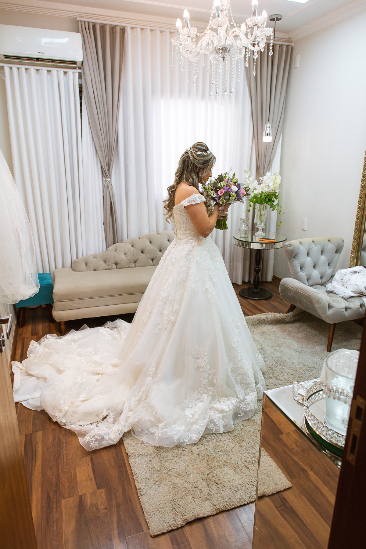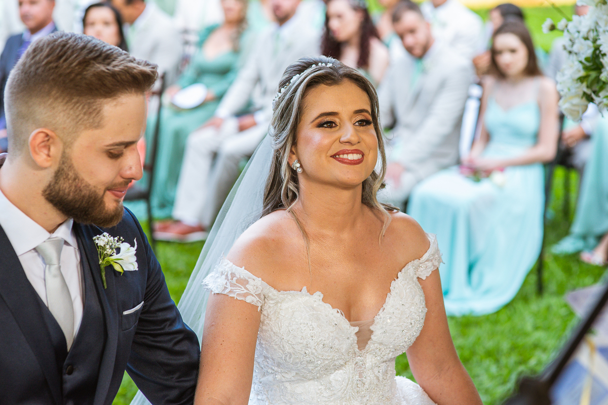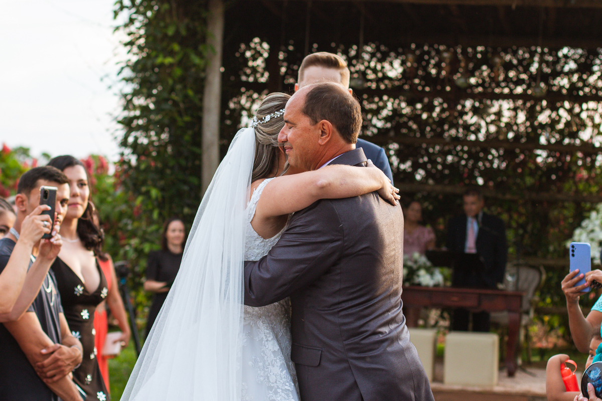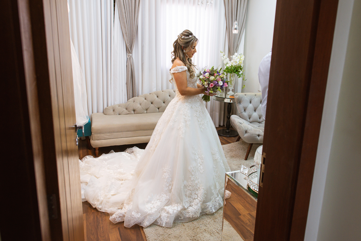 Lívio já estava pronto, fez todas as fotos que desejava e partiu para o local da cerimônia. Por falar nele, os noivos escolheram casar no espaço Casa de Família, que é um restaurante com um local especial preparado para casamentos também. Elisama realizava os últimos ajustes no penteado e já estava prestes a colocar seu vestido. Poucos minutos depois, ela surgiu maravilhosa e já com sua produção finalizada. Faltava apenas o véu que abrilhantaria ainda mais o vestido. Fizemos nossas fotos e partimos para a cerimônia. Fui bem rápido e cheguei antes da noiva. Lívio já estava lá, cumprimentando todos os convidados, abraçando os parentes e amigos e distribuindo seu sorriso para todos.