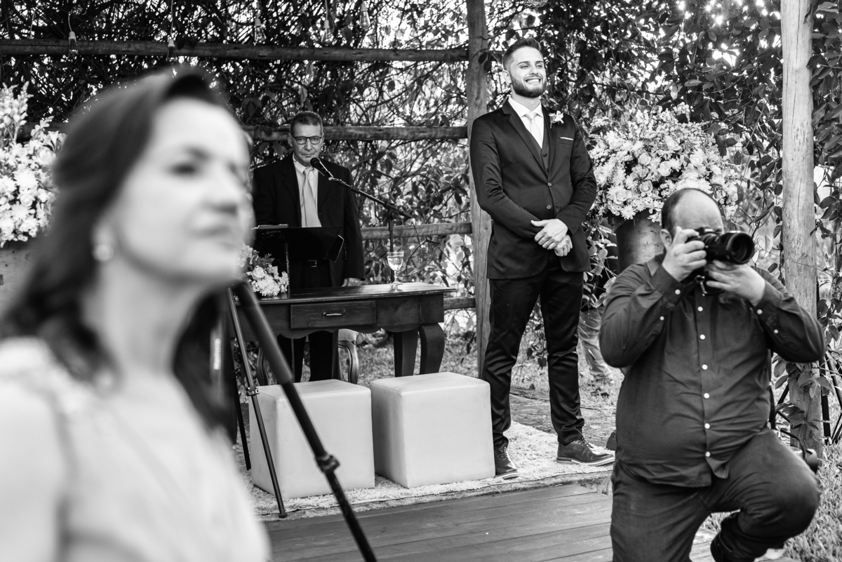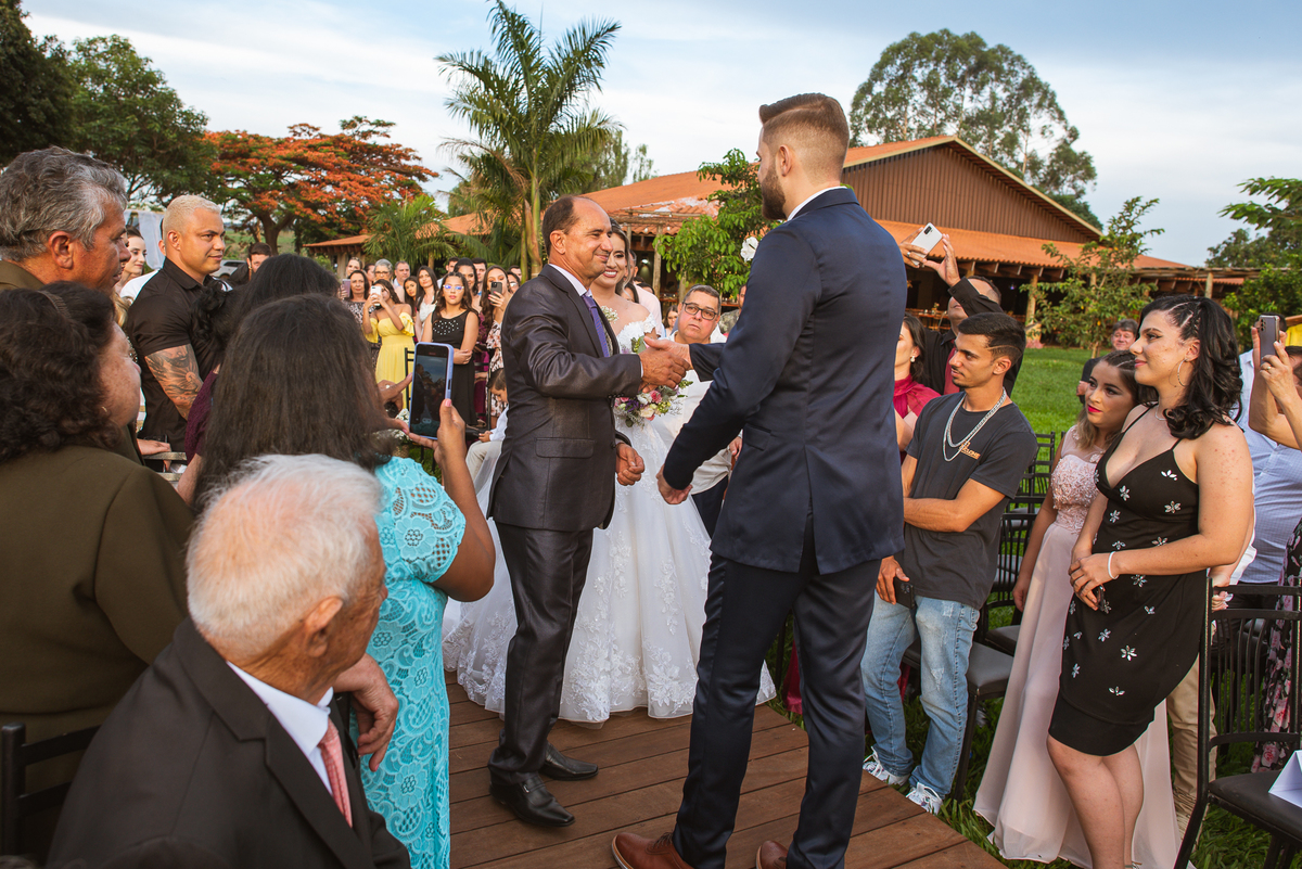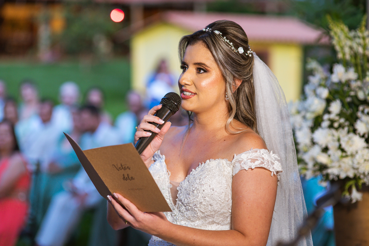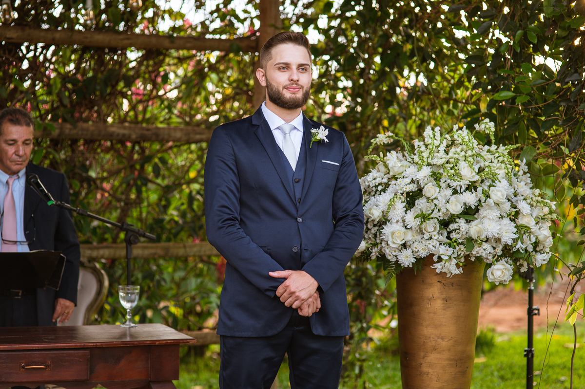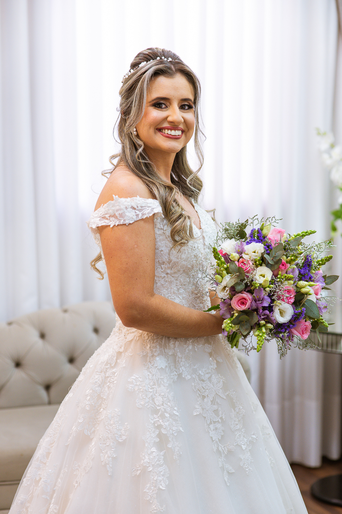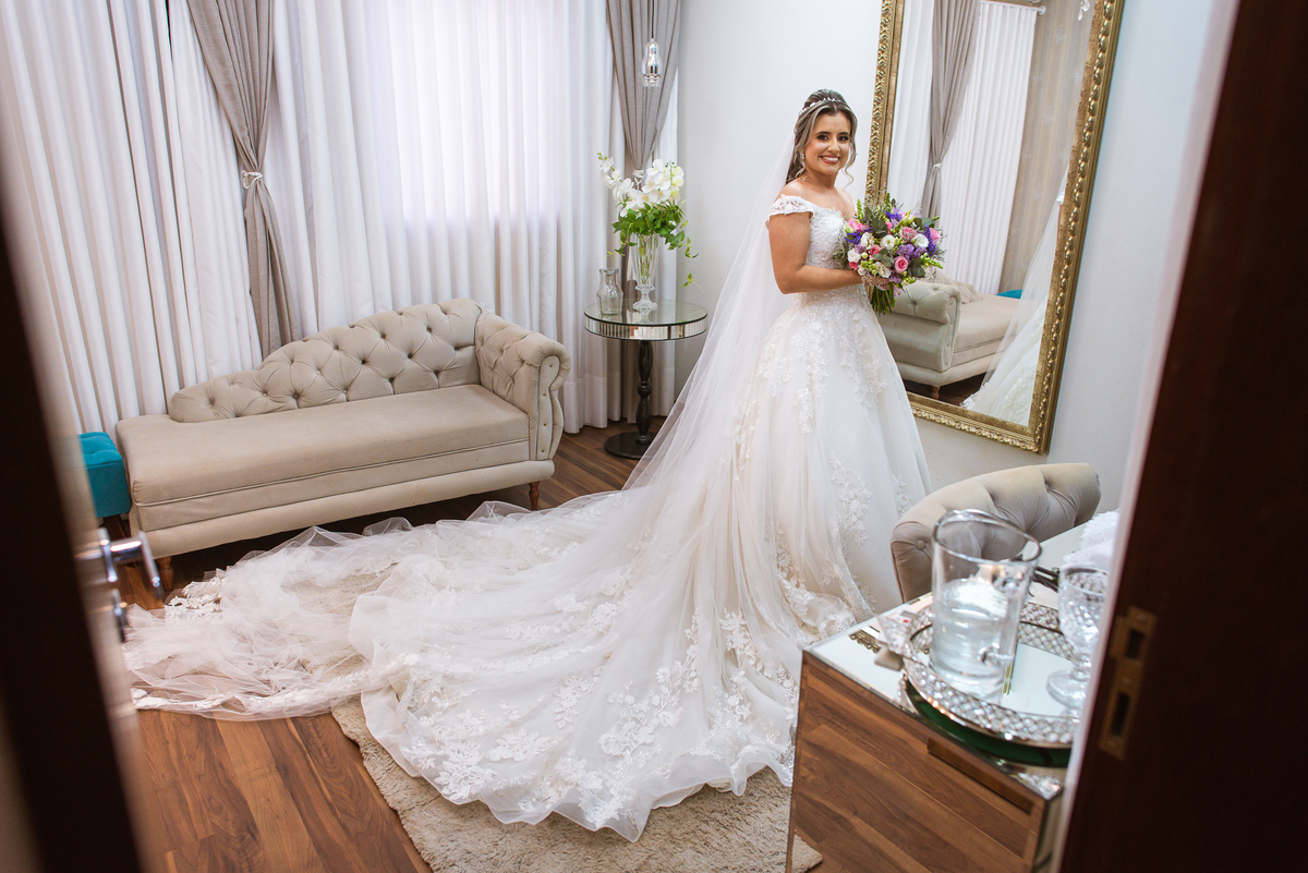 Lívio já estava pronto, fez todas as fotos que desejava e partiu para o local da cerimônia. Por falar nele, os noivos escolheram casar no espaço Casa de Família, que é um restaurante com um local especial preparado para casamentos também. Elisama realizava os últimos ajustes no penteado e já estava prestes a colocar seu vestido. Poucos minutos depois, ela surgiu maravilhosa e já com sua produção finalizada. Faltava apenas o véu que abrilhantaria ainda mais o vestido. Fizemos nossas fotos e partimos para a cerimônia. Fui bem rápido e cheguei antes da noiva. Lívio já estava lá, cumprimentando todos os convidados, abraçando os parentes e amigos e distribuindo seu sorriso para todos.