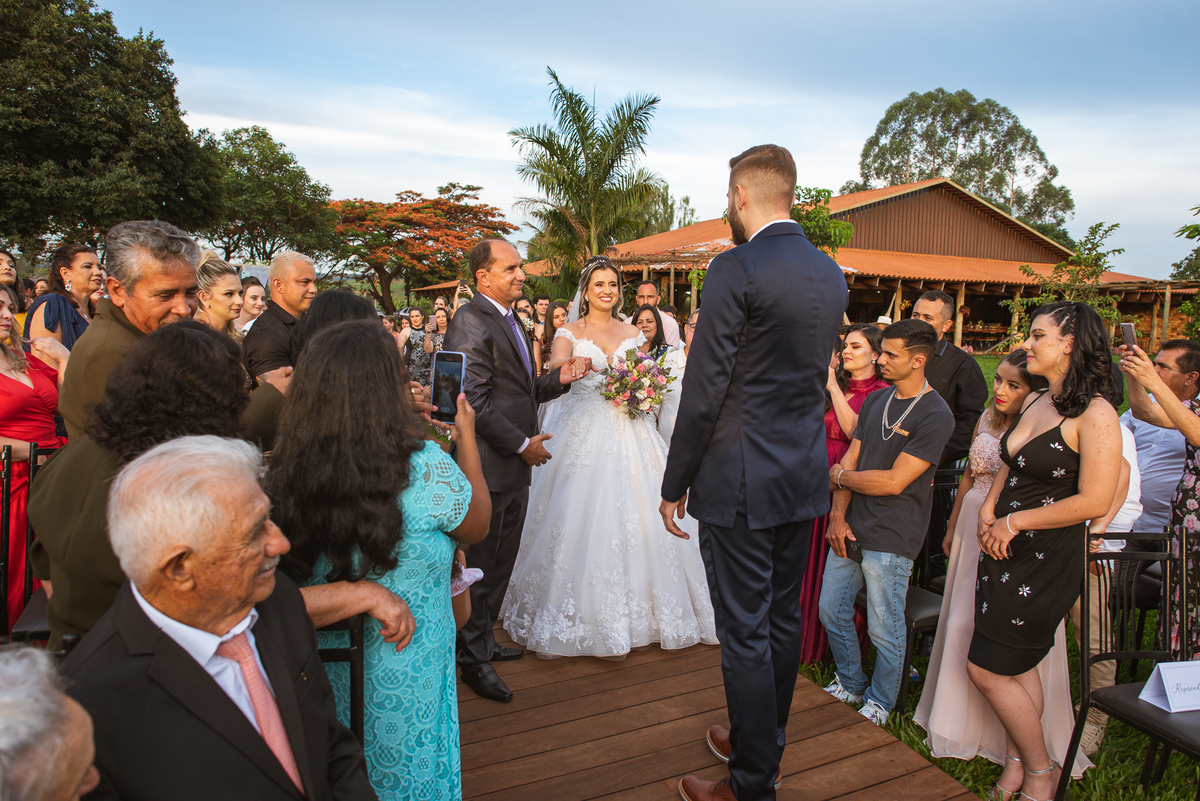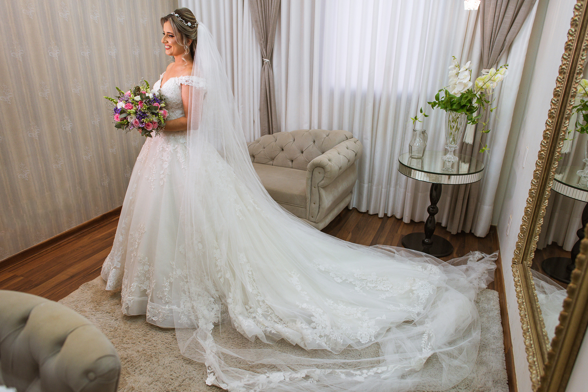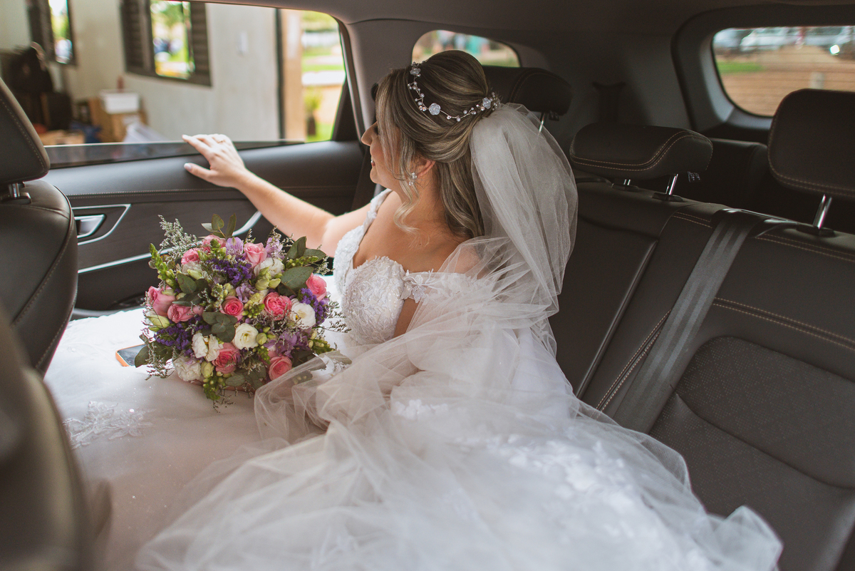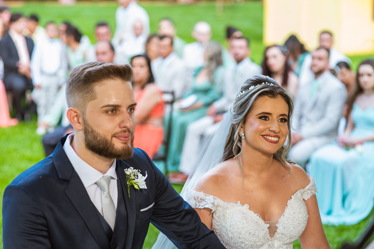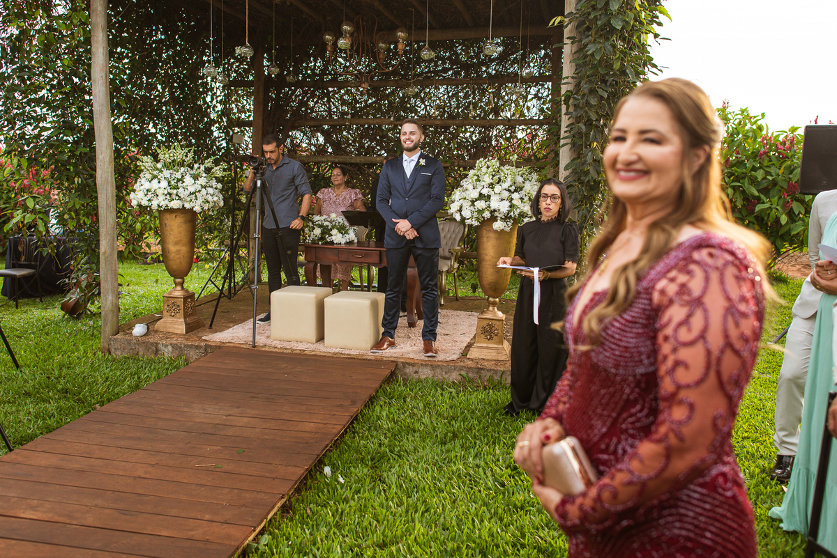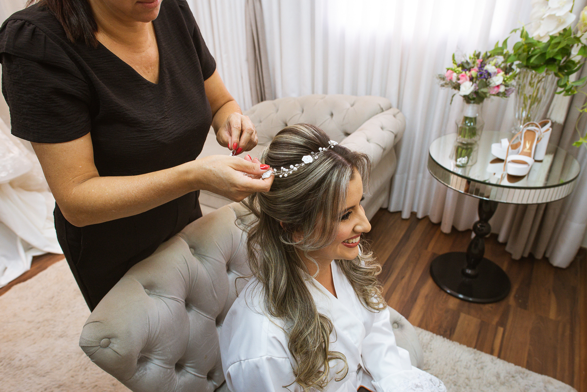 Lívio já estava pronto, fez todas as fotos que desejava e partiu para o local da cerimônia. Por falar nele, os noivos escolheram casar no espaço Casa de Família, que é um restaurante com um local especial preparado para casamentos também. Elisama realizava os últimos ajustes no penteado e já estava prestes a colocar seu vestido. Poucos minutos depois, ela surgiu maravilhosa e já com sua produção finalizada. Faltava apenas o véu que abrilhantaria ainda mais o vestido. Fizemos nossas fotos e partimos para a cerimônia. Fui bem rápido e cheguei antes da noiva. Lívio já estava lá, cumprimentando todos os convidados, abraçando os parentes e amigos e distribuindo seu sorriso para todos.