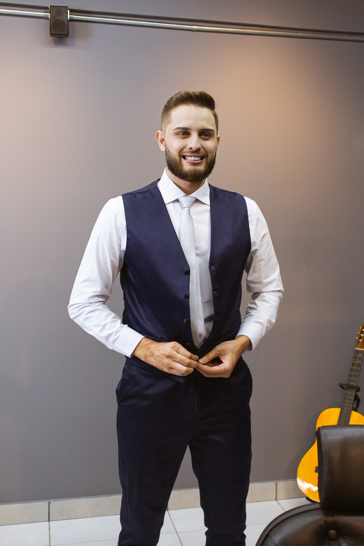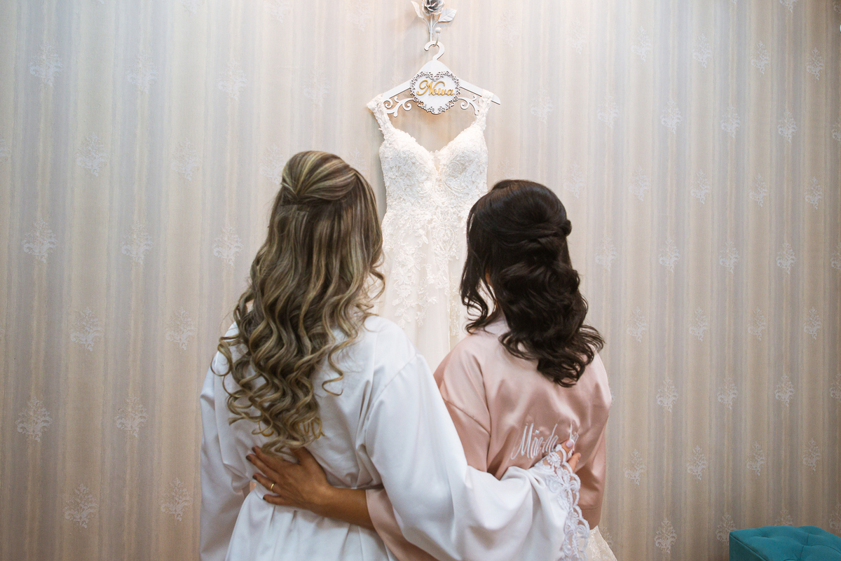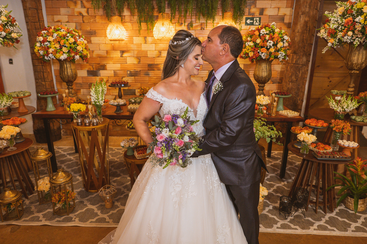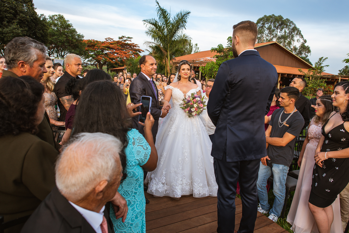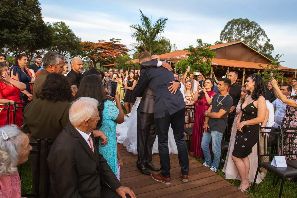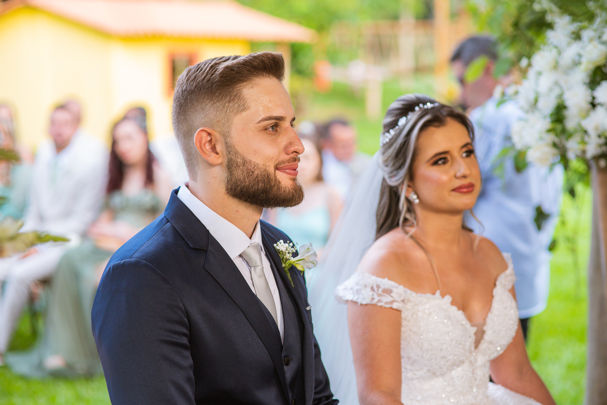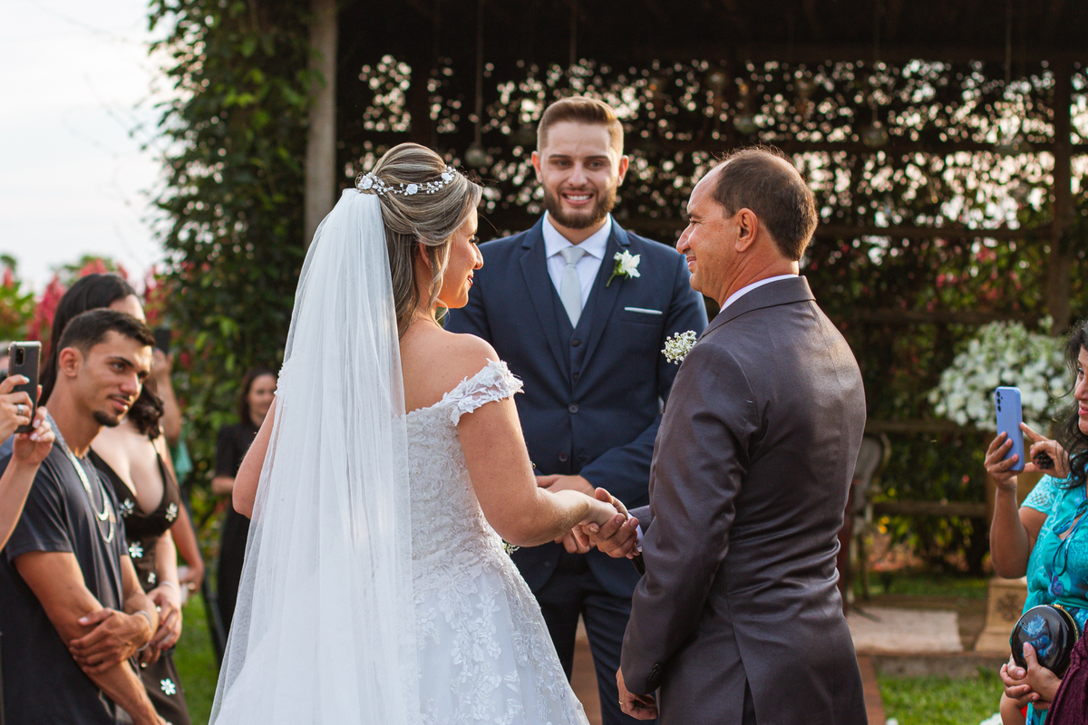 Lívio já estava pronto, fez todas as fotos que desejava e partiu para o local da cerimônia. Por falar nele, os noivos escolheram casar no espaço Casa de Família, que é um restaurante com um local especial preparado para casamentos também. Elisama realizava os últimos ajustes no penteado e já estava prestes a colocar seu vestido. Poucos minutos depois, ela surgiu maravilhosa e já com sua produção finalizada. Faltava apenas o véu que abrilhantaria ainda mais o vestido. Fizemos nossas fotos e partimos para a cerimônia. Fui bem rápido e cheguei antes da noiva. Lívio já estava lá, cumprimentando todos os convidados, abraçando os parentes e amigos e distribuindo seu sorriso para todos.
