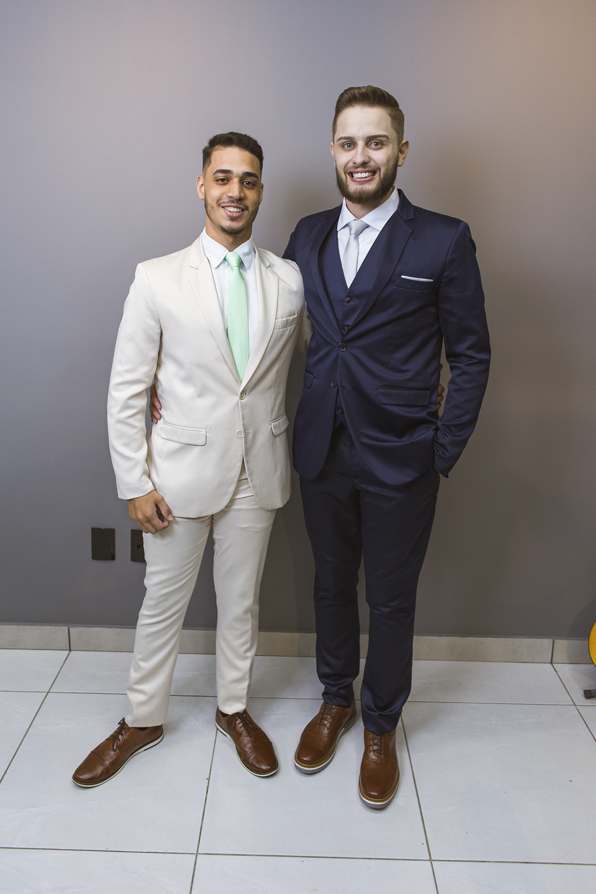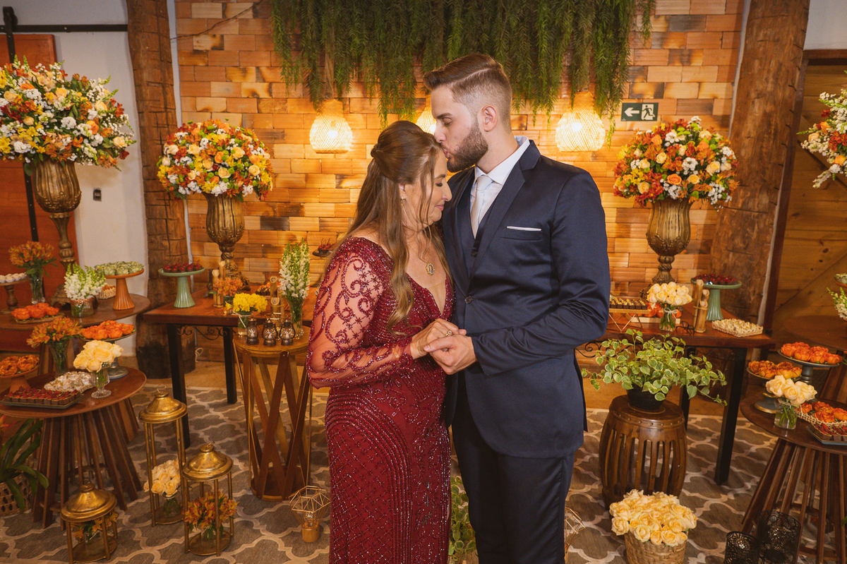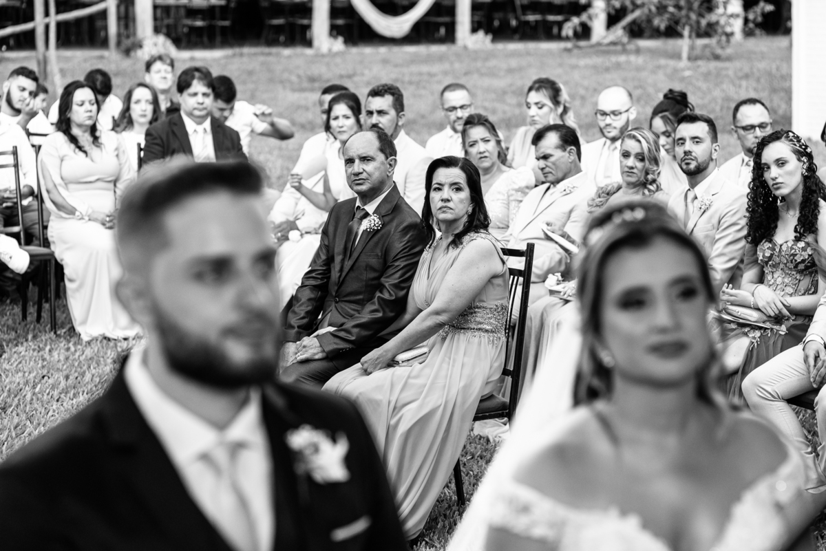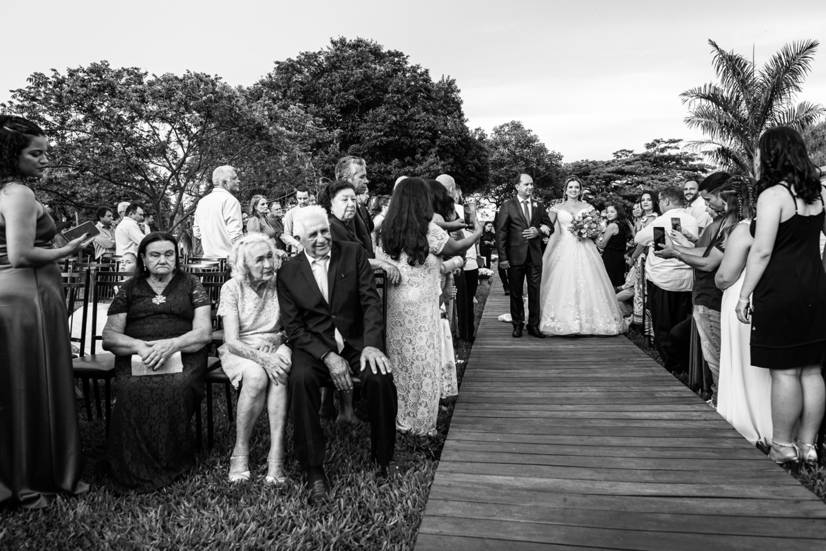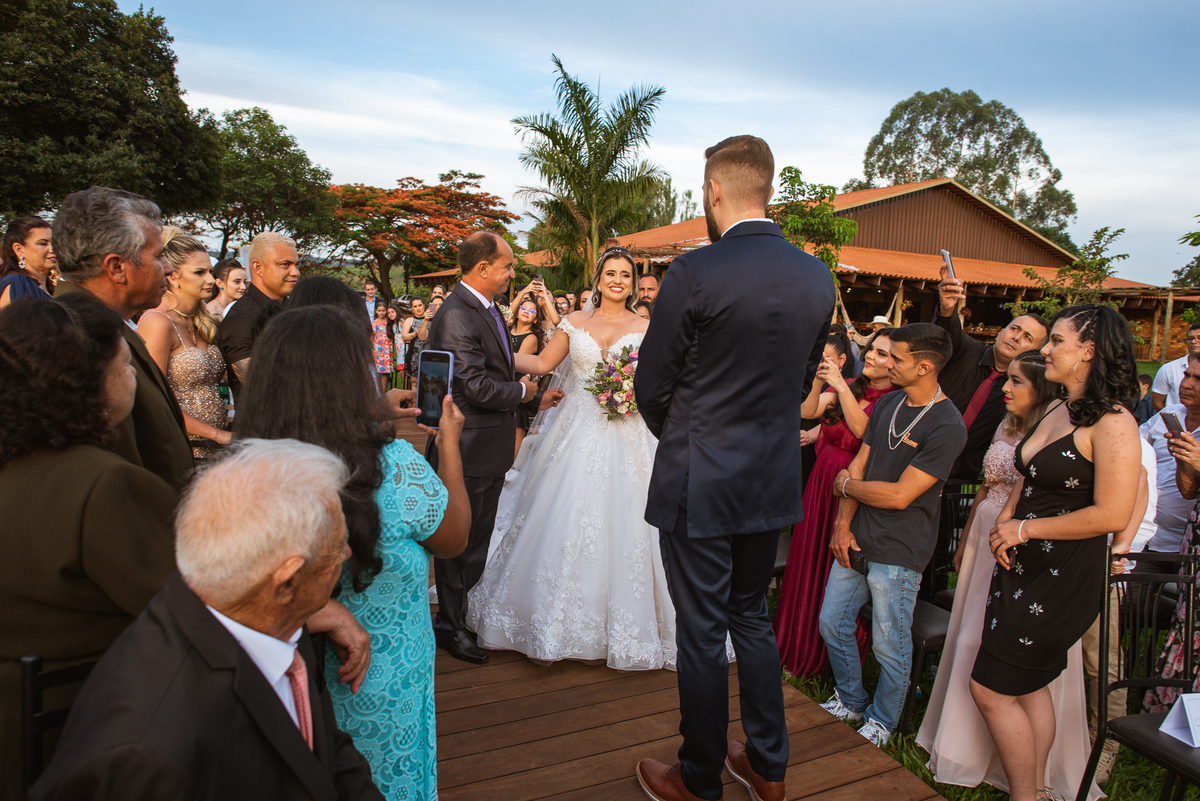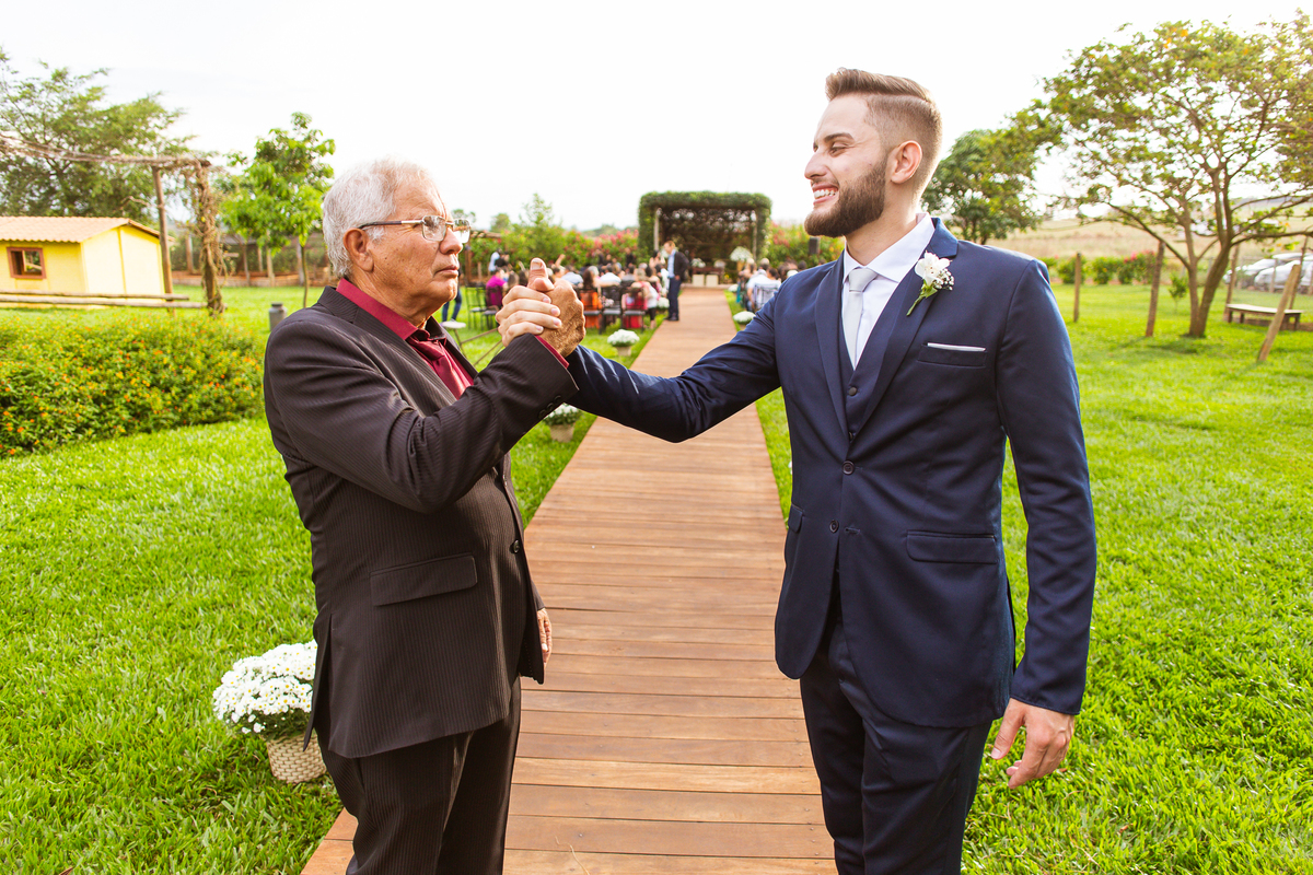 Lívio já estava pronto, fez todas as fotos que desejava e partiu para o local da cerimônia. Por falar nele, os noivos escolheram casar no espaço Casa de Família, que é um restaurante com um local especial preparado para casamentos também. Elisama realizava os últimos ajustes no penteado e já estava prestes a colocar seu vestido. Poucos minutos depois, ela surgiu maravilhosa e já com sua produção finalizada. Faltava apenas o véu que abrilhantaria ainda mais o vestido. Fizemos nossas fotos e partimos para a cerimônia. Fui bem rápido e cheguei antes da noiva. Lívio já estava lá, cumprimentando todos os convidados, abraçando os parentes e amigos e distribuindo seu sorriso para todos.