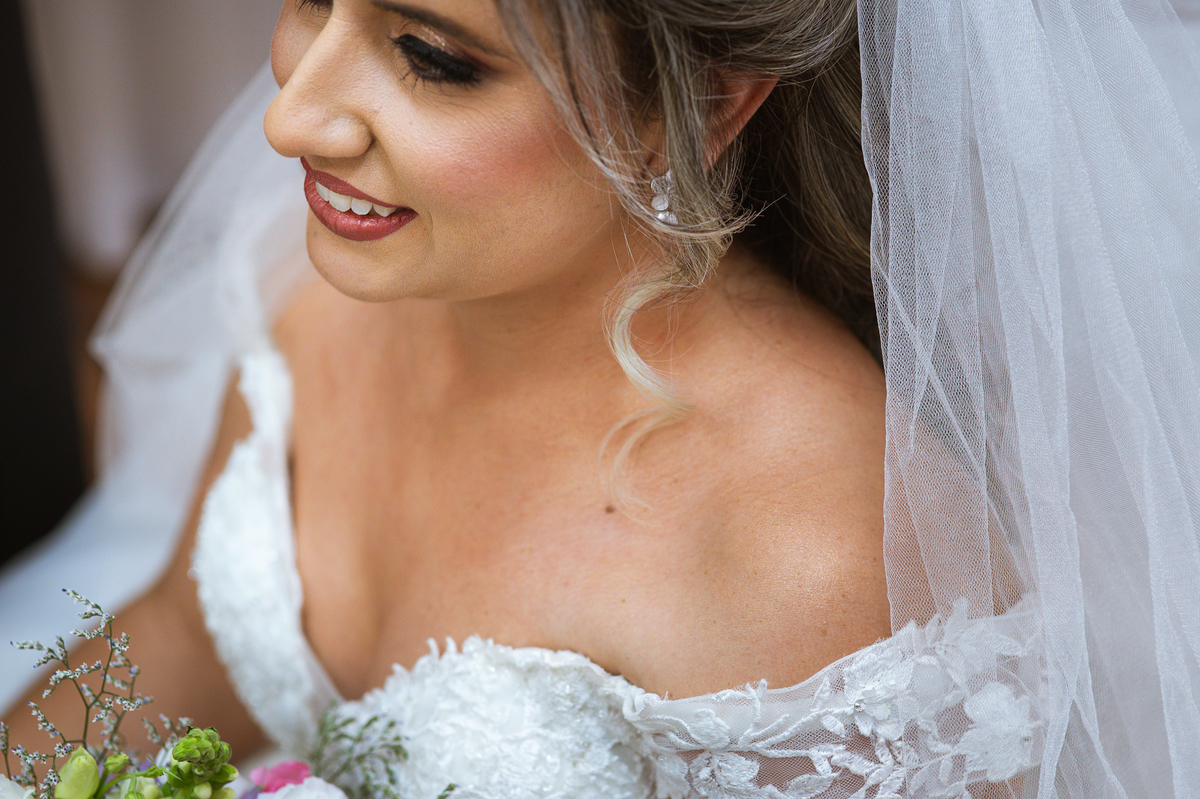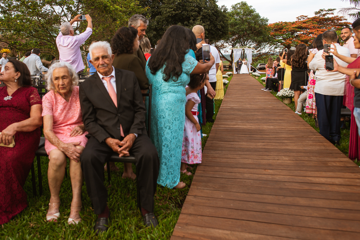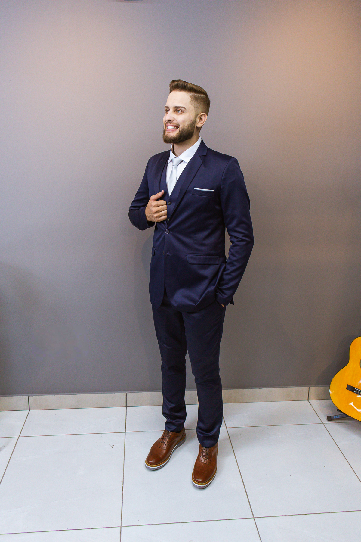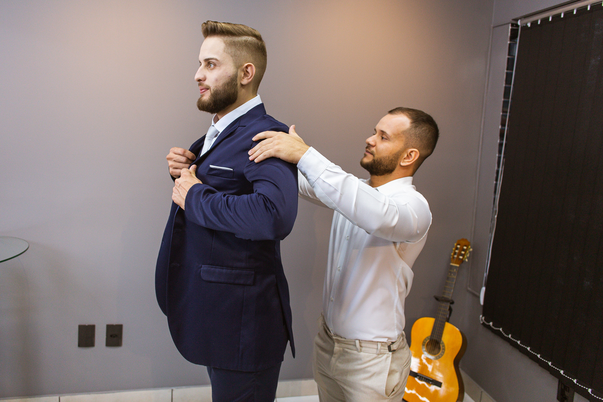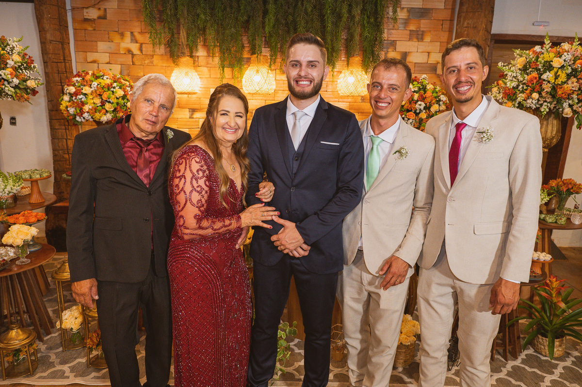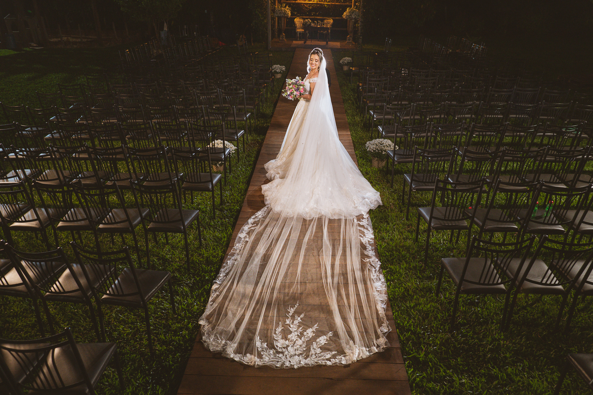 Lívio já estava pronto, fez todas as fotos que desejava e partiu para o local da cerimônia. Por falar nele, os noivos escolheram casar no espaço Casa de Família, que é um restaurante com um local especial preparado para casamentos também. Elisama realizava os últimos ajustes no penteado e já estava prestes a colocar seu vestido. Poucos minutos depois, ela surgiu maravilhosa e já com sua produção finalizada. Faltava apenas o véu que abrilhantaria ainda mais o vestido. Fizemos nossas fotos e partimos para a cerimônia. Fui bem rápido e cheguei antes da noiva. Lívio já estava lá, cumprimentando todos os convidados, abraçando os parentes e amigos e distribuindo seu sorriso para todos.