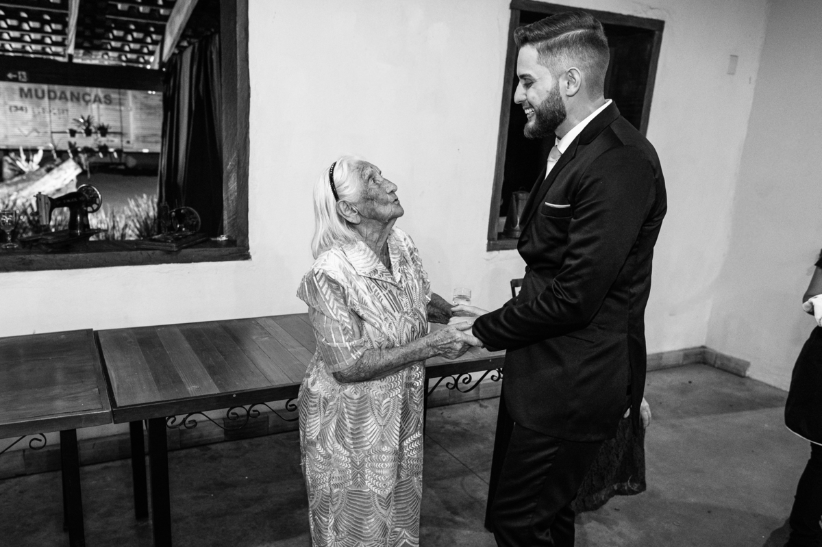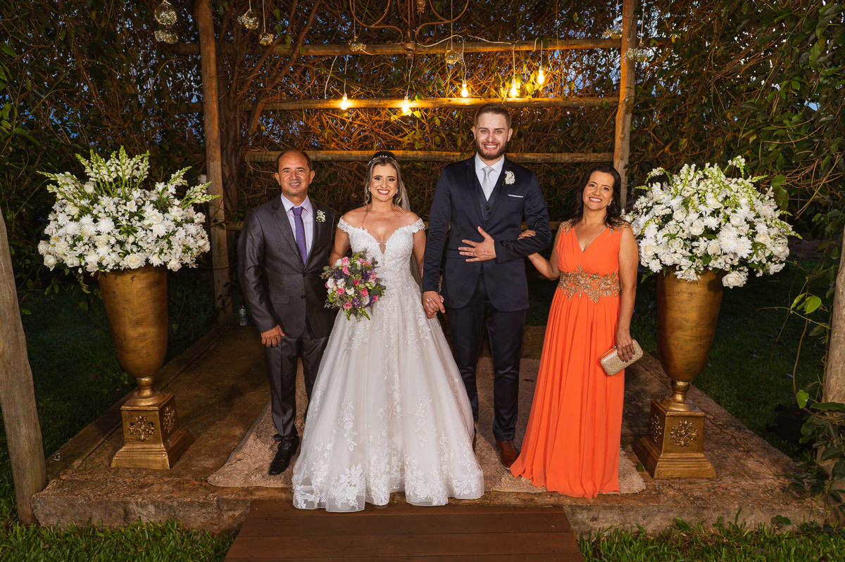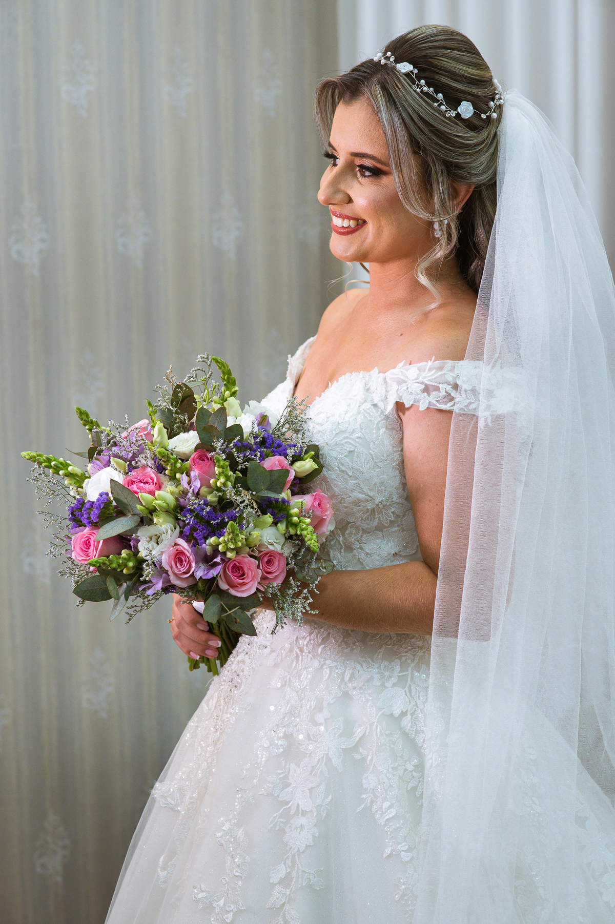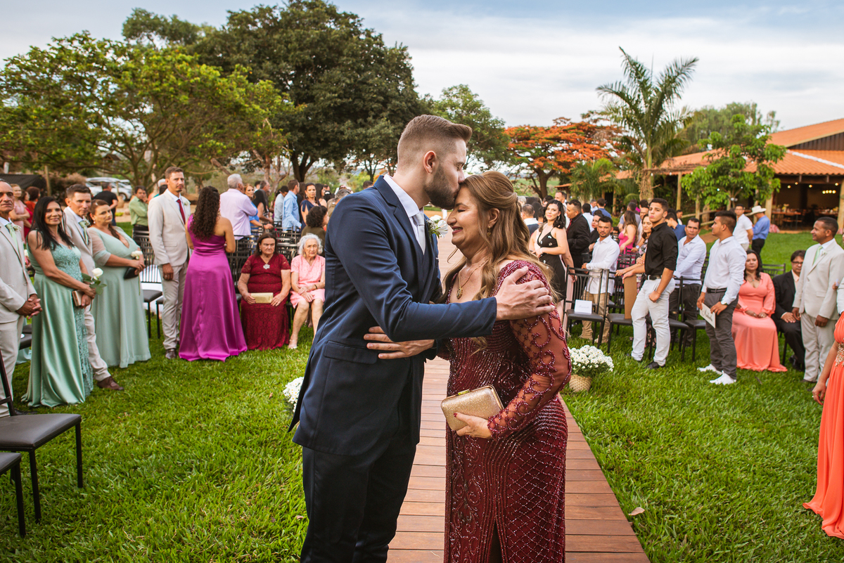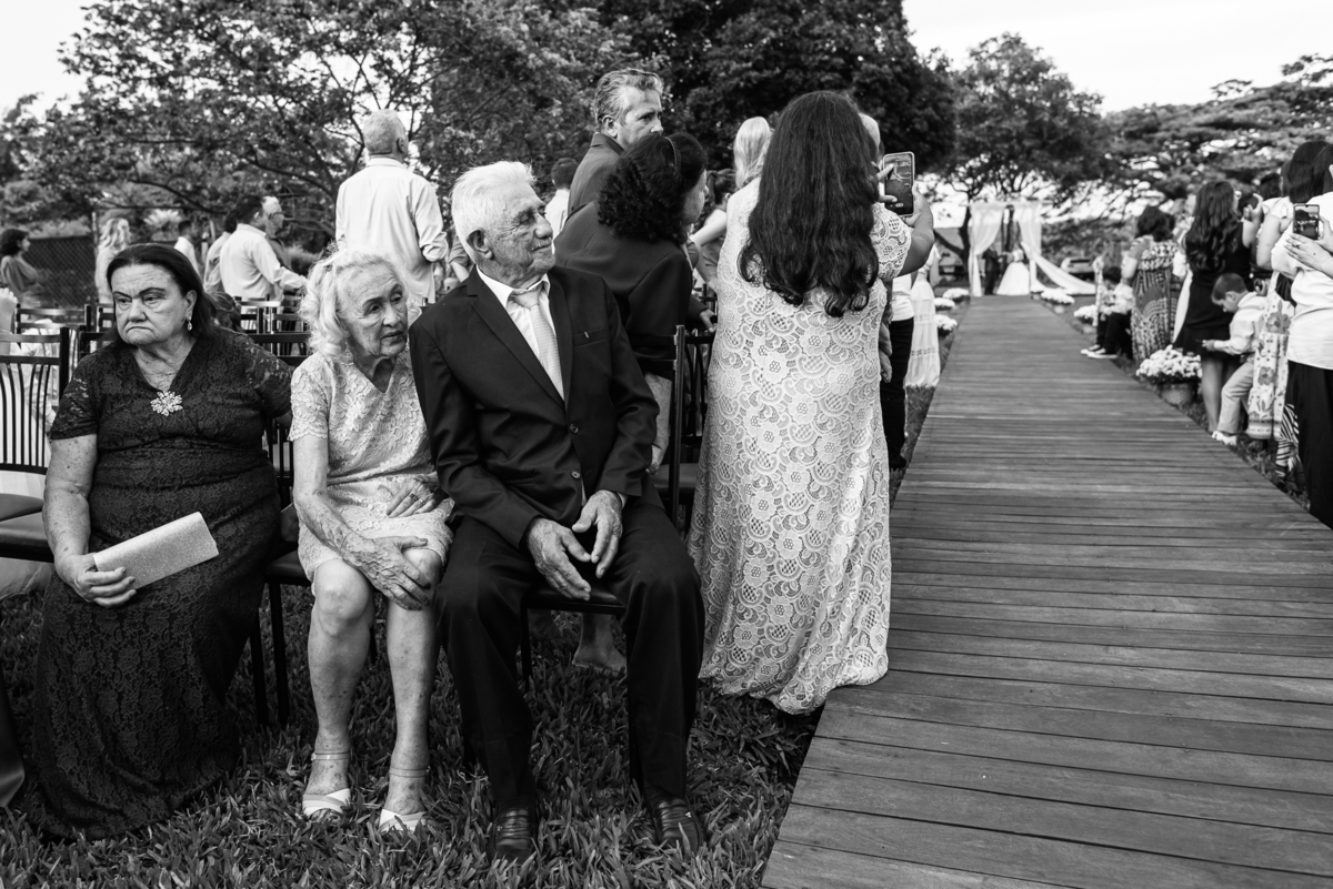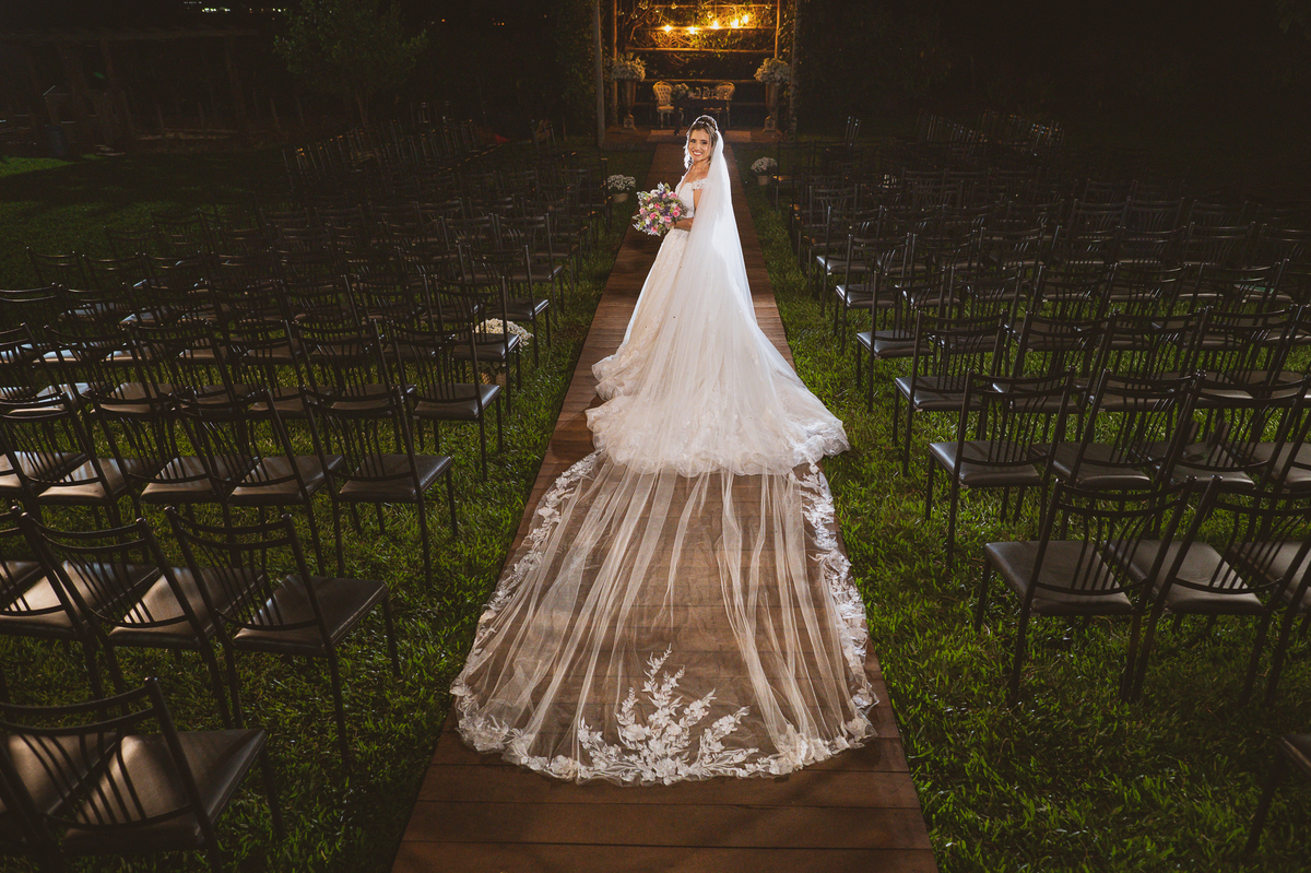 Lívio já estava pronto, fez todas as fotos que desejava e partiu para o local da cerimônia. Por falar nele, os noivos escolheram casar no espaço Casa de Família, que é um restaurante com um local especial preparado para casamentos também. Elisama realizava os últimos ajustes no penteado e já estava prestes a colocar seu vestido. Poucos minutos depois, ela surgiu maravilhosa e já com sua produção finalizada. Faltava apenas o véu que abrilhantaria ainda mais o vestido. Fizemos nossas fotos e partimos para a cerimônia. Fui bem rápido e cheguei antes da noiva. Lívio já estava lá, cumprimentando todos os convidados, abraçando os parentes e amigos e distribuindo seu sorriso para todos.