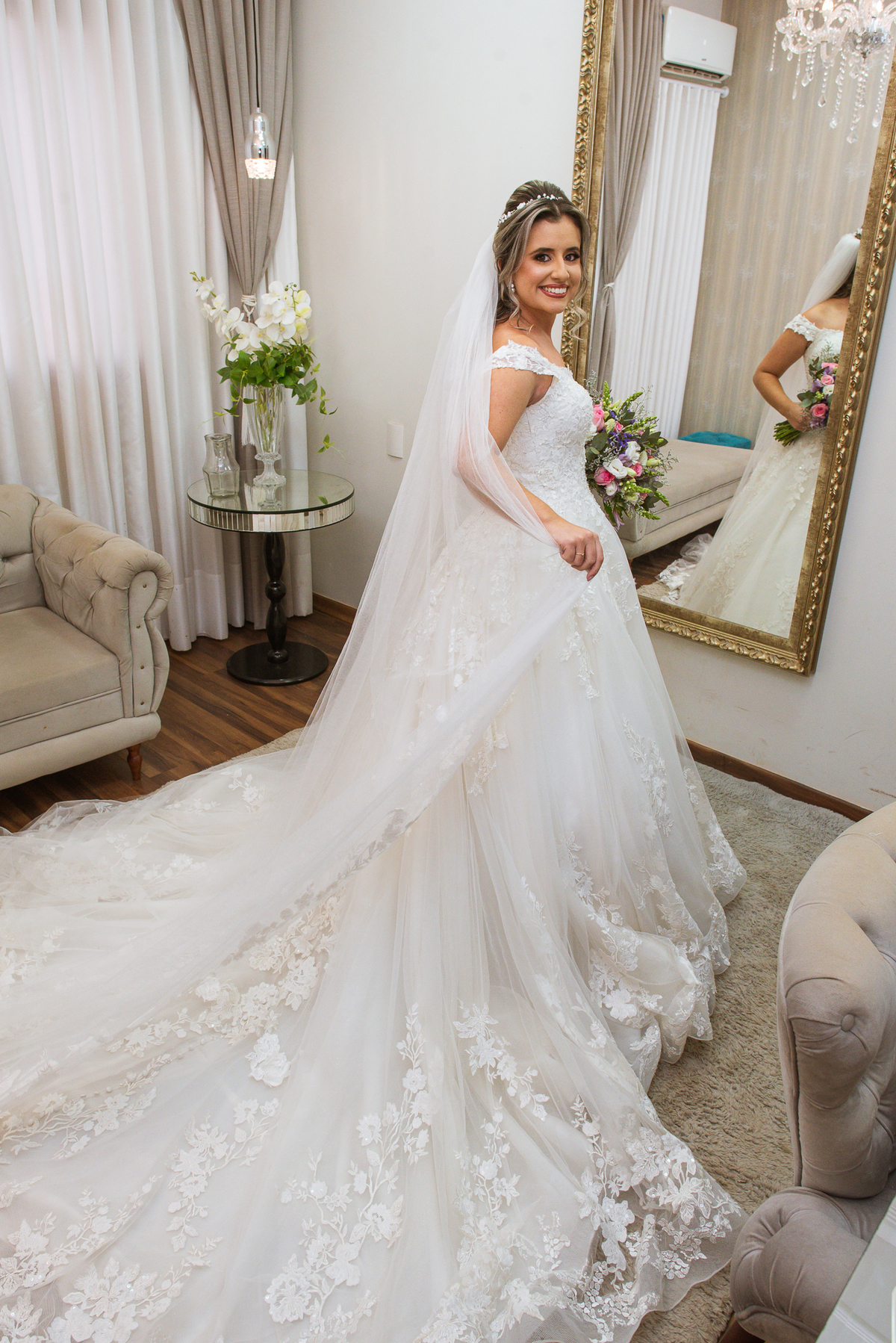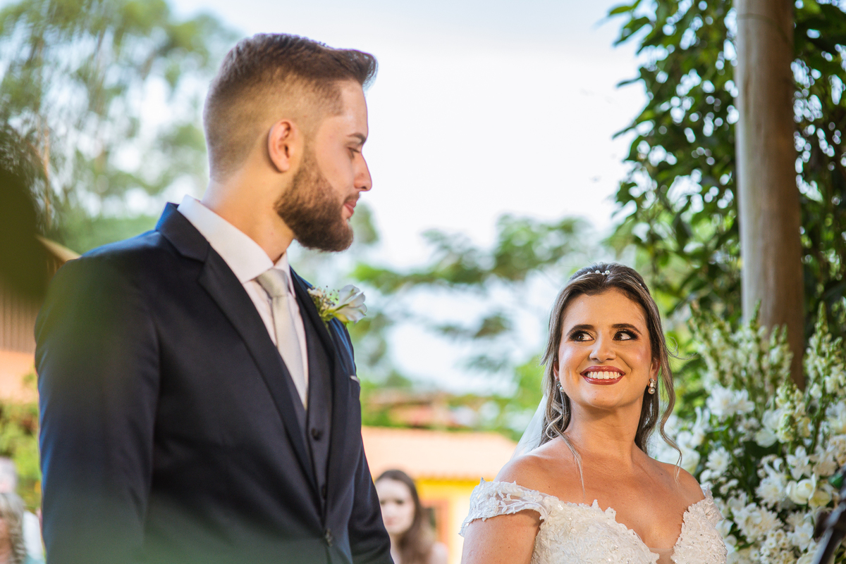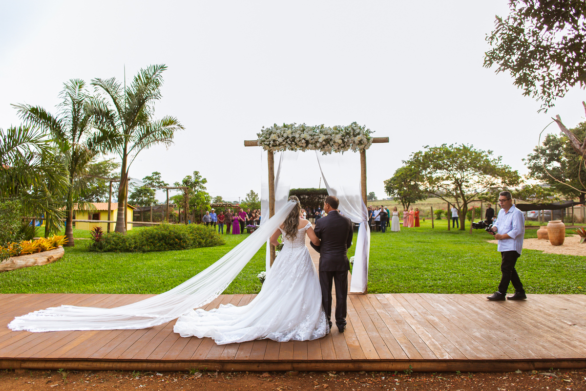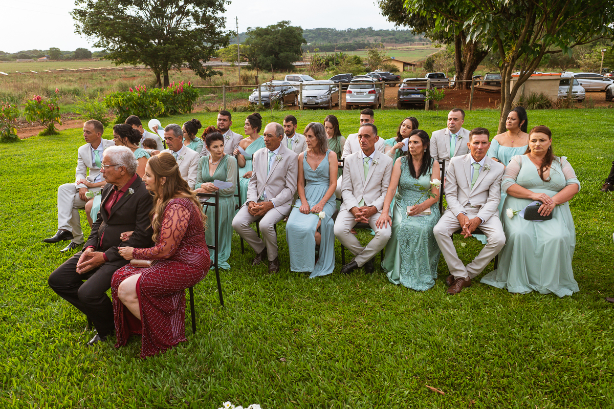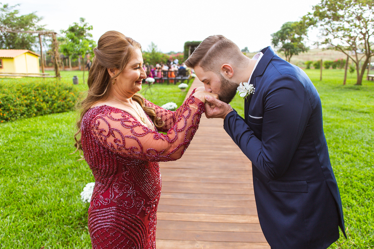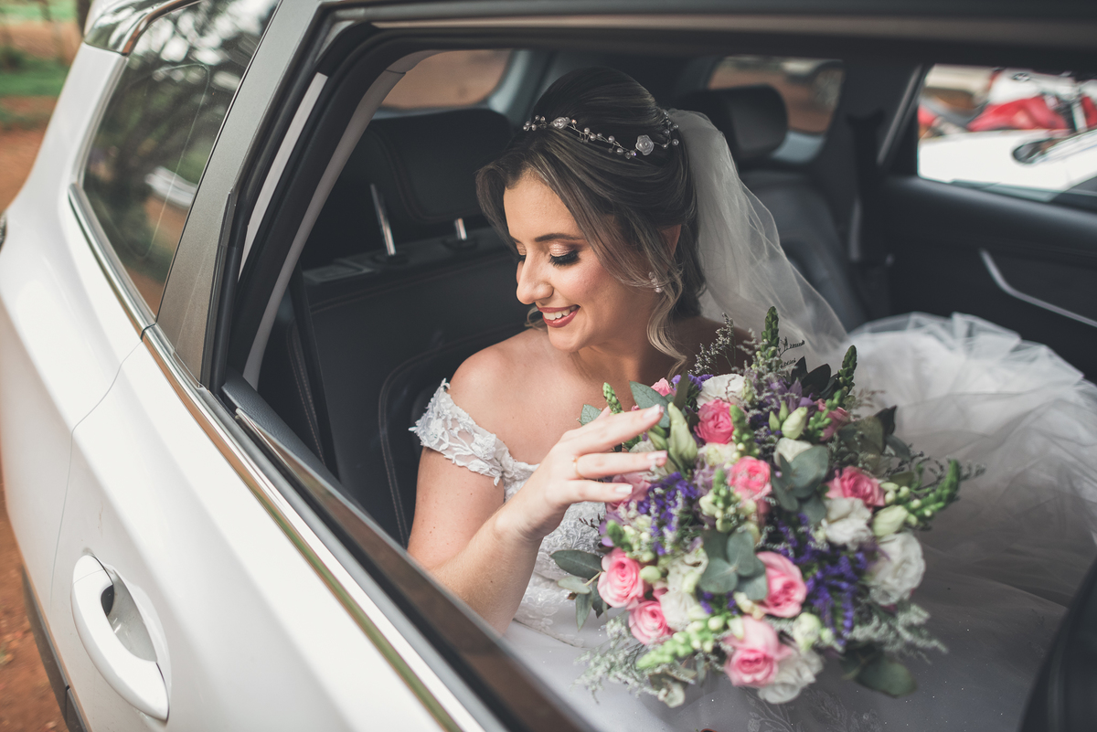 Quando cheguei, nos cumprimentamos e ela logo abriu aquele sorrisão de quem sabe que fez a escolha certa e tudo estava nas mãos de Deus. Ela olhava para o vestido admirando como se realizasse um sonho de criança. Sabe quando a menina sonha com seu grande dia de noiva? Pois é, eu estava presenciando a realização desse sonho ali. A nossa apreensão era com a possibilidade de chuva, pois o casamento aconteceria ao ar livre, então caso chovesse perderia todo o charme do casamento no campo. Mas como disse no início, Deus já havia preparado tudo...