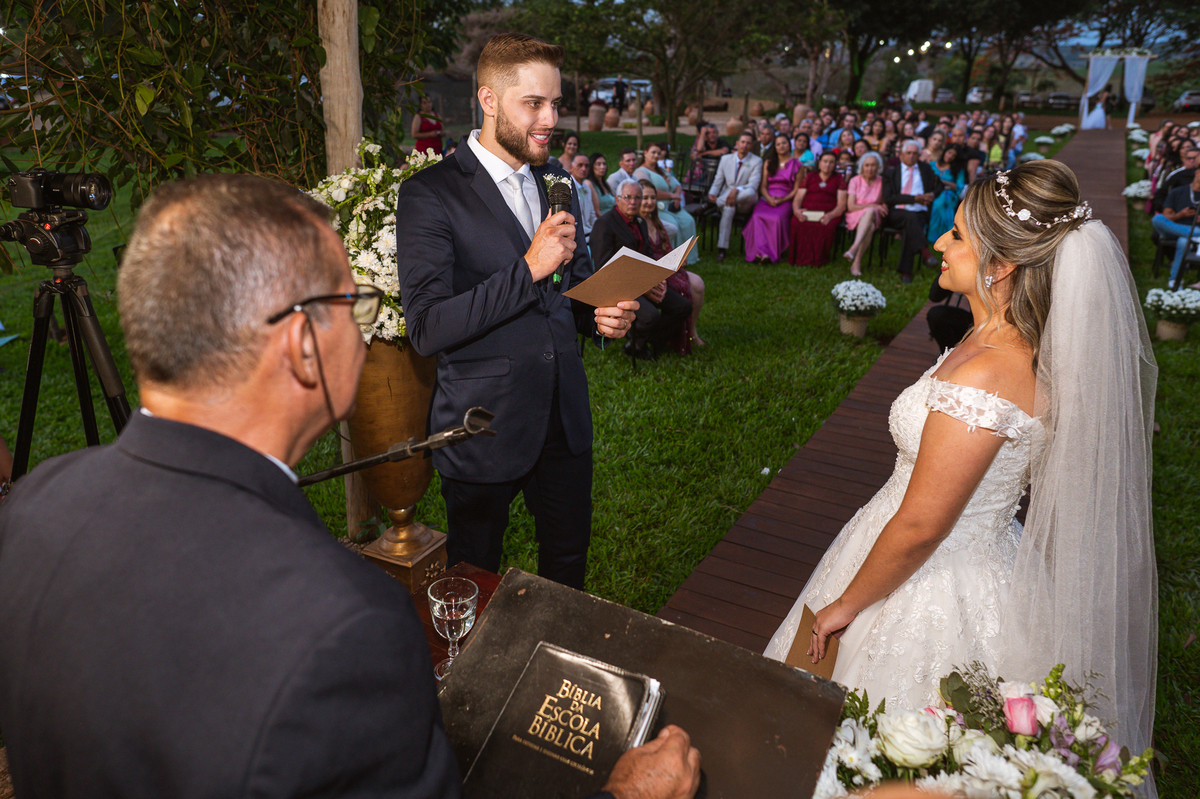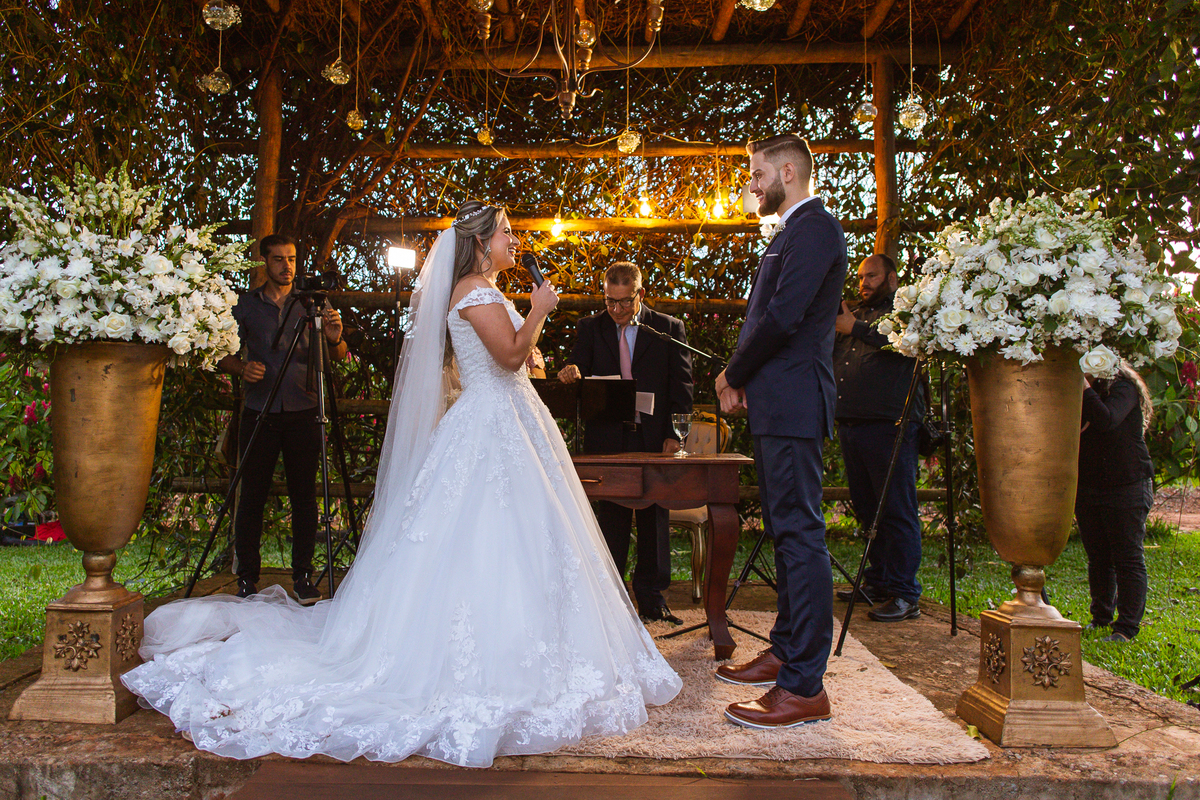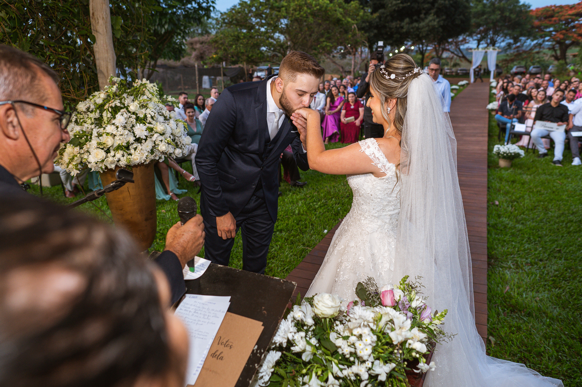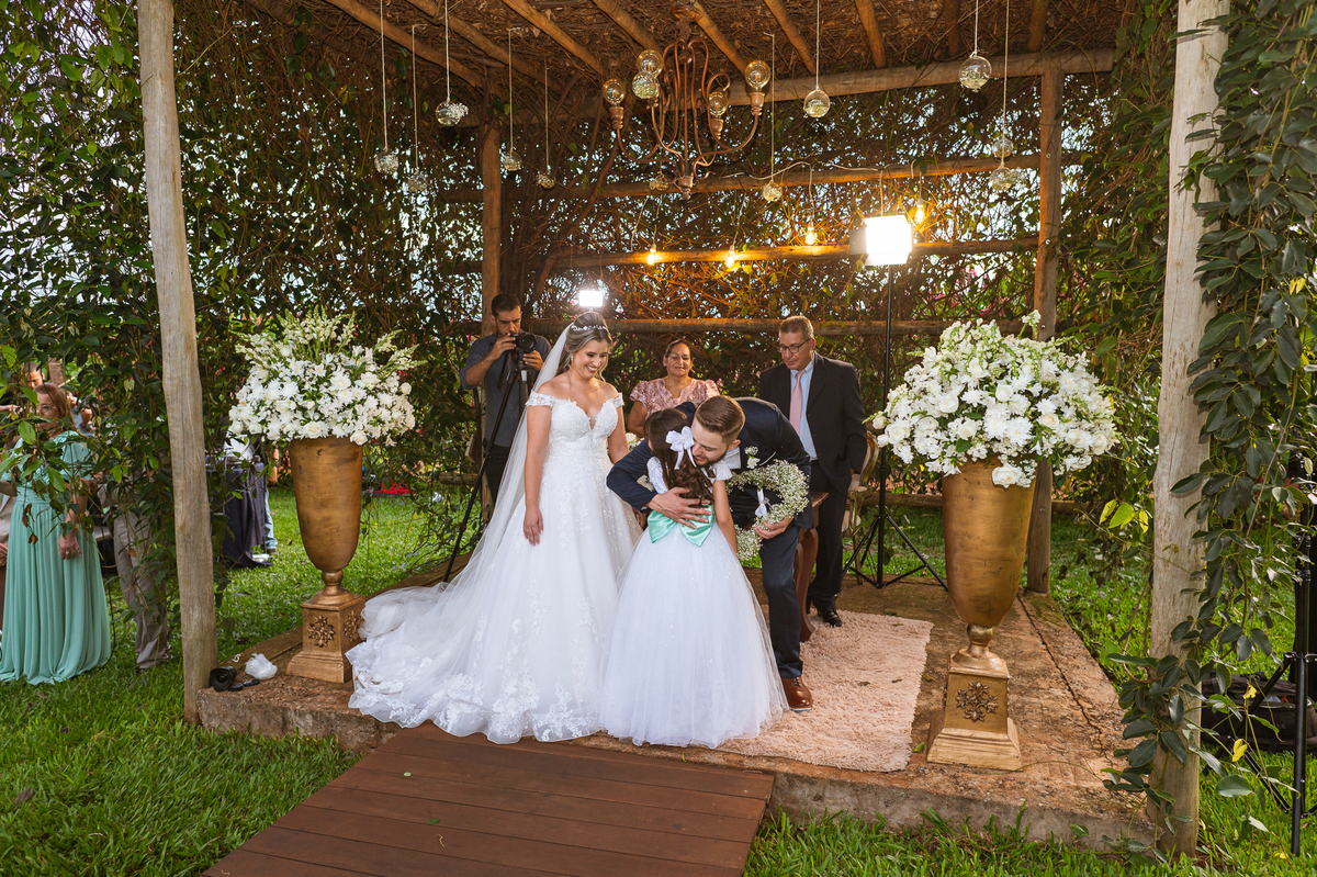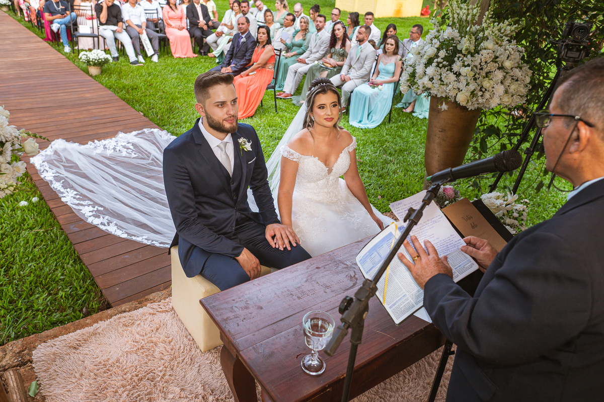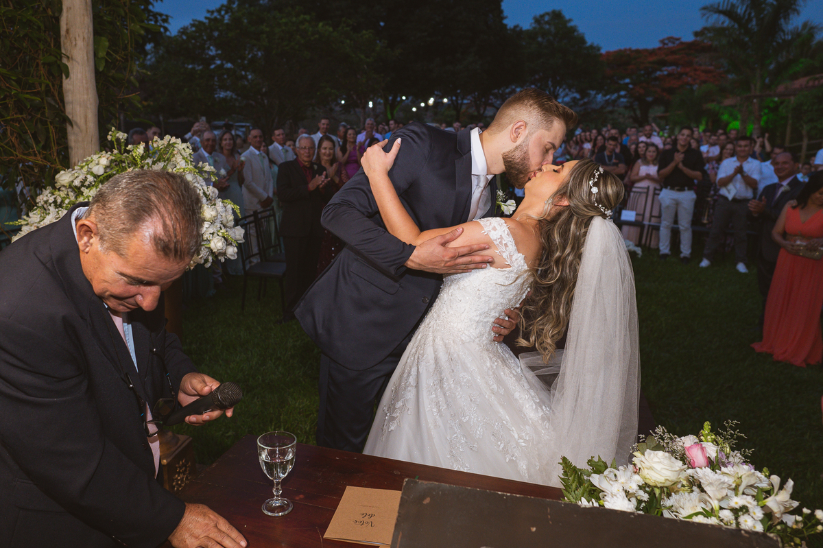 Um detalhe que vale a pena destacar e que eu achei simplesmente sensacional é que este referido pastor foi o mesmo que celebrou o casamento dos pais da noiva, 35 anos atrás. Já pensou que história linda? Começar um casamento assim, com a mesma bênção dada aos pais da noiva é maravilhoso. A palavra ministrada foi linda e eu tenho certeza de que os noivos e convidados guardarão essa mensagem em seus corações. As alianças foram levadas ao altar por uma das daminhas e foi abençoada. Os noivos trocaram as alianças e selaram sua união com um beijo nas alianças. Logo após, tivemos a troca de votos que foi muito emocionante. Os dois prepararam lindas palavras um para o outro. Muitos convidados se emocionaram e os noivos também. Ao fim, o pastor os declarou casados perante a lei de Deus e dos homens. Os dois se beijaram e os aplausos foram intensos.
