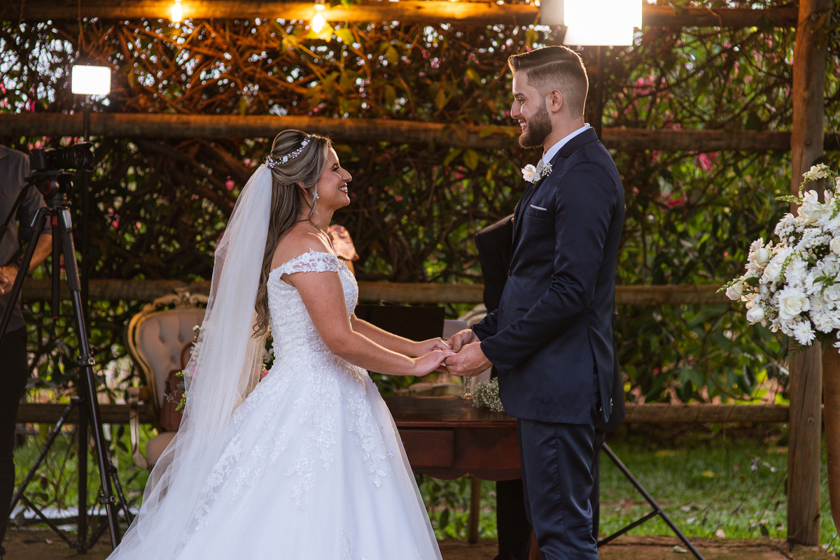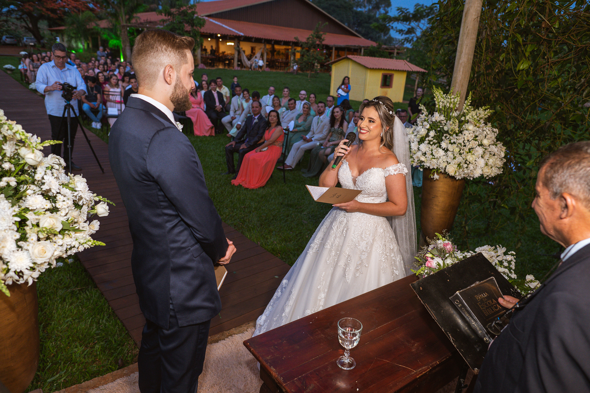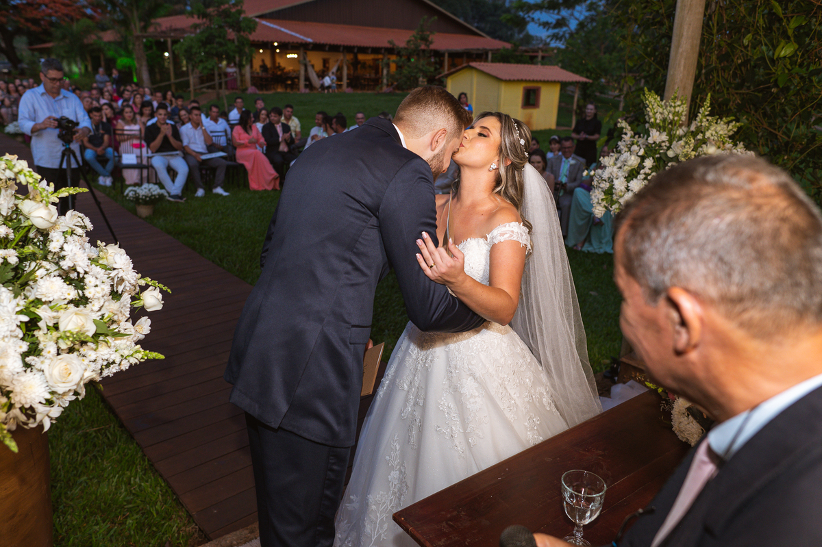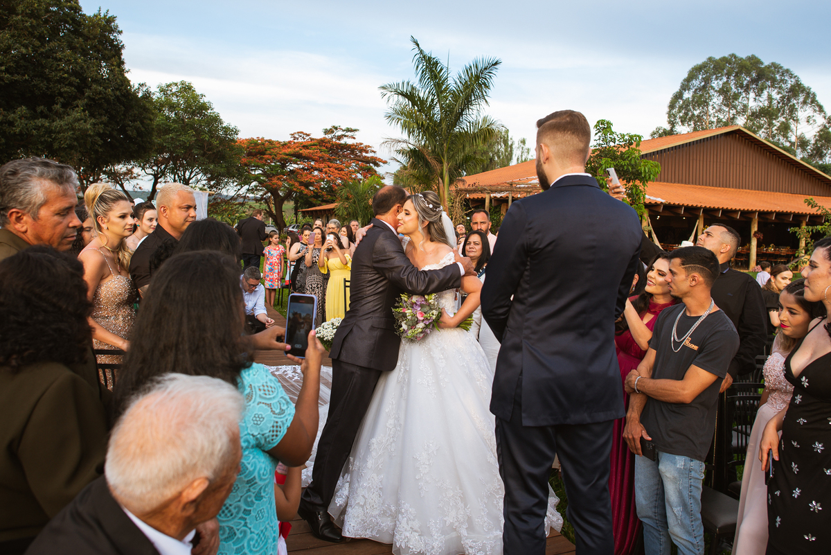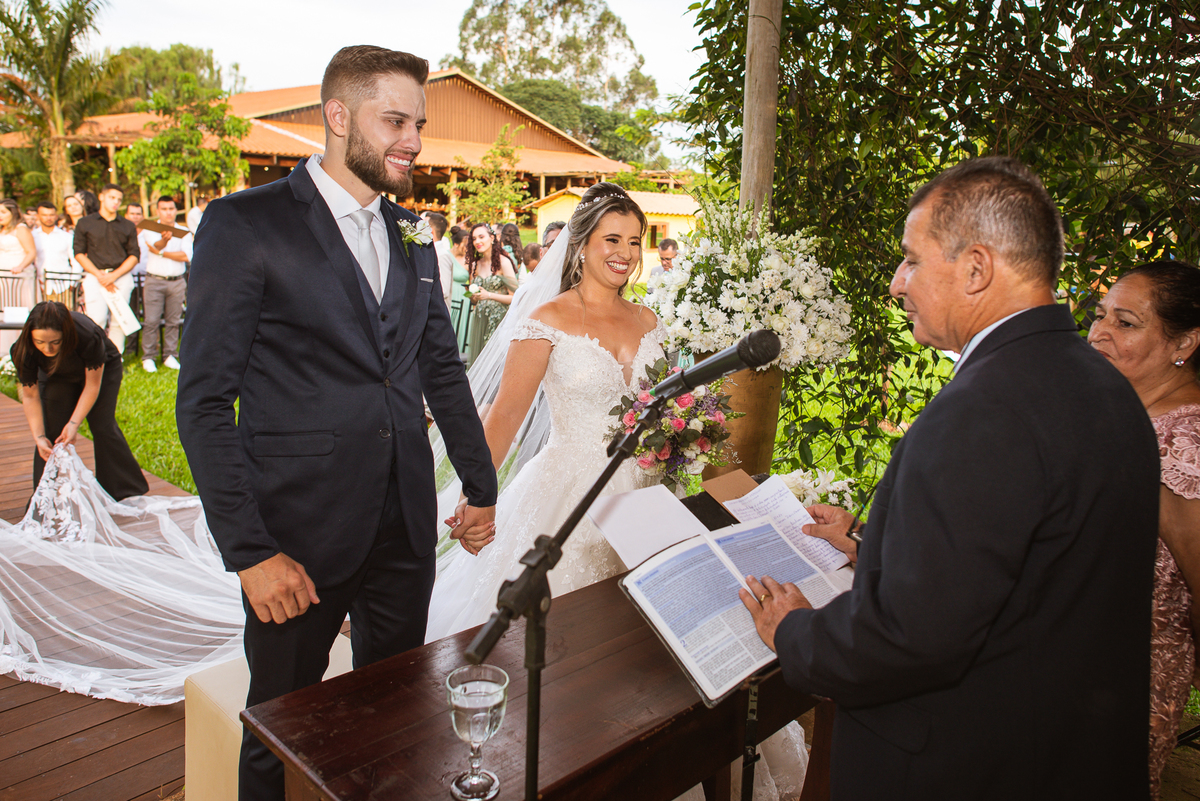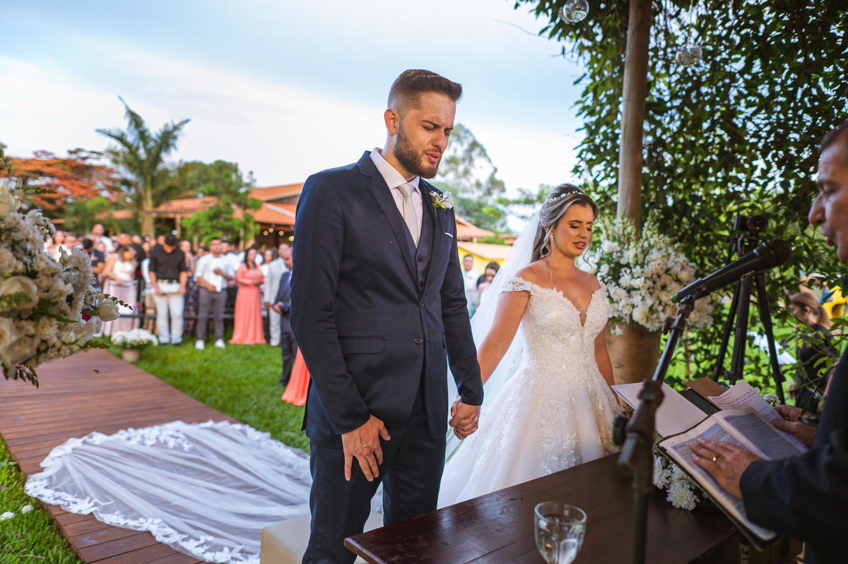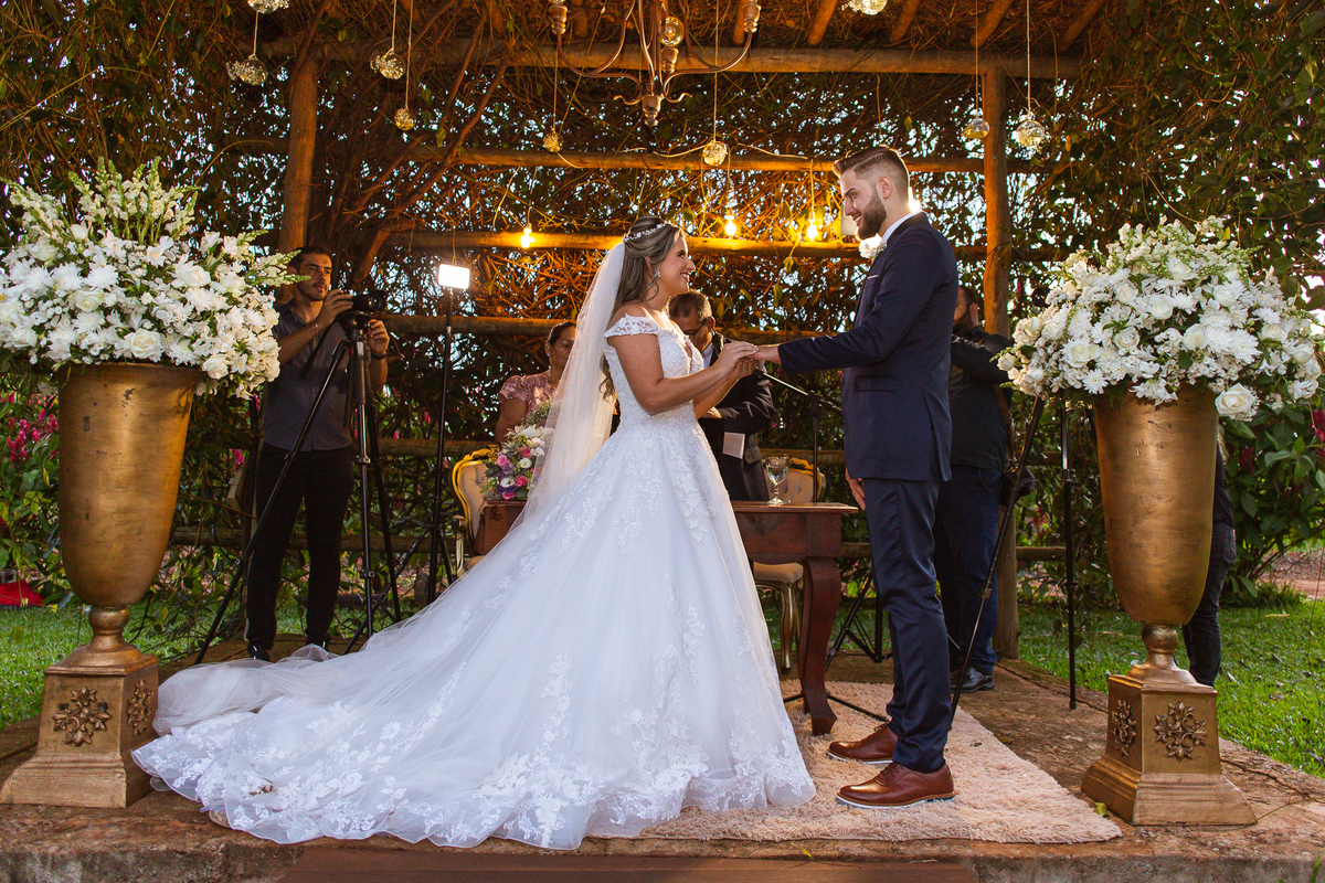 Um detalhe que vale a pena destacar e que eu achei simplesmente sensacional é que este referido pastor foi o mesmo que celebrou o casamento dos pais da noiva, 35 anos atrás. Já pensou que história linda? Começar um casamento assim, com a mesma bênção dada aos pais da noiva é maravilhoso. A palavra ministrada foi linda e eu tenho certeza de que os noivos e convidados guardarão essa mensagem em seus corações. As alianças foram levadas ao altar por uma das daminhas e foi abençoada. Os noivos trocaram as alianças e selaram sua união com um beijo nas alianças. Logo após, tivemos a troca de votos que foi muito emocionante. Os dois prepararam lindas palavras um para o outro. Muitos convidados se emocionaram e os noivos também. Ao fim, o pastor os declarou casados perante a lei de Deus e dos homens. Os dois se beijaram e os aplausos foram intensos.