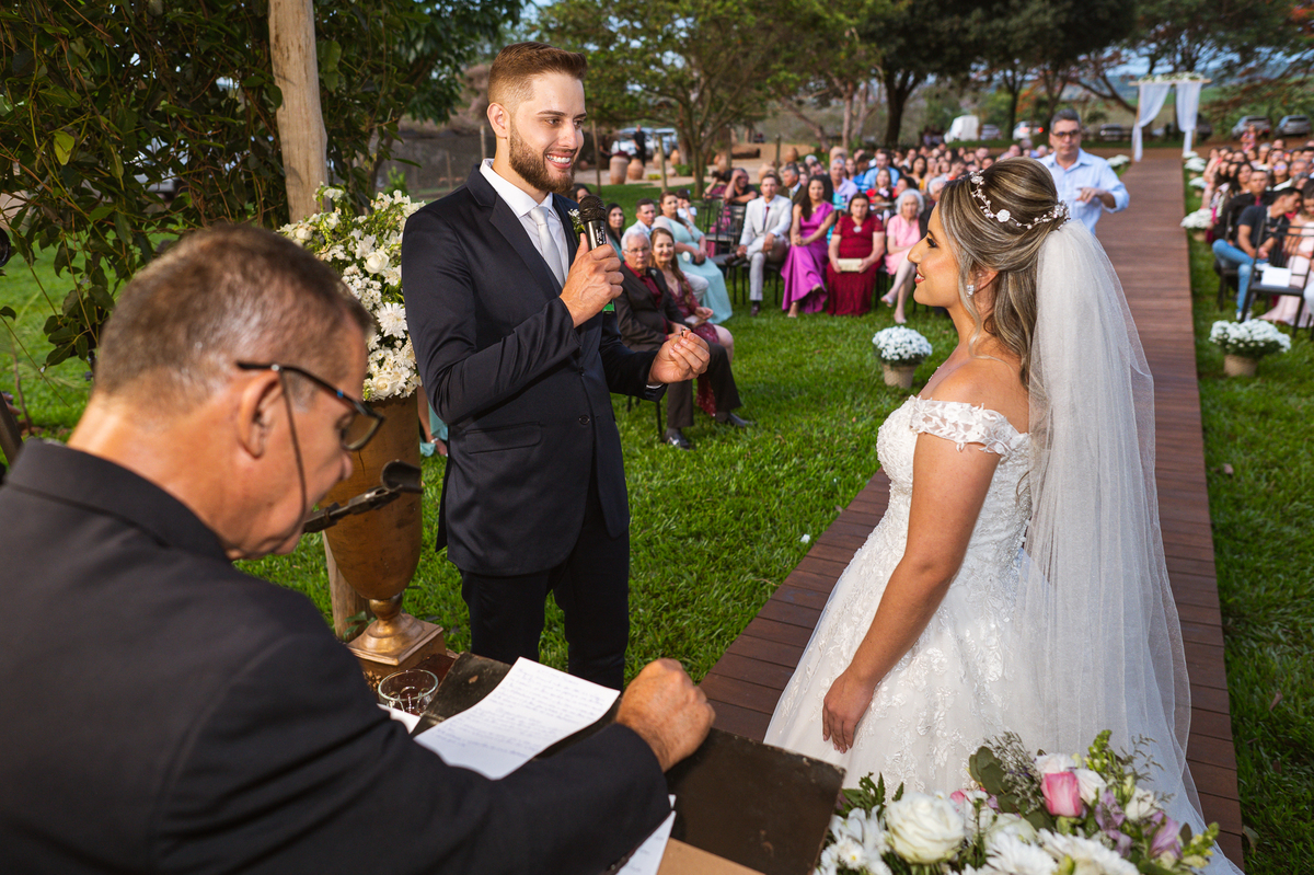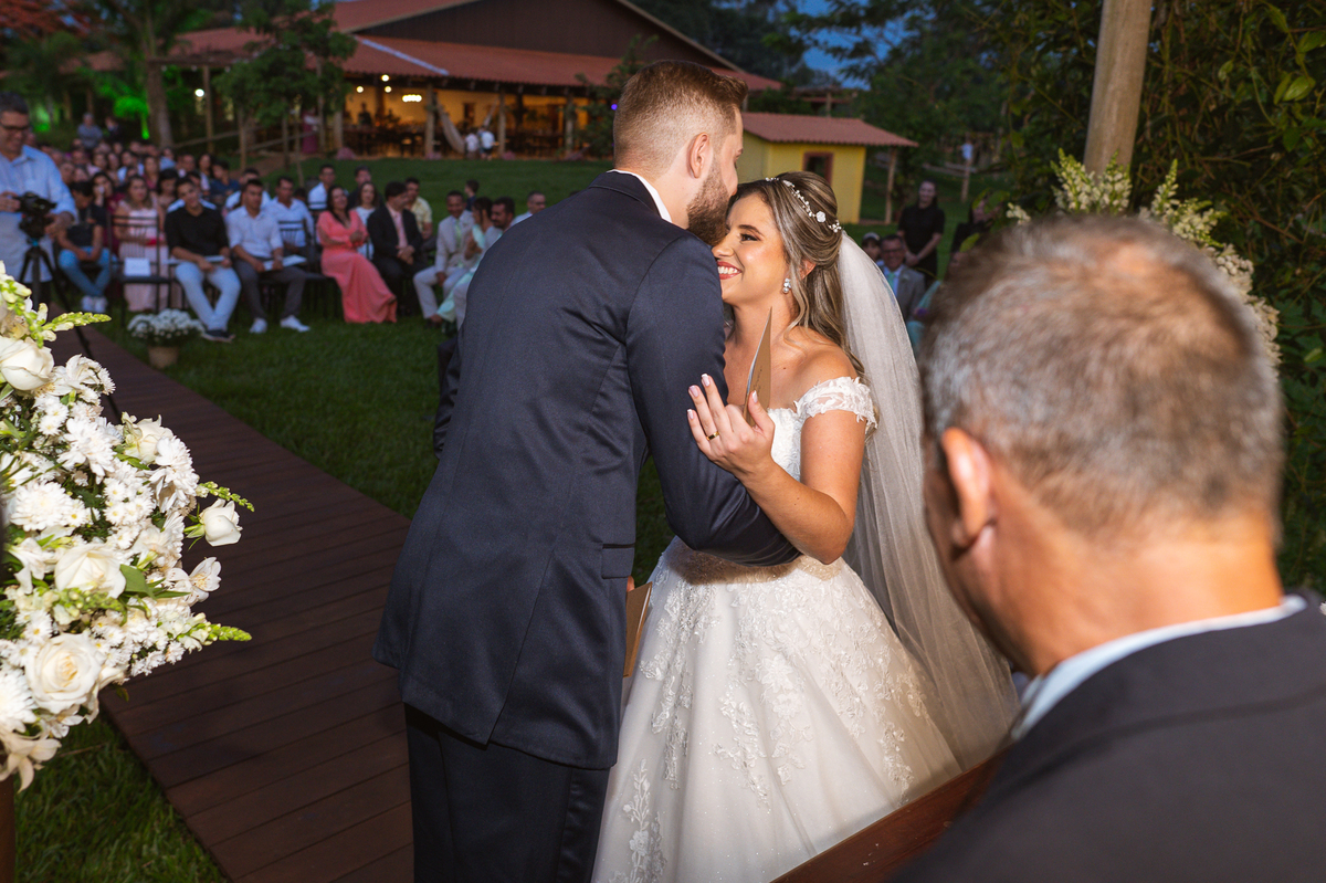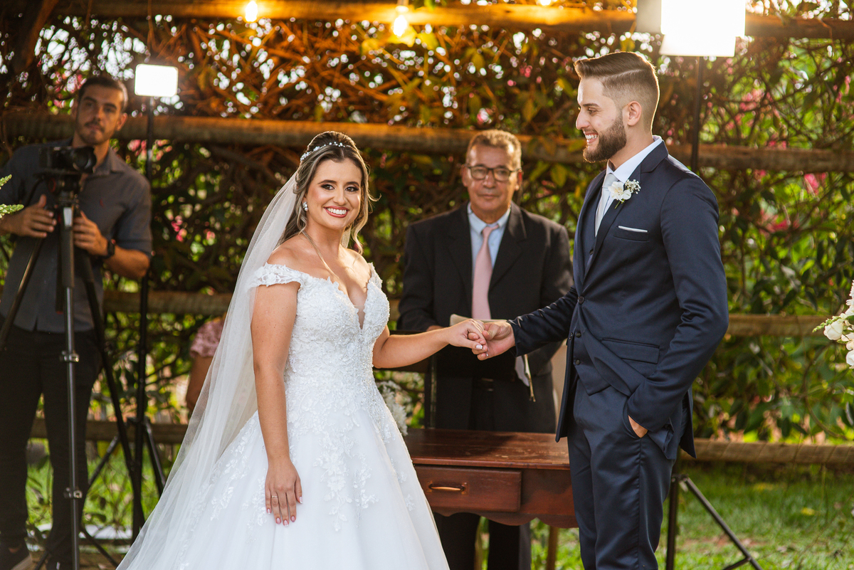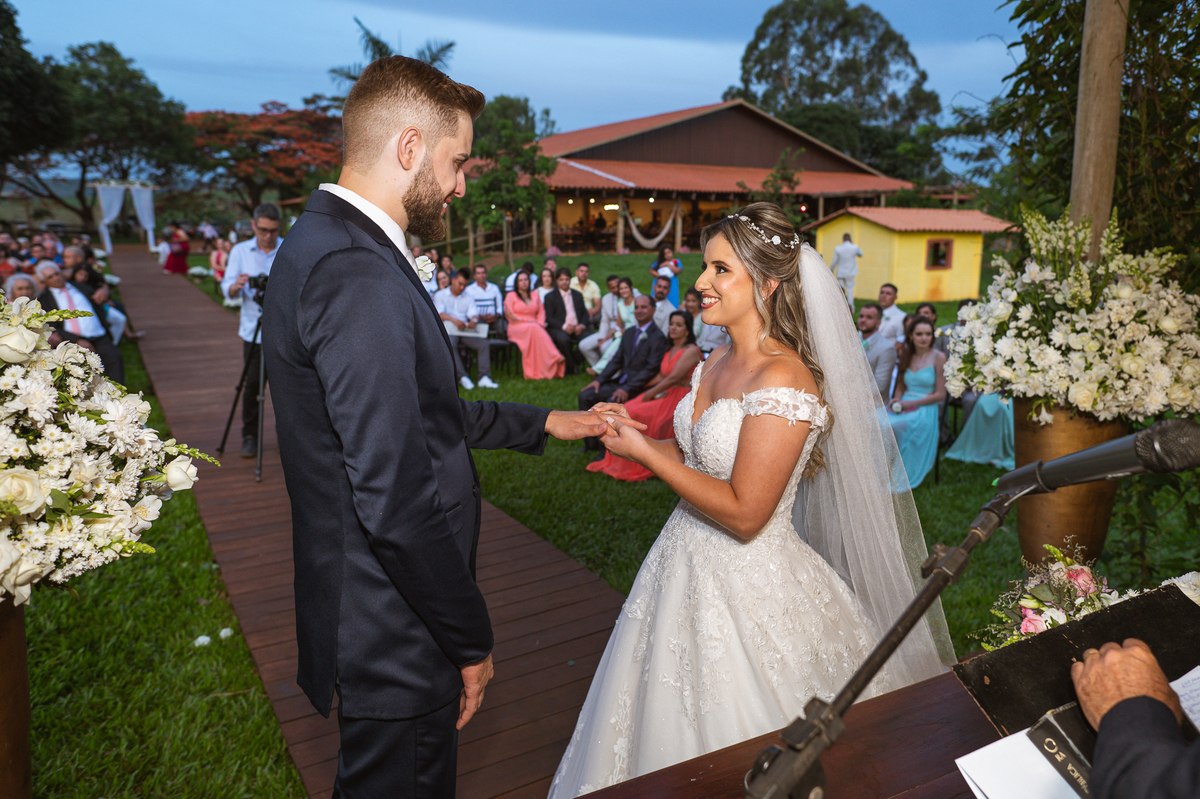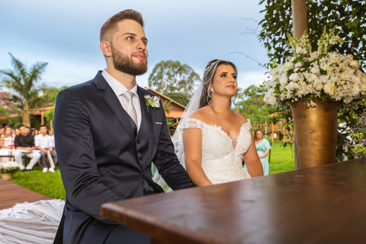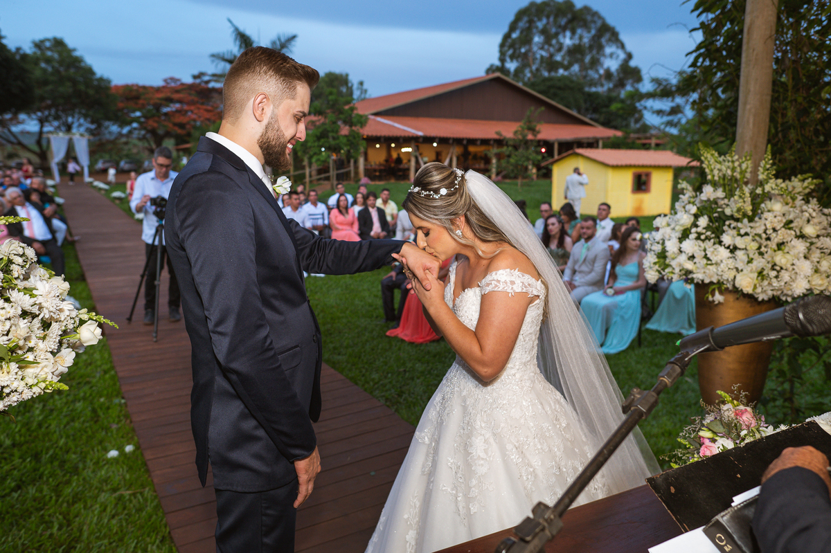 Um detalhe que vale a pena destacar e que eu achei simplesmente sensacional é que este referido pastor foi o mesmo que celebrou o casamento dos pais da noiva, 35 anos atrás. Já pensou que história linda? Começar um casamento assim, com a mesma bênção dada aos pais da noiva é maravilhoso. A palavra ministrada foi linda e eu tenho certeza de que os noivos e convidados guardarão essa mensagem em seus corações. As alianças foram levadas ao altar por uma das daminhas e foi abençoada. Os noivos trocaram as alianças e selaram sua união com um beijo nas alianças. Logo após, tivemos a troca de votos que foi muito emocionante. Os dois prepararam lindas palavras um para o outro. Muitos convidados se emocionaram e os noivos também. Ao fim, o pastor os declarou casados perante a lei de Deus e dos homens. Os dois se beijaram e os aplausos foram intensos.