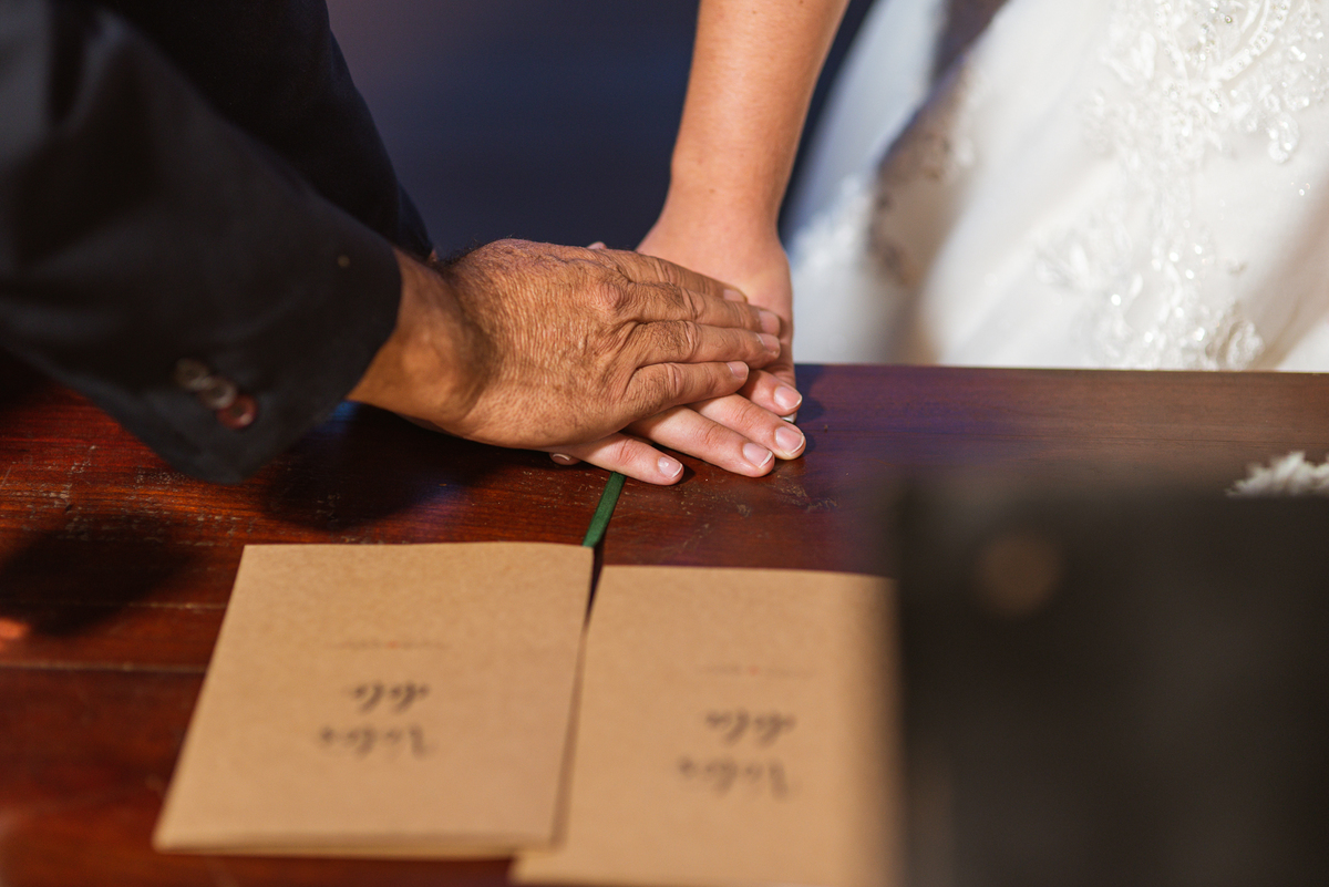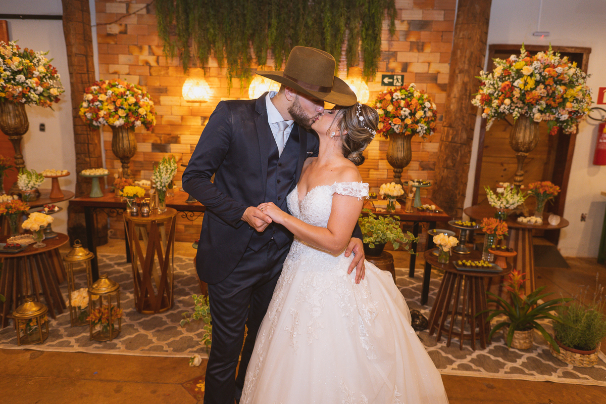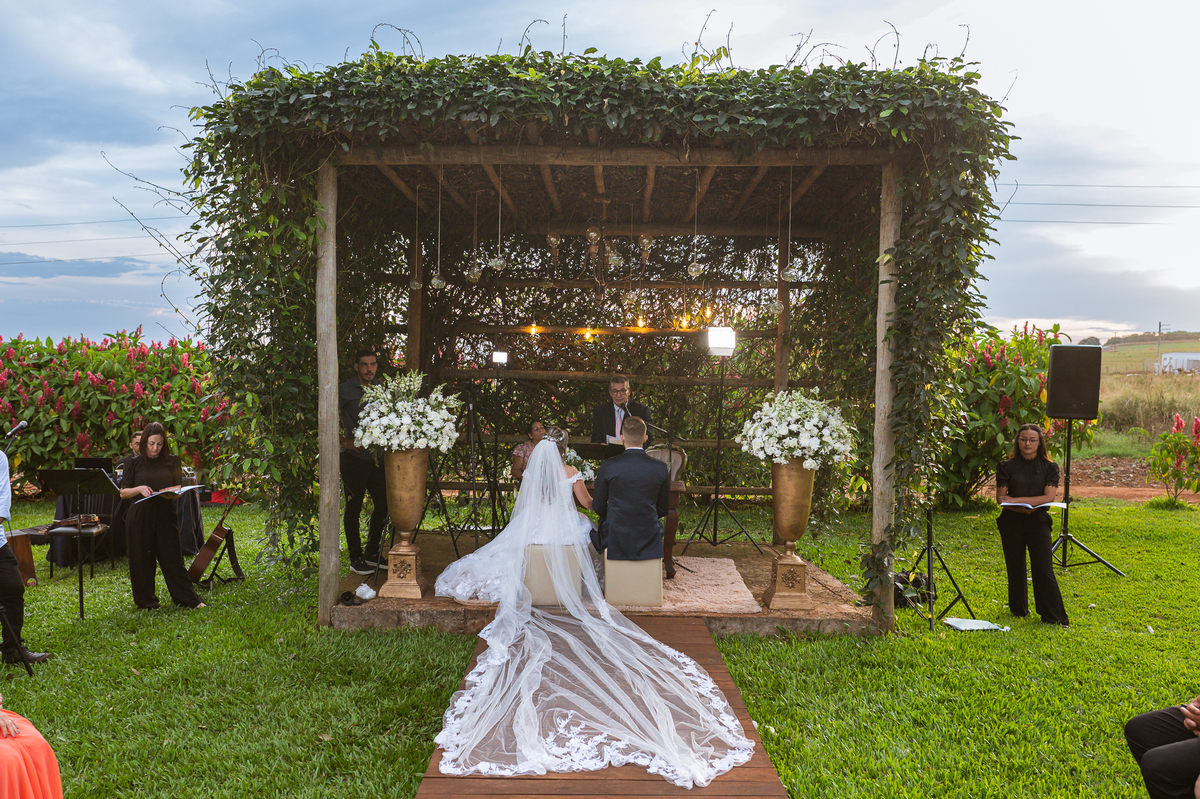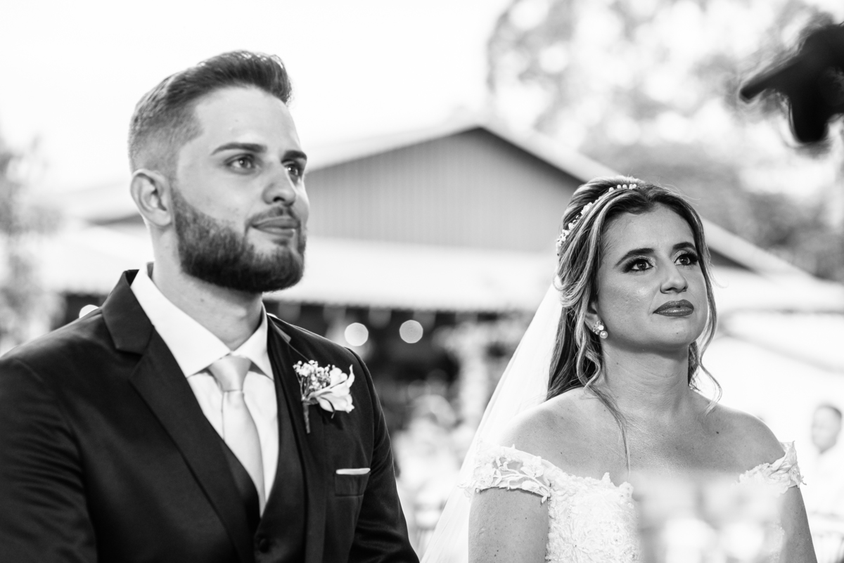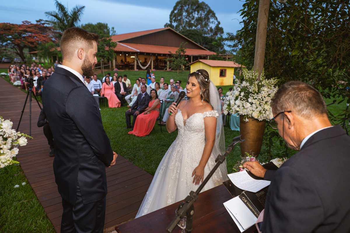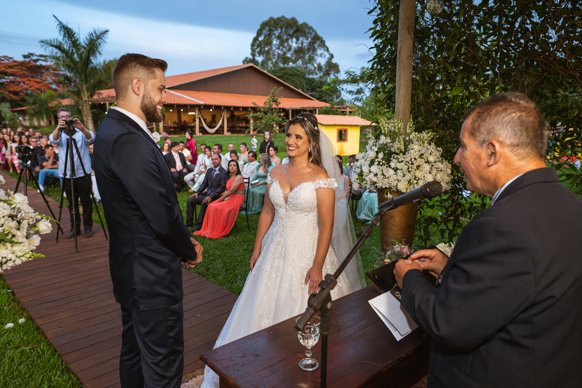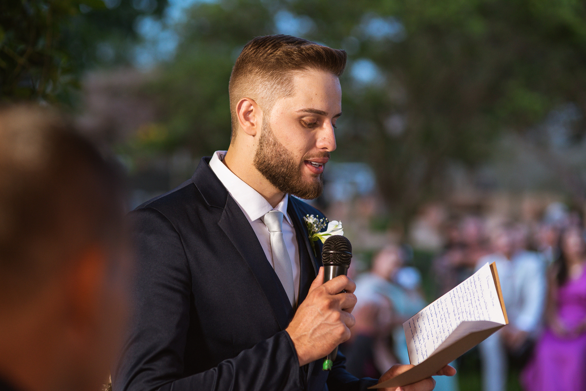 Um detalhe que vale a pena destacar e que eu achei simplesmente sensacional é que este referido pastor foi o mesmo que celebrou o casamento dos pais da noiva, 35 anos atrás. Já pensou que história linda? Começar um casamento assim, com a mesma bênção dada aos pais da noiva é maravilhoso. A palavra ministrada foi linda e eu tenho certeza de que os noivos e convidados guardarão essa mensagem em seus corações. As alianças foram levadas ao altar por uma das daminhas e foi abençoada. Os noivos trocaram as alianças e selaram sua união com um beijo nas alianças. Logo após, tivemos a troca de votos que foi muito emocionante. Os dois prepararam lindas palavras um para o outro. Muitos convidados se emocionaram e os noivos também. Ao fim, o pastor os declarou casados perante a lei de Deus e dos homens. Os dois se beijaram e os aplausos foram intensos.