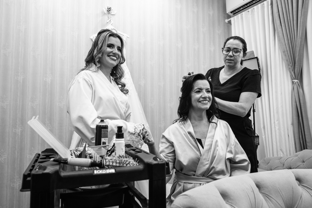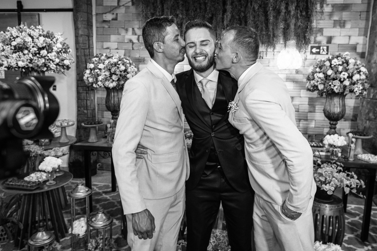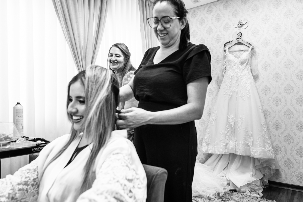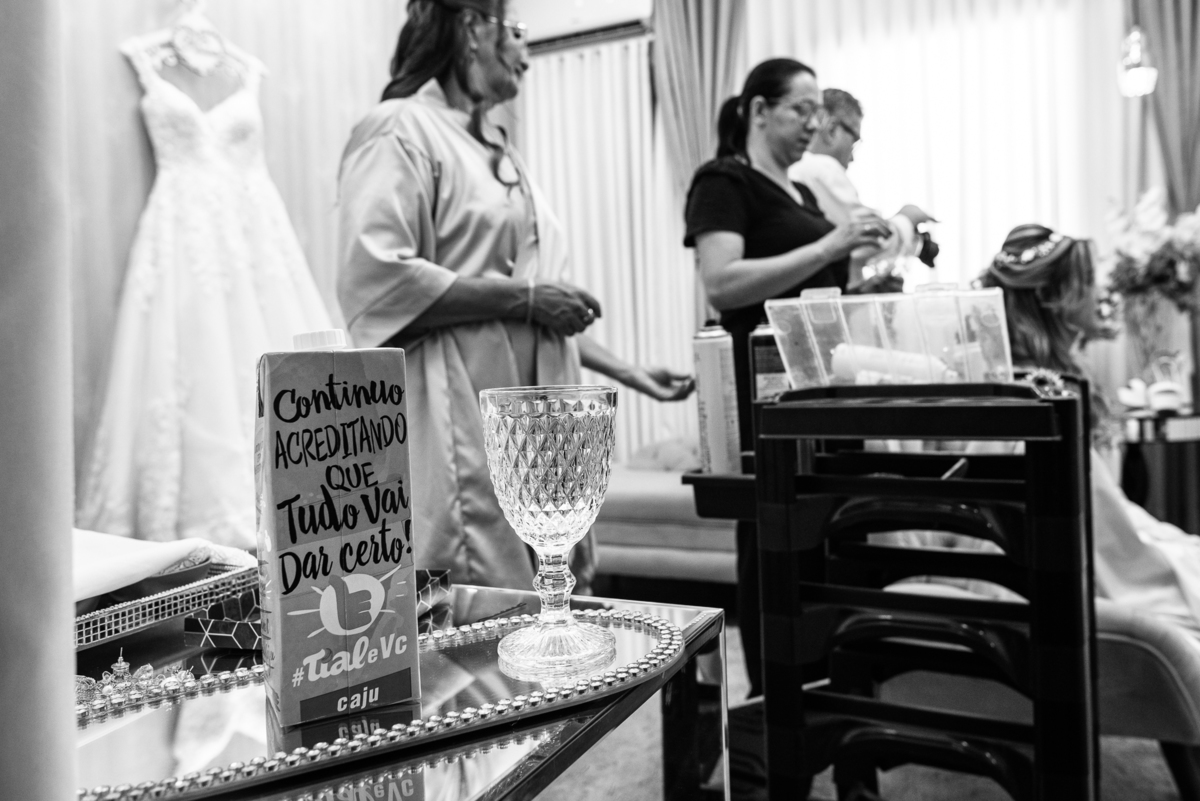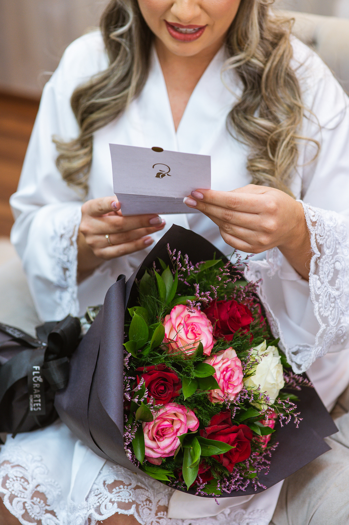 Conforme os minutos passavam, a produção caminhava e a hora de irmos para o local da celebração estava cada vez mais perto. Enquanto Elisama se preparava, o noivo também estava se arrumando. Ele optou por fazer seu making of na barbearia junto com alguns padrinhos. Fez todo um penteado especial, cuidou de cada detalhe na barba e caprichou na escolha do terno. Ele também estava ansioso pela chegada da hora, do momento de ir para a cerimônia. A noiva estava quase pronta. Seu penteado foi tomando forma enquanto a equipe preparava o brinde. Enquanto aguardávamos, Lívio preparou uma surpresa para ela. Além do buquê belíssimo que ela iria carregar, ele enviou um outro buquê de rosas com um bilhetinho que a fez desabar em lágrimas ao ler.