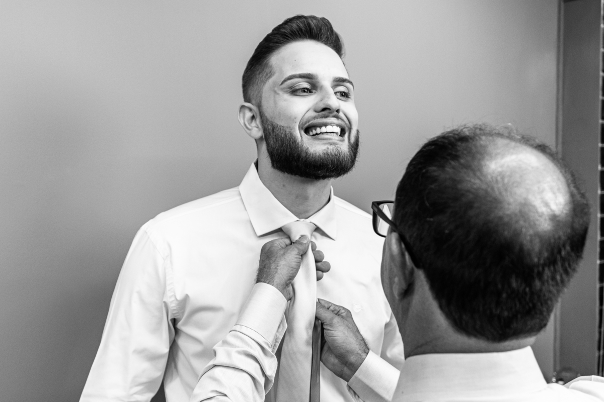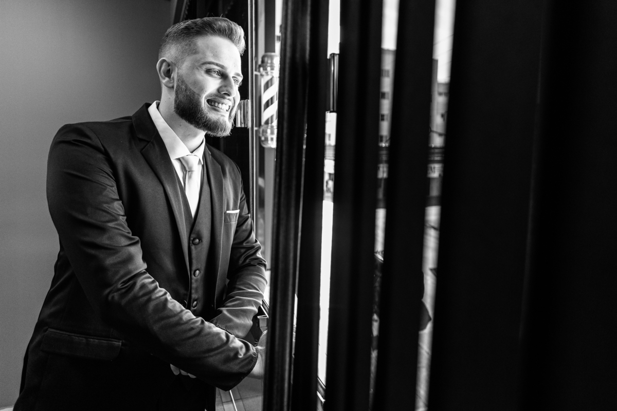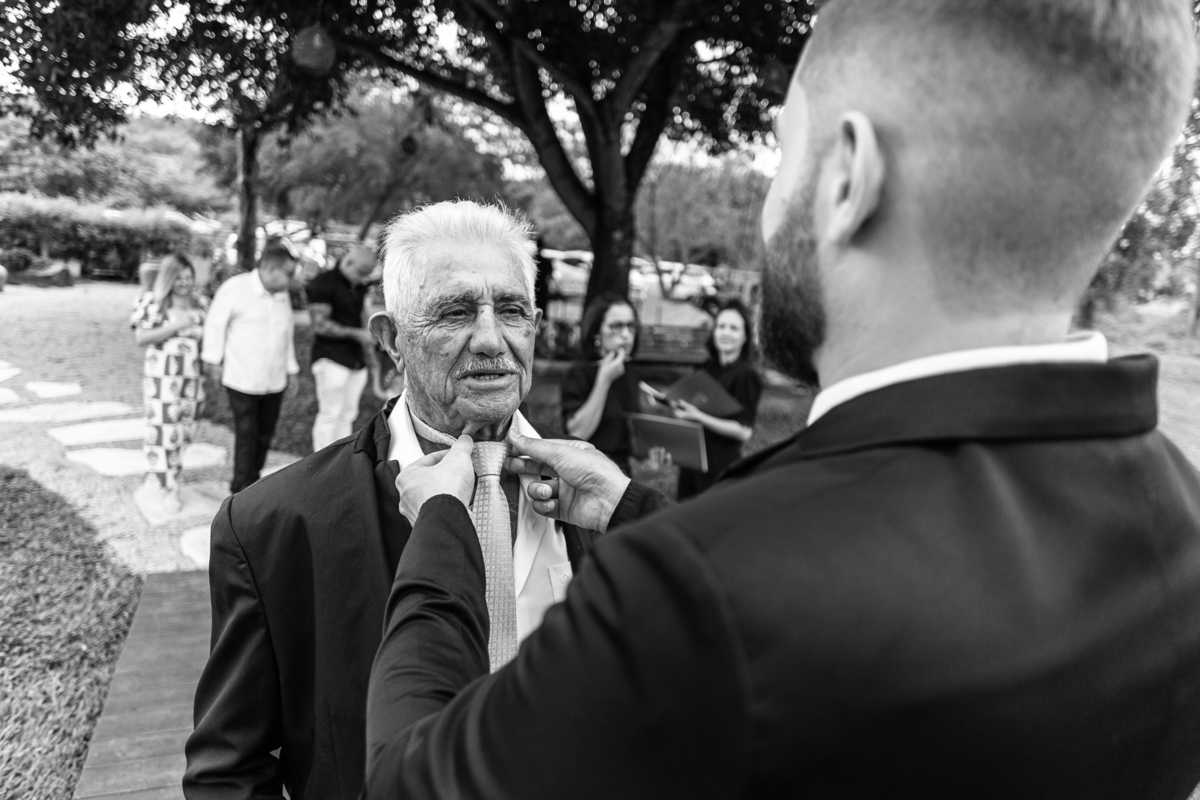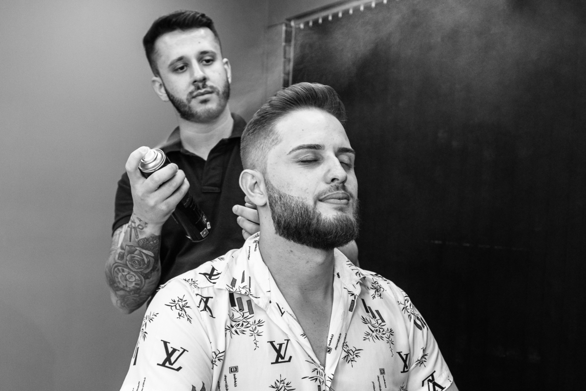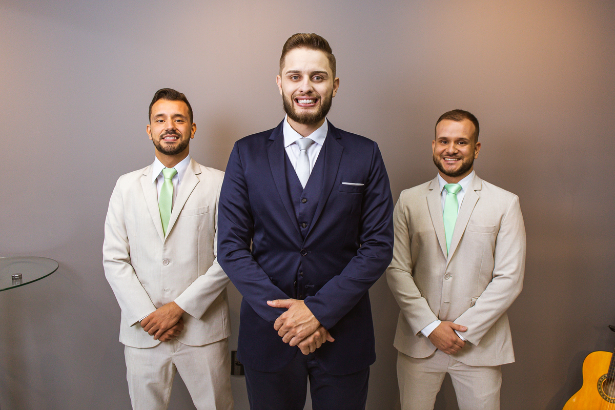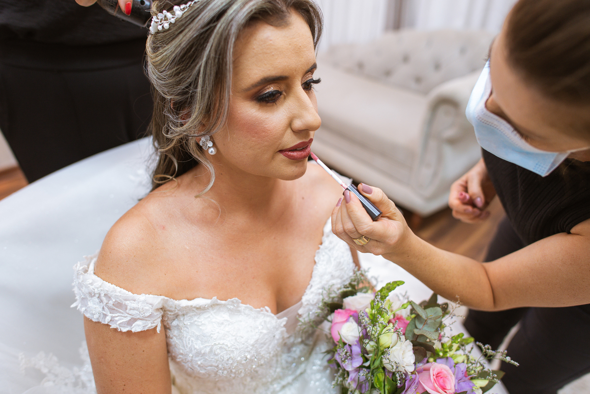 Conforme os minutos passavam, a produção caminhava e a hora de irmos para o local da celebração estava cada vez mais perto. Enquanto Elisama se preparava, o noivo também estava se arrumando. Ele optou por fazer seu making of na barbearia junto com alguns padrinhos. Fez todo um penteado especial, cuidou de cada detalhe na barba e caprichou na escolha do terno. Ele também estava ansioso pela chegada da hora, do momento de ir para a cerimônia. A noiva estava quase pronta. Seu penteado foi tomando forma enquanto a equipe preparava o brinde. Enquanto aguardávamos, Lívio preparou uma surpresa para ela. Além do buquê belíssimo que ela iria carregar, ele enviou um outro buquê de rosas com um bilhetinho que a fez desabar em lágrimas ao ler.