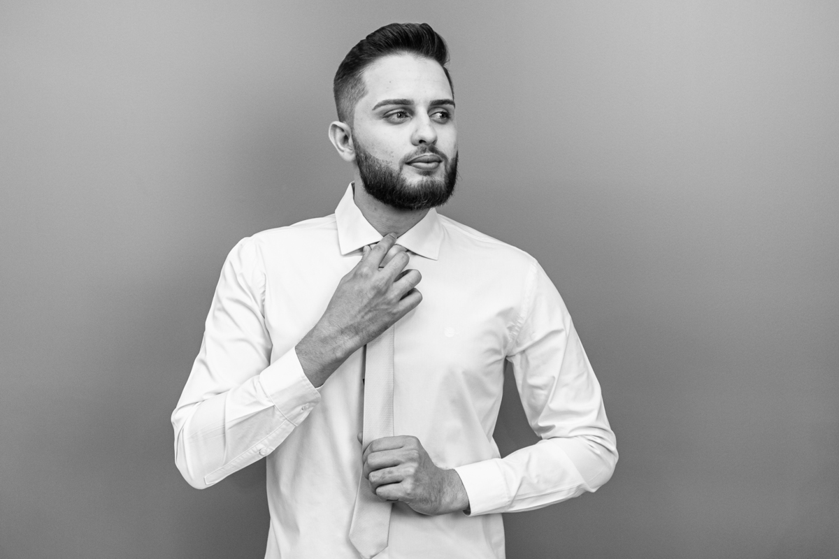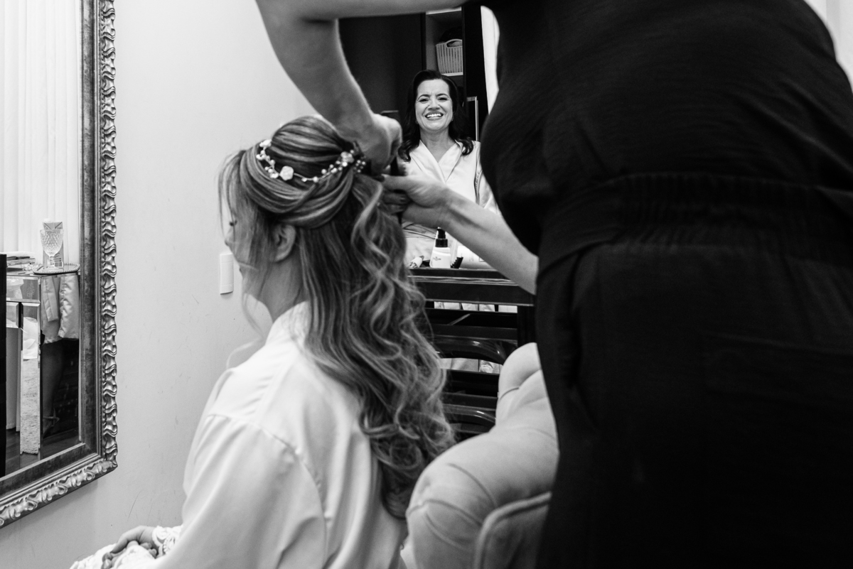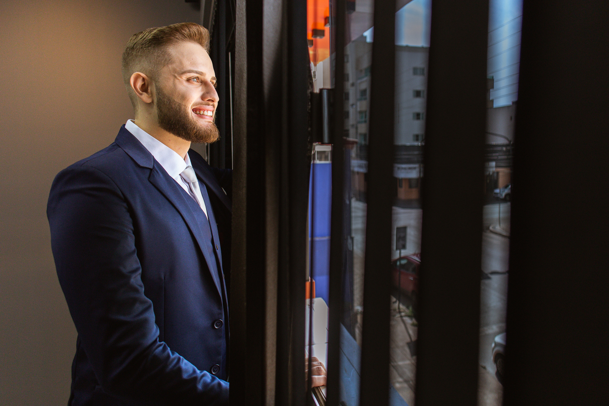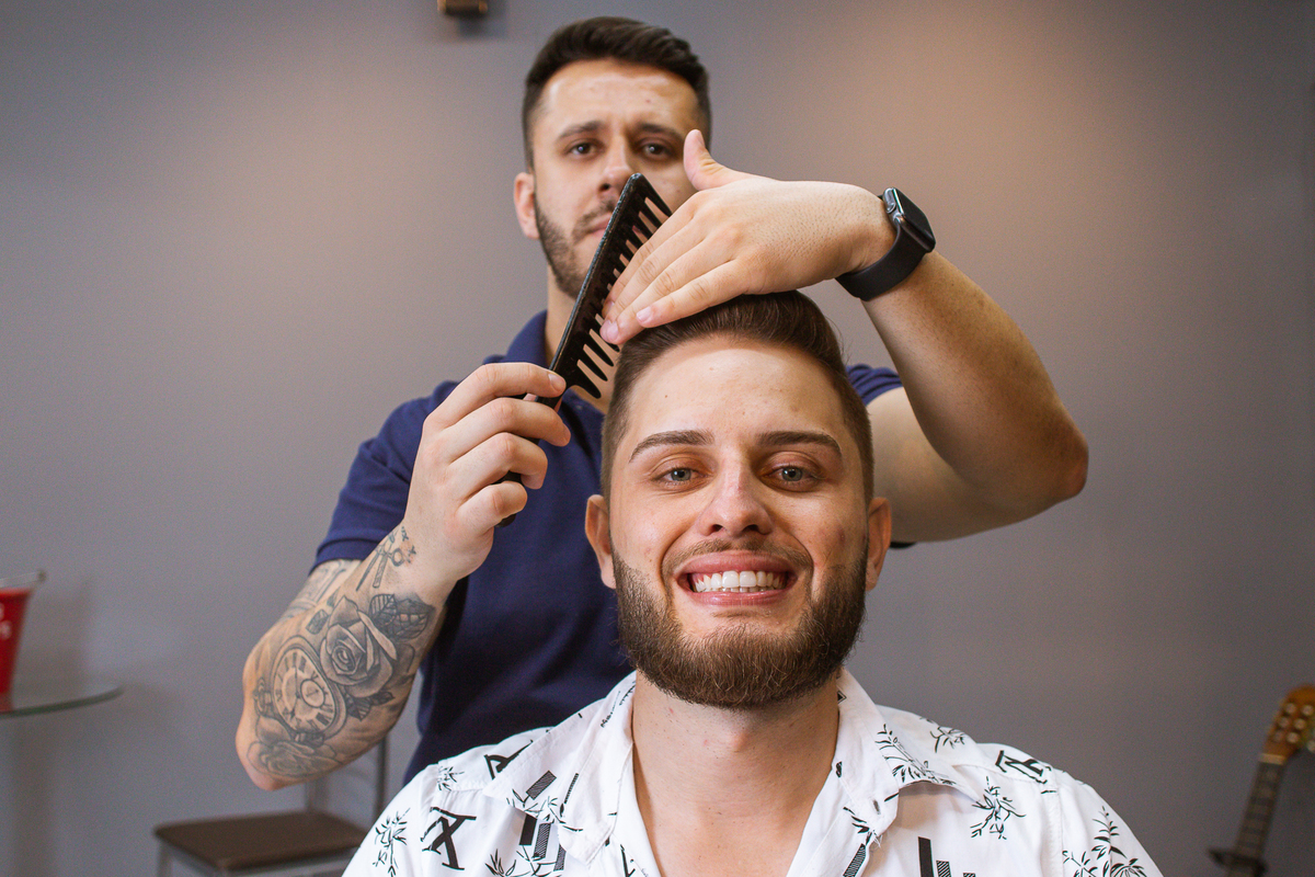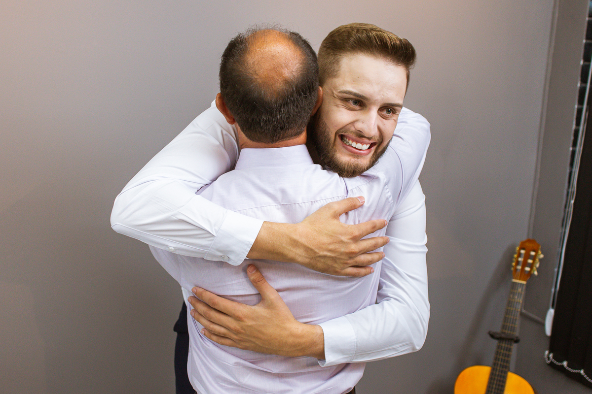 Conforme os minutos passavam, a produção caminhava e a hora de irmos para o local da celebração estava cada vez mais perto. Enquanto Elisama se preparava, o noivo também estava se arrumando. Ele optou por fazer seu making of na barbearia junto com alguns padrinhos. Fez todo um penteado especial, cuidou de cada detalhe na barba e caprichou na escolha do terno. Ele também estava ansioso pela chegada da hora, do momento de ir para a cerimônia. A noiva estava quase pronta. Seu penteado foi tomando forma enquanto a equipe preparava o brinde. Enquanto aguardávamos, Lívio preparou uma surpresa para ela. Além do buquê belíssimo que ela iria carregar, ele enviou um outro buquê de rosas com um bilhetinho que a fez desabar em lágrimas ao ler.