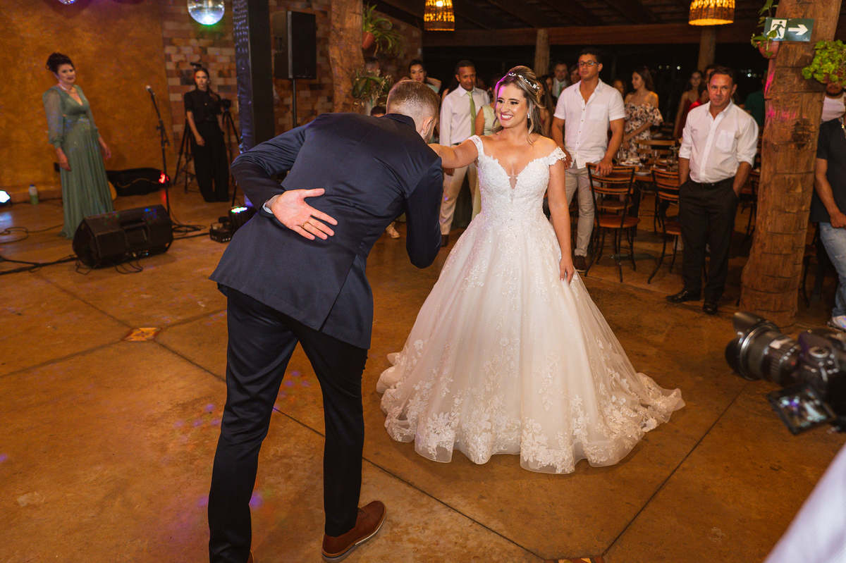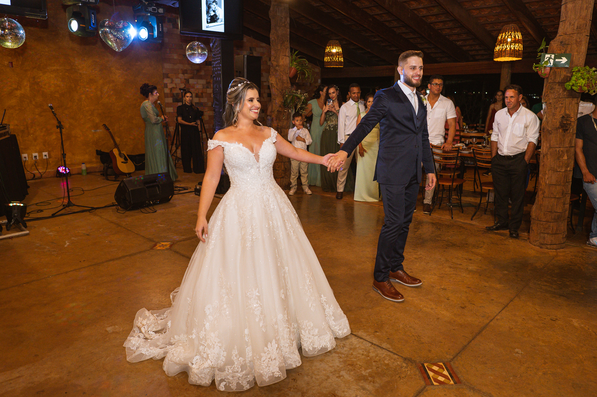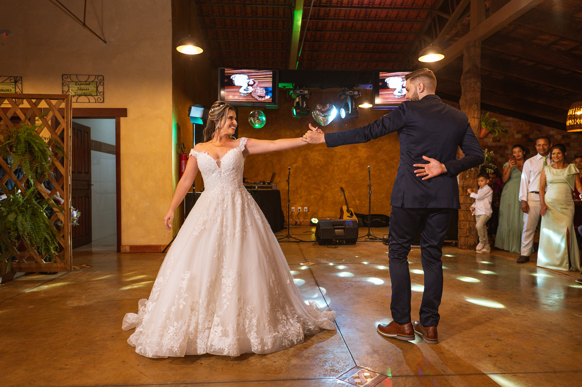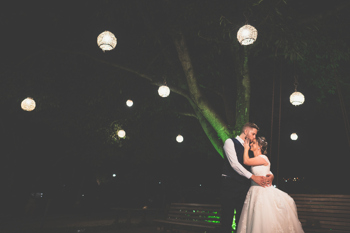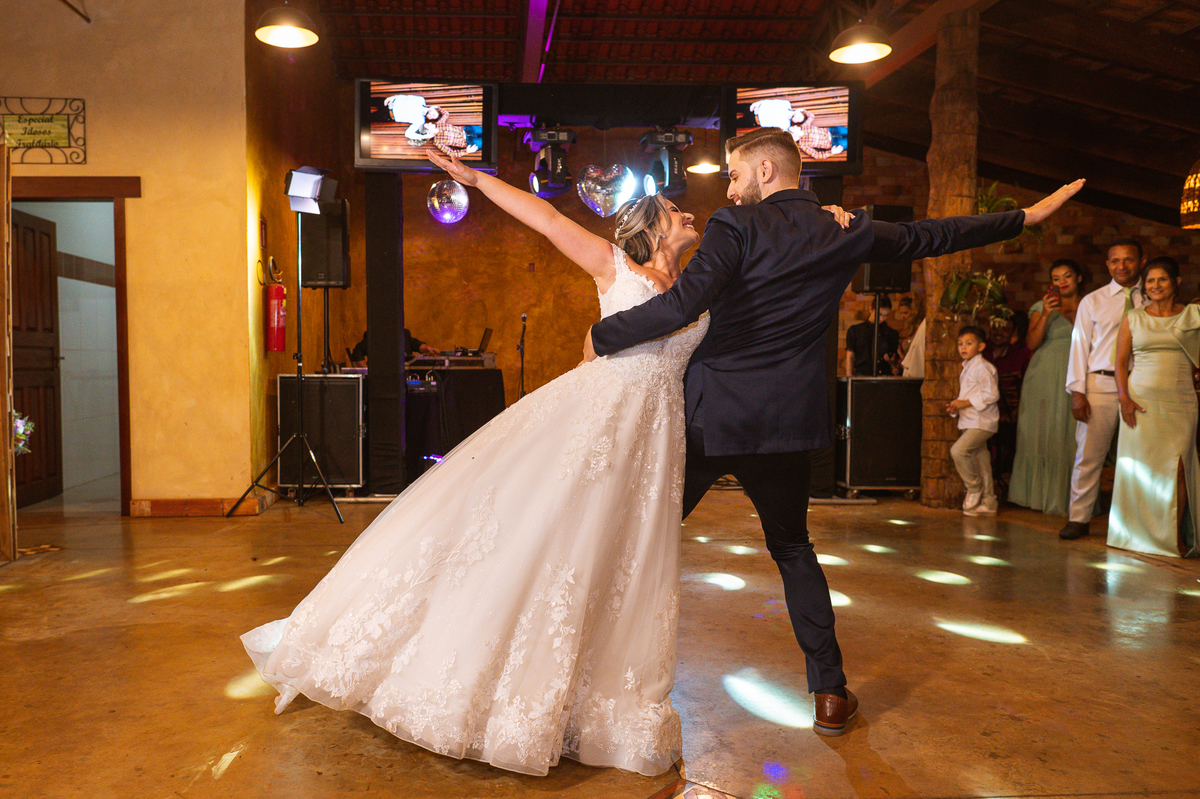 Agora, era chegada a hora da entrada deles no salão. Lívio e Elisama entraram e foram recepcionados pelos convidados com muitas palmas e alegria. Eles prepararam também uma dança muito romântica para apresentar aos convidados. E olha que tiveram até aula particular para não errar nenhum passo e fizeram tudo caprichado. Foi uma apresentação impecável e com final espetacular. Os recém-casados cumprimentaram os seus convidados e foram curtir a festa. Entre dança, curtição e muita alegria, antes de finalizarmos o trabalho, Elisama e Lívio nos solicitaram algumas fotos nas luzinhas da decoração do local que ficavam do lado de fora do restaurante. Prontamente, atendemos seu pedido. Fizemos um pequeno ensaio dos dois e finalizamos o nosso trabalho com a certeza que fechamos com chave de ouro.