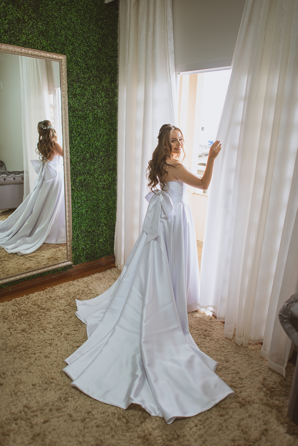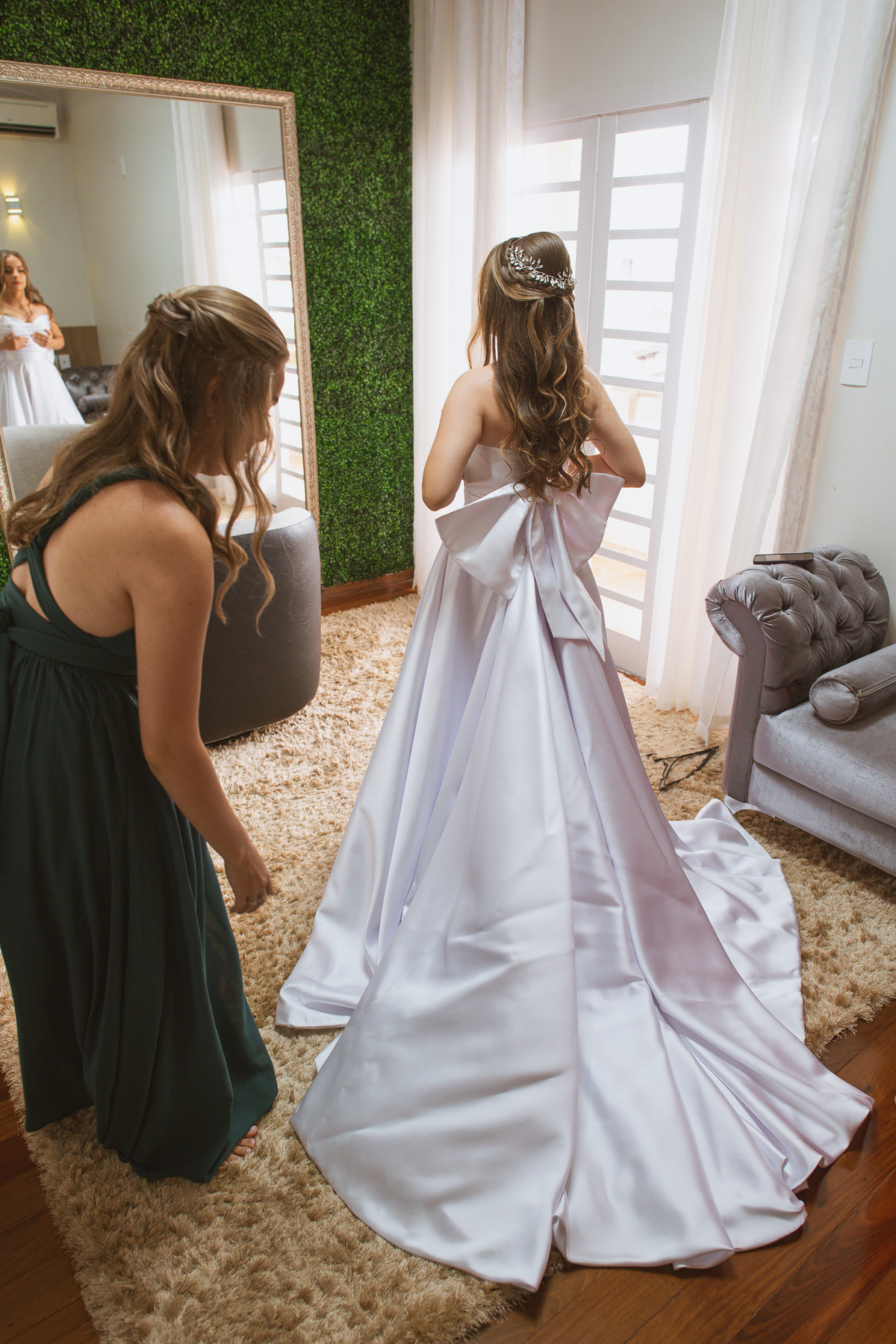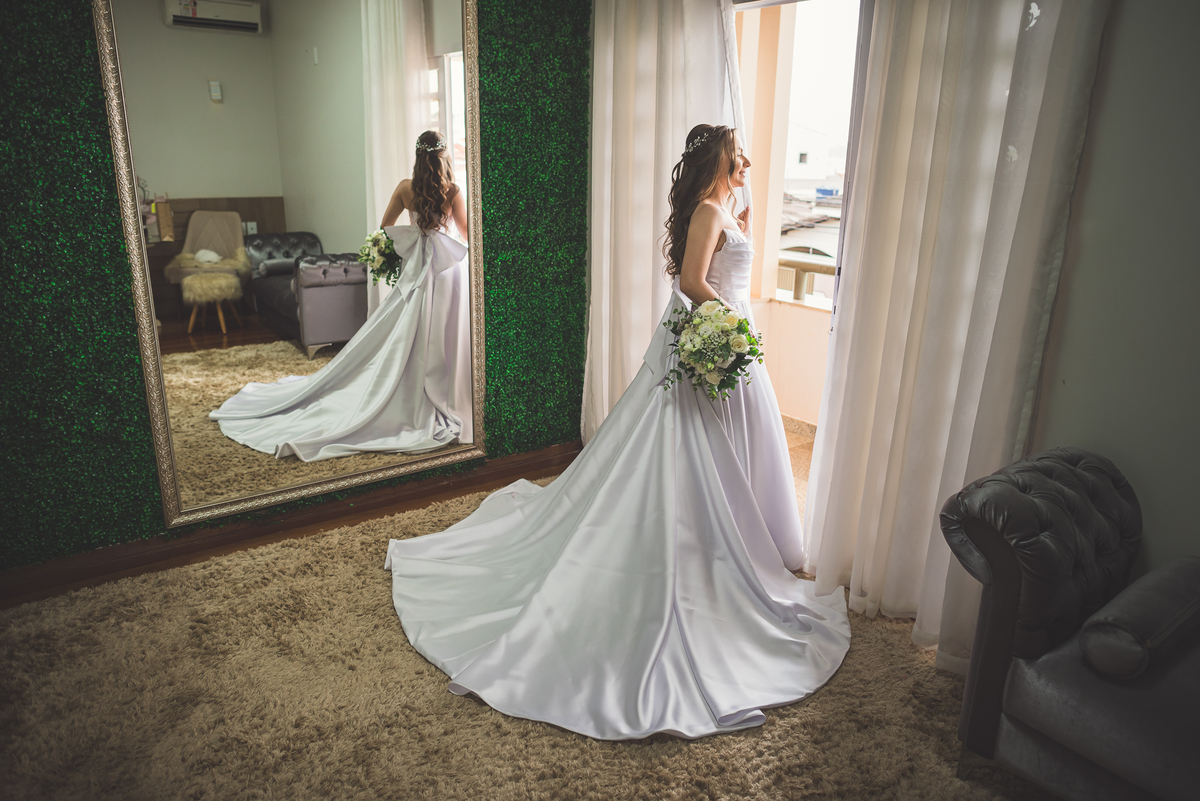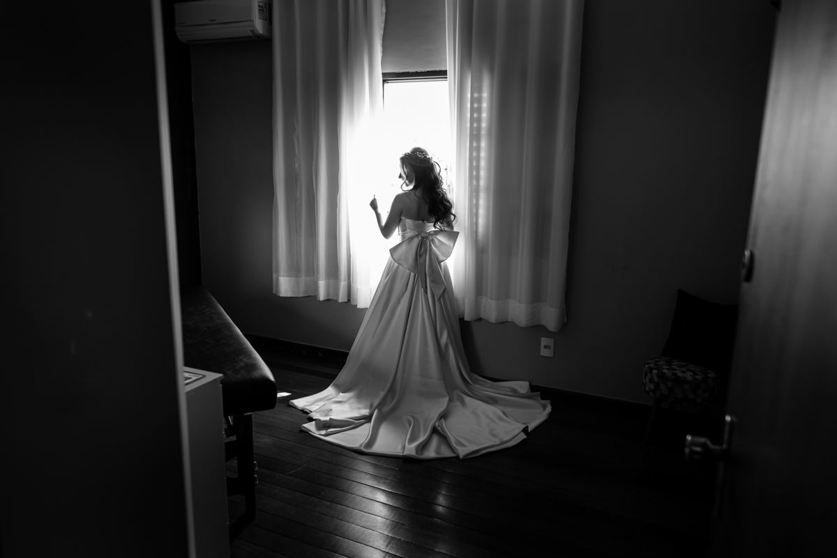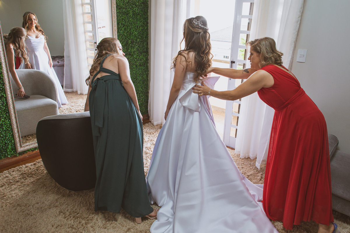 Sua mãe e sua irmã estavam presentes com ela. A emoção das três era visível, mas a sua irmã parecia estar mais agitada que a noiva em si. Fizemos algumas fotos da mamãe com a noiva, com a irmã da noiva e com as três juntas. Era perceptível o carinho e a união entre elas. Vocês verão nas fotos e vídeos como elas tem um carinho todo especial uma pela outra. O vestido, assinado pela Hermanas Noivas estava lá pendurado. Eduarda fez uma escolha sensacional, e era a primeira vez que o vestido seria colocado. A cada minuto que passava, a produção caminhava. Eduarda estava linda, alisou suas madeixas e preparou um penteado semi preso lindíssimo para o seu grande dia. Fizemos nossos retratos e já estava na hora da noiva se vestir.