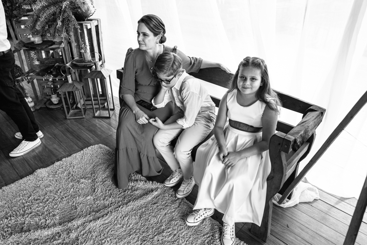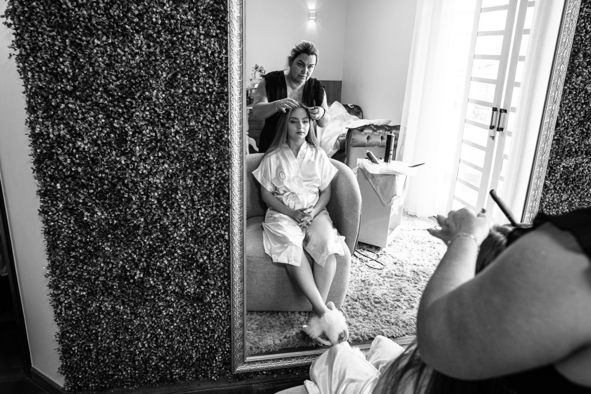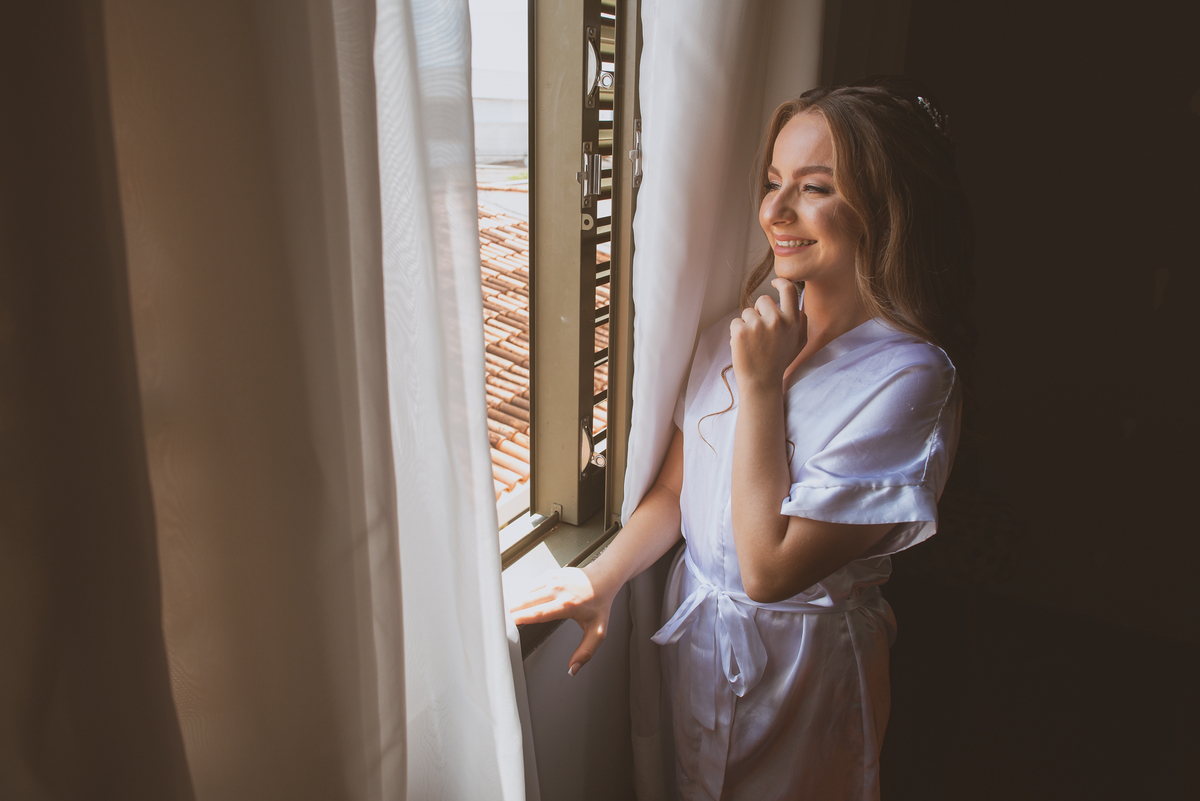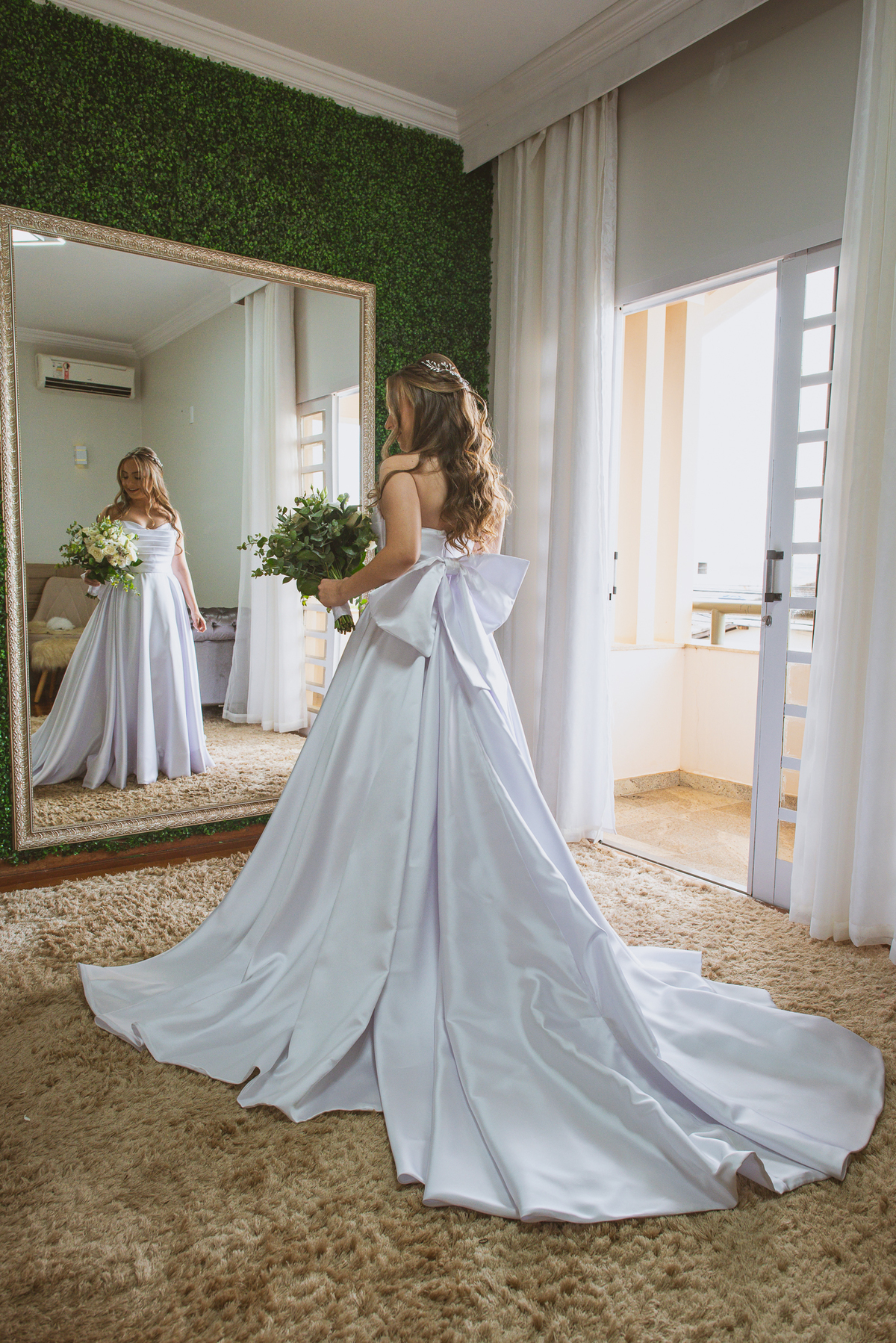 Sua mãe e sua irmã estavam presentes com ela. A emoção das três era visível, mas a sua irmã parecia estar mais agitada que a noiva em si. Fizemos algumas fotos da mamãe com a noiva, com a irmã da noiva e com as três juntas. Era perceptível o carinho e a união entre elas. Vocês verão nas fotos e vídeos como elas tem um carinho todo especial uma pela outra. O vestido, assinado pela Hermanas Noivas estava lá pendurado. Eduarda fez uma escolha sensacional, e era a primeira vez que o vestido seria colocado. A cada minuto que passava, a produção caminhava. Eduarda estava linda, alisou suas madeixas e preparou um penteado semi preso lindíssimo para o seu grande dia. Fizemos nossos retratos e já estava na hora da noiva se vestir.