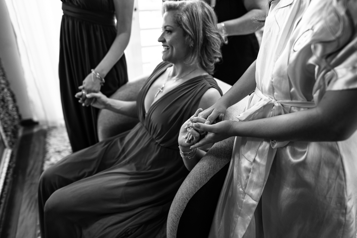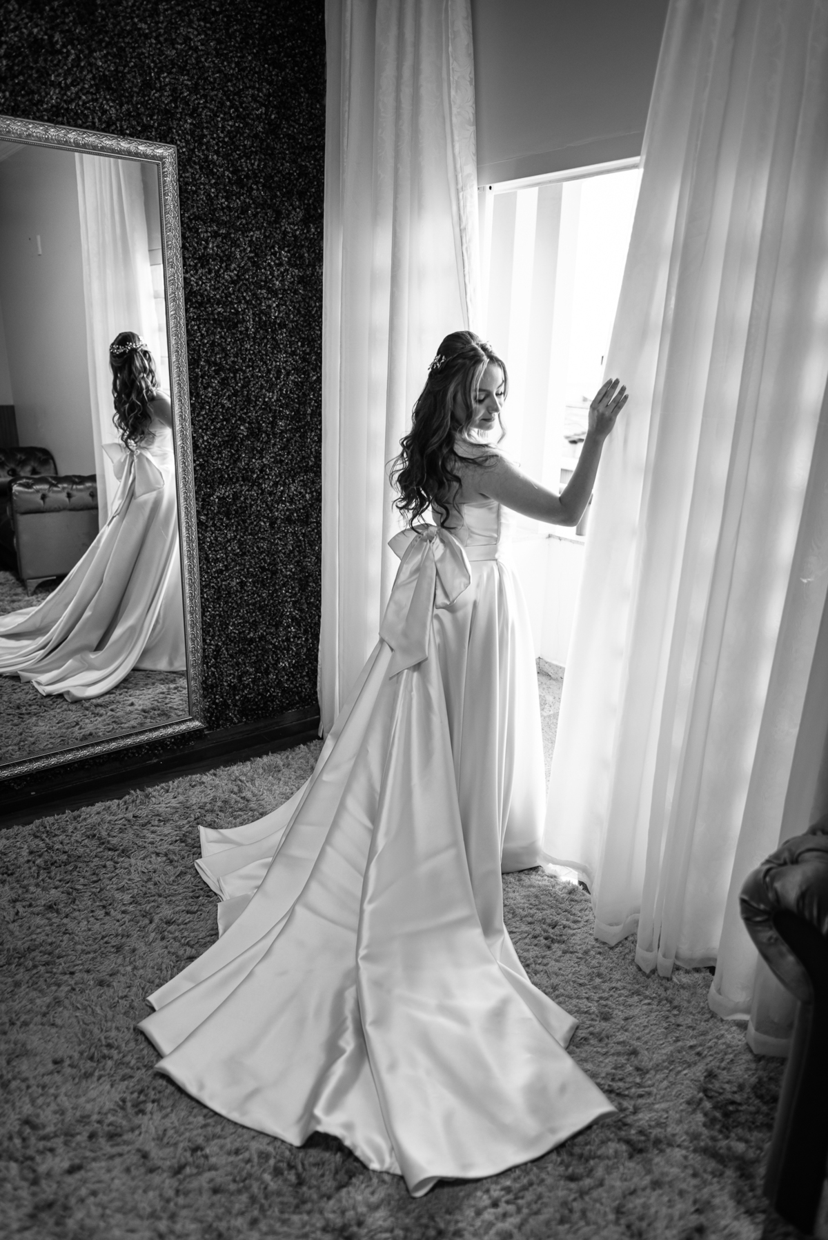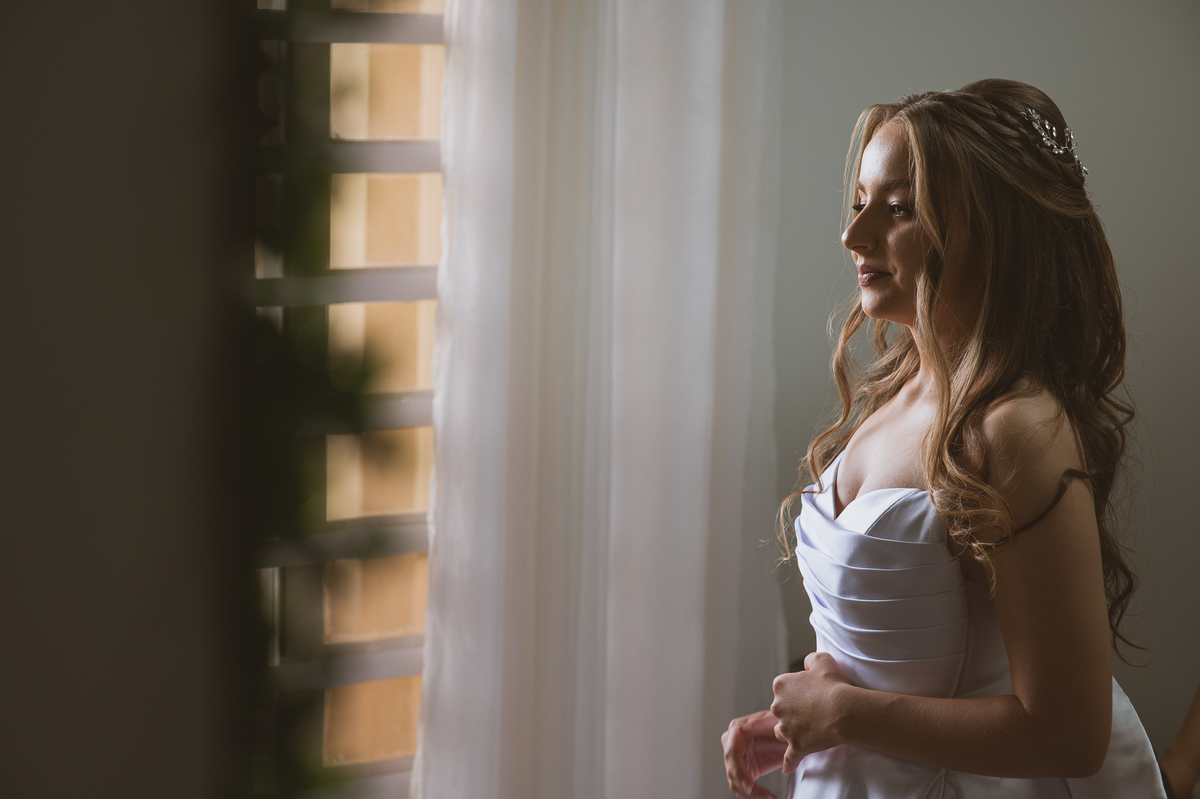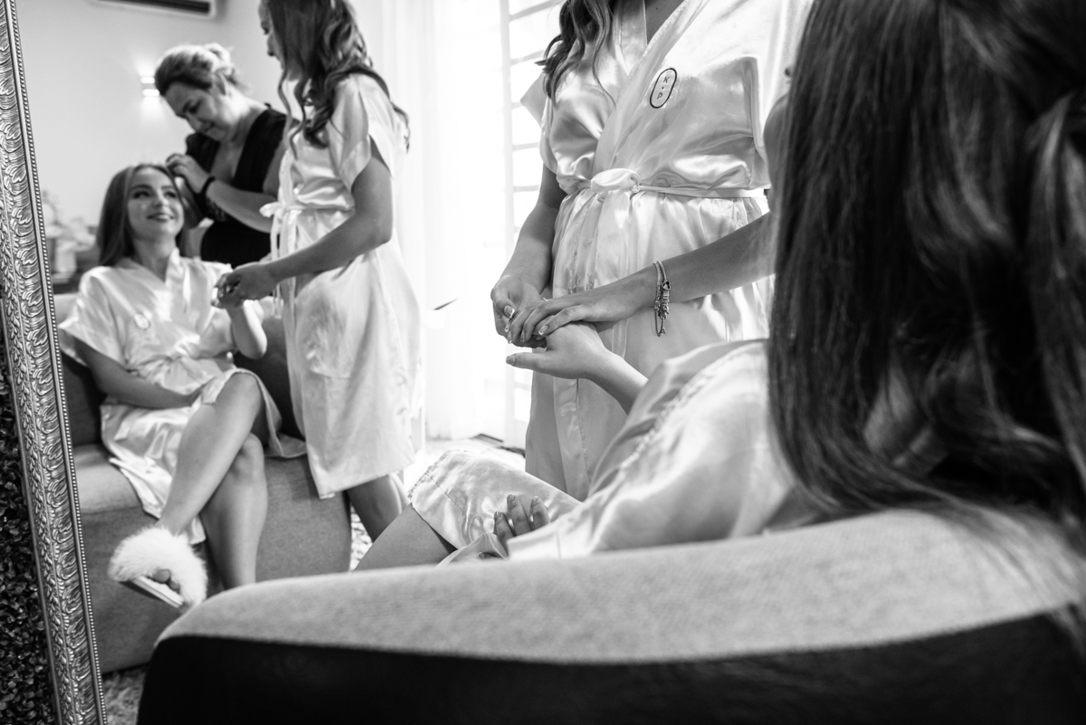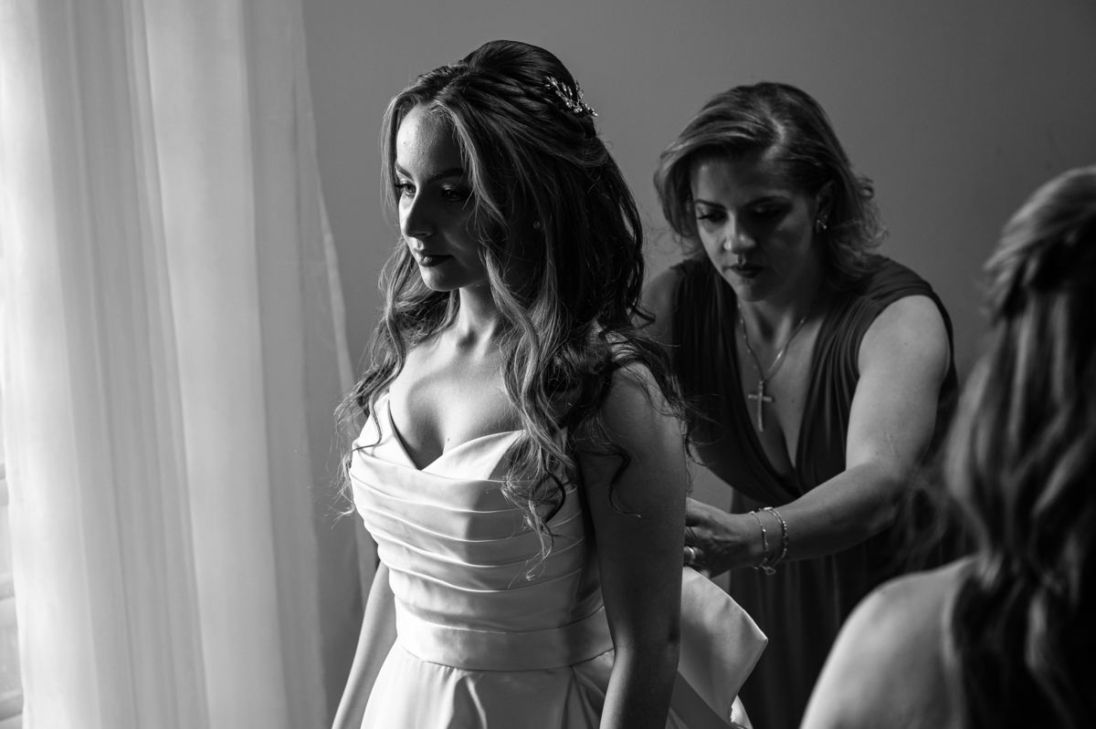 Sua mãe e sua irmã estavam presentes com ela. A emoção das três era visível, mas a sua irmã parecia estar mais agitada que a noiva em si. Fizemos algumas fotos da mamãe com a noiva, com a irmã da noiva e com as três juntas. Era perceptível o carinho e a união entre elas. Vocês verão nas fotos e vídeos como elas tem um carinho todo especial uma pela outra. O vestido, assinado pela Hermanas Noivas estava lá pendurado. Eduarda fez uma escolha sensacional, e era a primeira vez que o vestido seria colocado. A cada minuto que passava, a produção caminhava. Eduarda estava linda, alisou suas madeixas e preparou um penteado semi preso lindíssimo para o seu grande dia. Fizemos nossos retratos e já estava na hora da noiva se vestir.