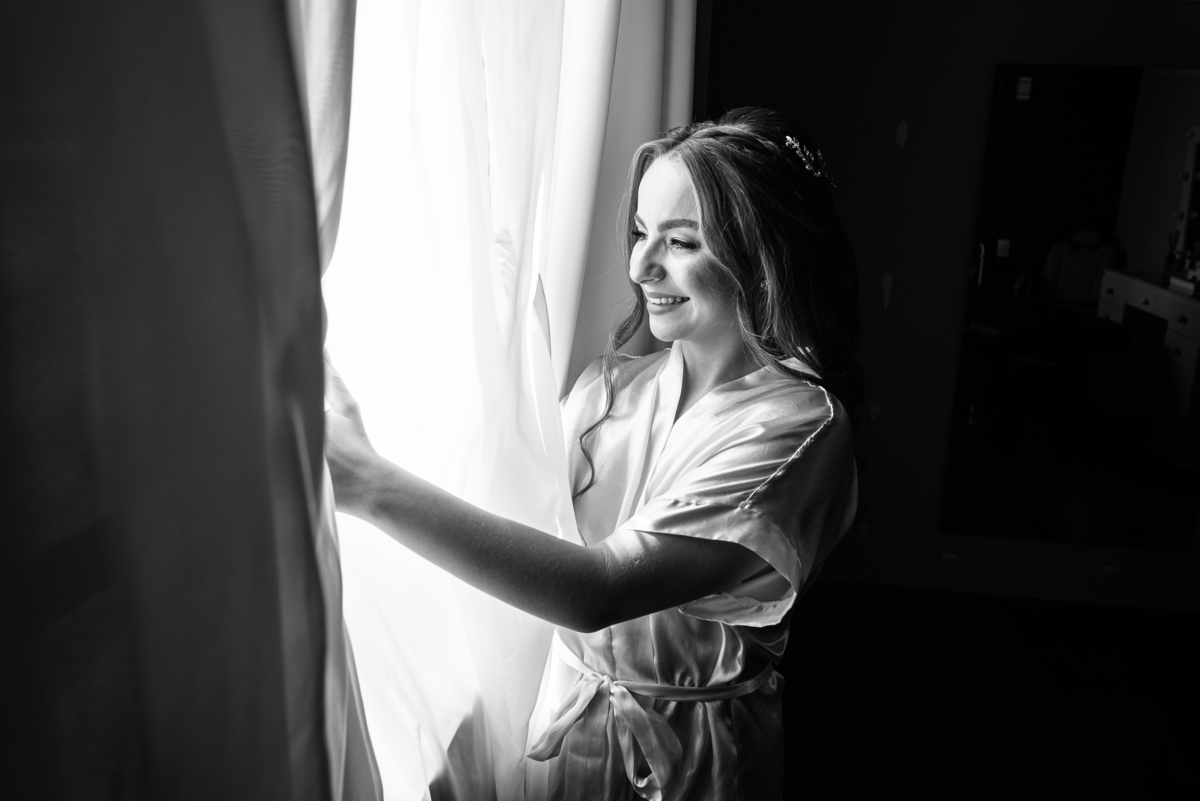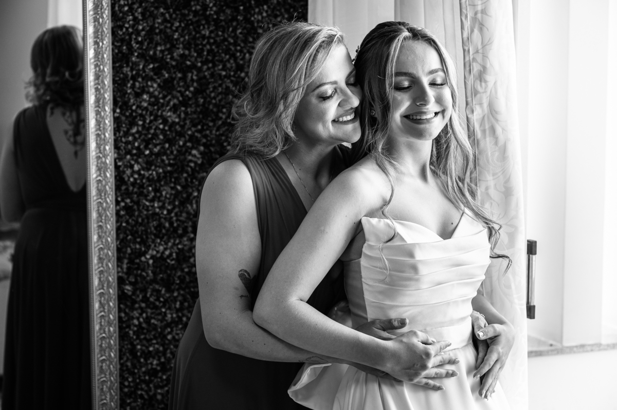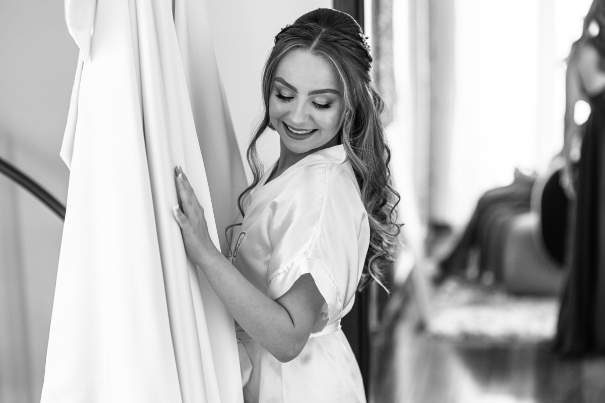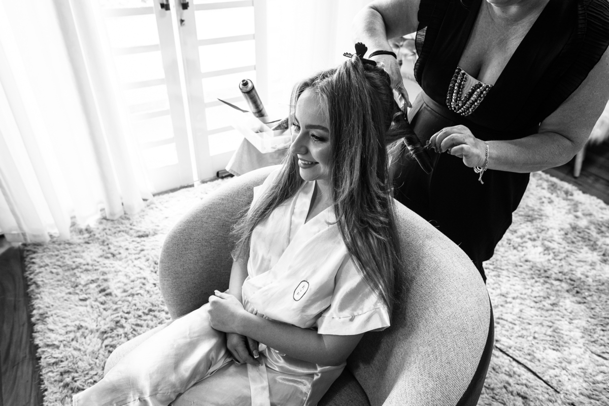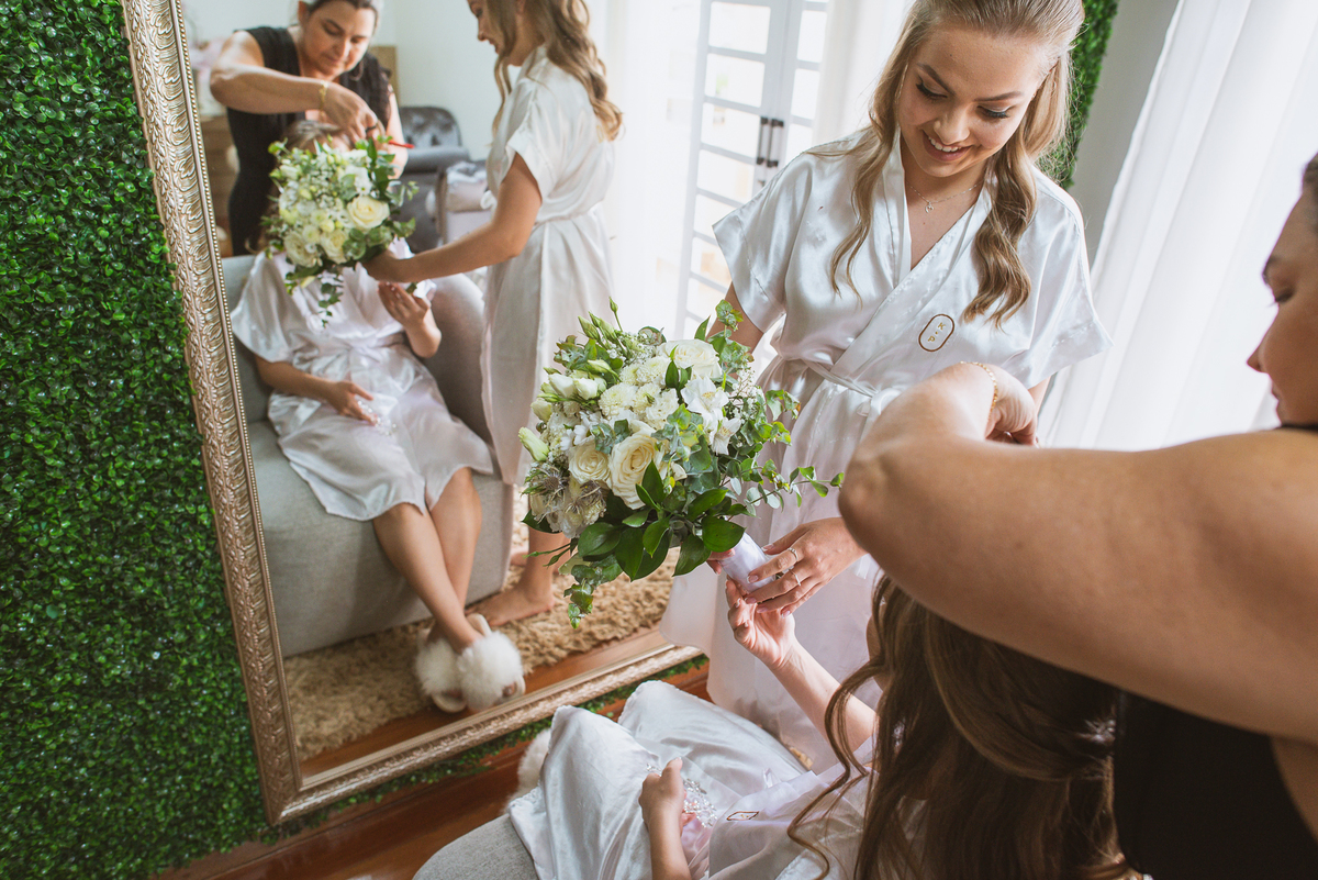 Sua mãe e sua irmã estavam presentes com ela. A emoção das três era visível, mas a sua irmã parecia estar mais agitada que a noiva em si. Fizemos algumas fotos da mamãe com a noiva, com a irmã da noiva e com as três juntas. Era perceptível o carinho e a união entre elas. Vocês verão nas fotos e vídeos como elas tem um carinho todo especial uma pela outra. O vestido, assinado pela Hermanas Noivas estava lá pendurado. Eduarda fez uma escolha sensacional, e era a primeira vez que o vestido seria colocado. A cada minuto que passava, a produção caminhava. Eduarda estava linda, alisou suas madeixas e preparou um penteado semi preso lindíssimo para o seu grande dia. Fizemos nossos retratos e já estava na hora da noiva se vestir.
