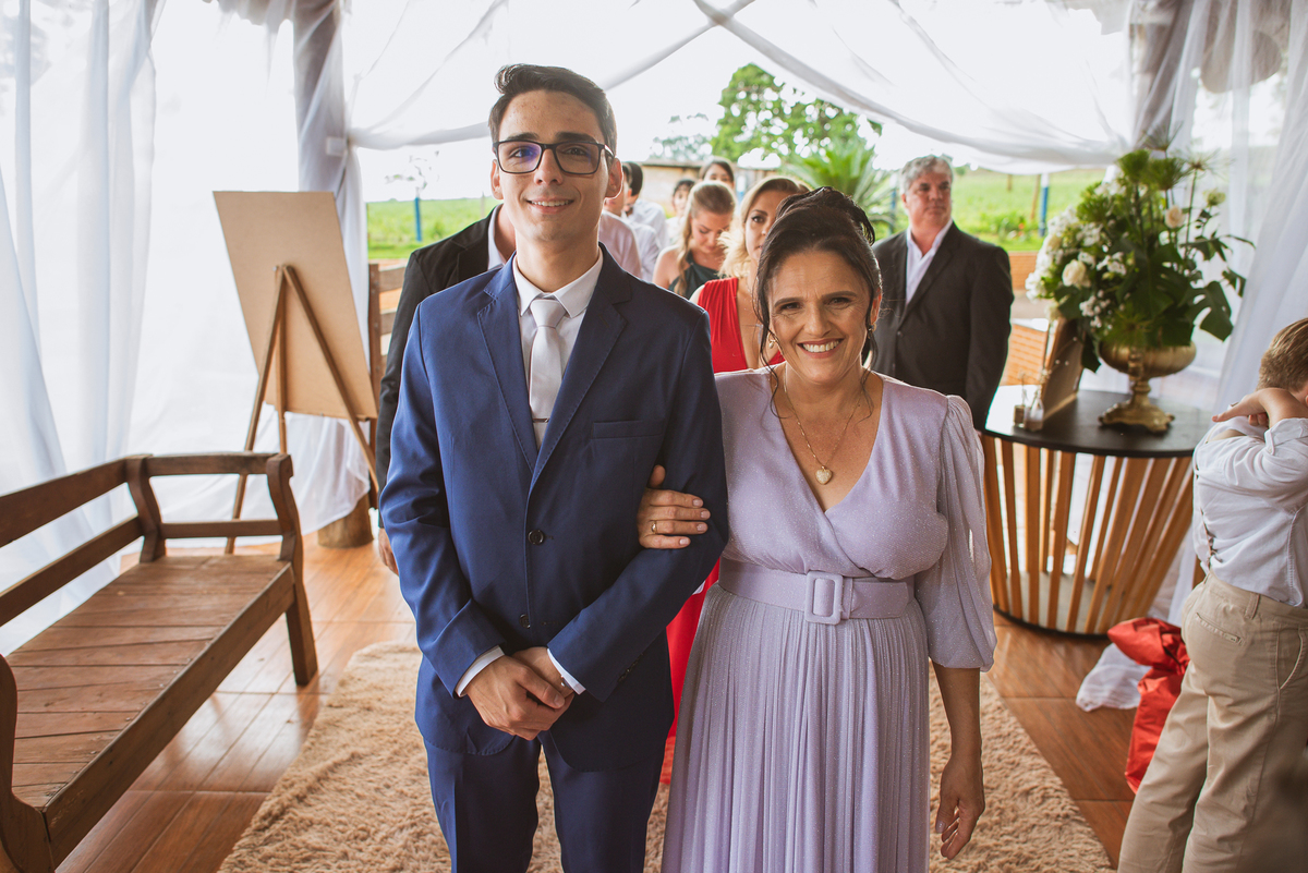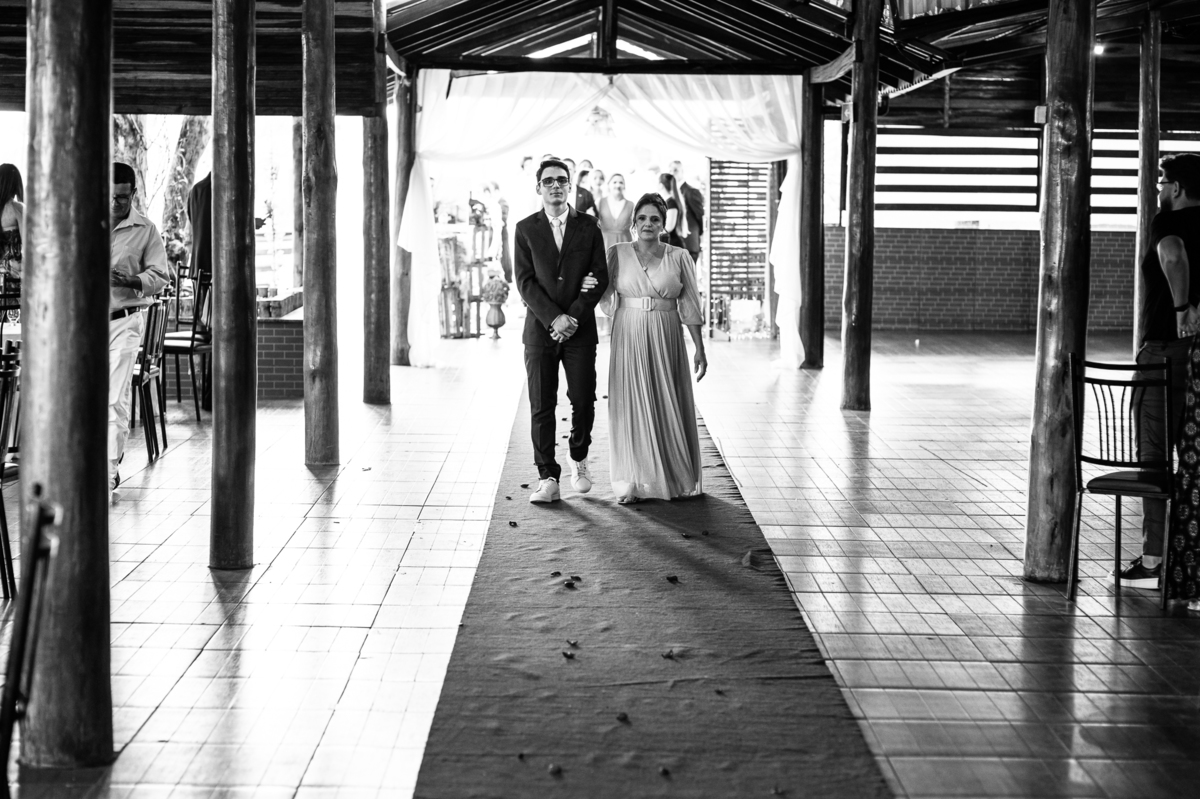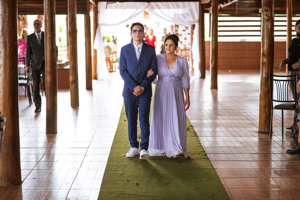 Agora, com tudo organizado e pronto, a cerimônia estava a começar. Os músicos começaram a tocar e os padrinhos foram adentrando, um por um. Eduardo entrou de braços dados com sua mãe e logo após os pais da noiva. Os avós adentraram e algumas tias deles também fizeram parte das entradas. Agora, com as cortinas fechadas, era chegada a hora mais esperada daquela tarde de sol. Eduardo estava lá, mantendo a pose firme, segurando a emoção quase que com as mãos. Do lado de fora, Eduarda também mal conseguia conter suas lágrimas. Ao descer do carro, ela já precisou de ajuda para secá-las. As cortinas se abriram, Eduarda caminhou rumo ao altar com seu pai, passo a passo. Ao olhar para trás, Eduardo estava com o rosto tomado pela emoção. Olhava para cima como se quisesse dizer: "Obrigado, Deus!" e voltava a olhar para sua noiva entrando. Por todos os lados em que se via, lágrimas sendo enxugadas por lenços e com as mãos.