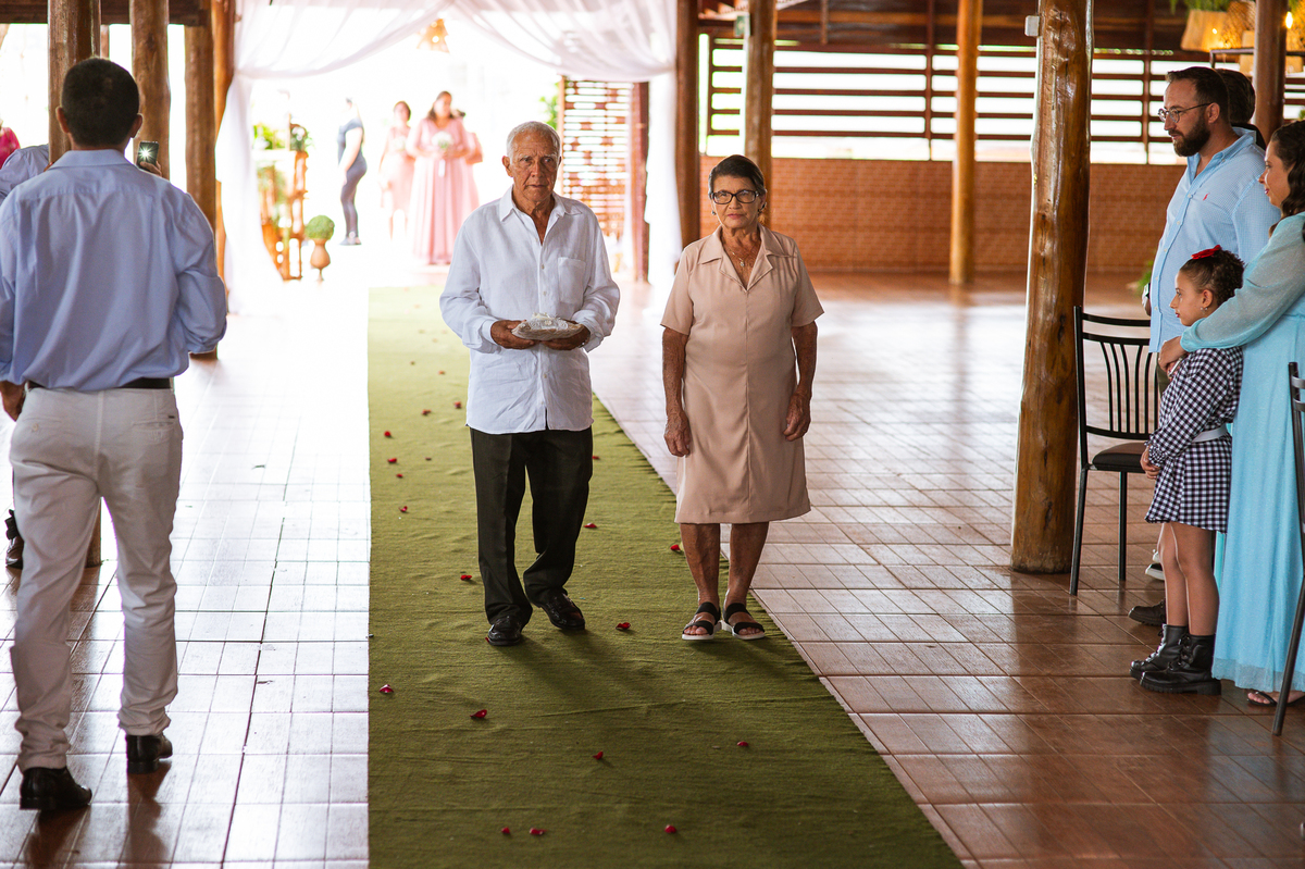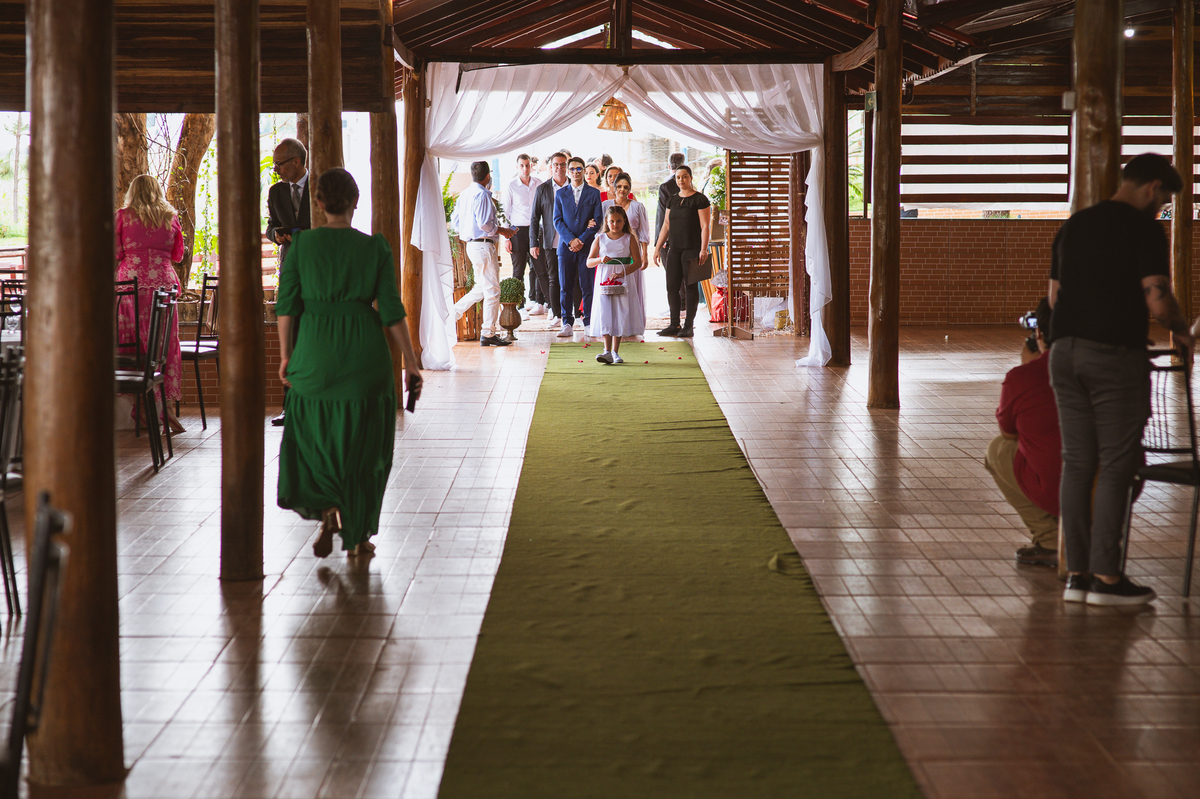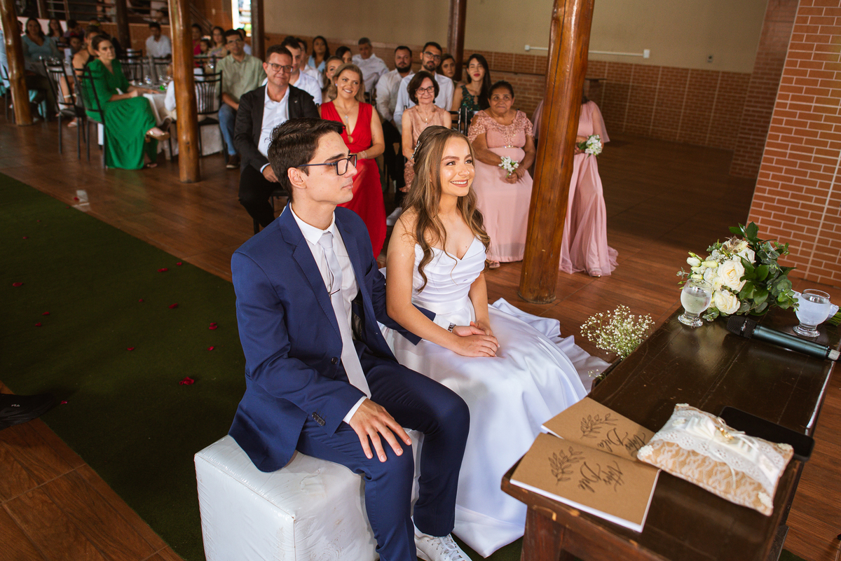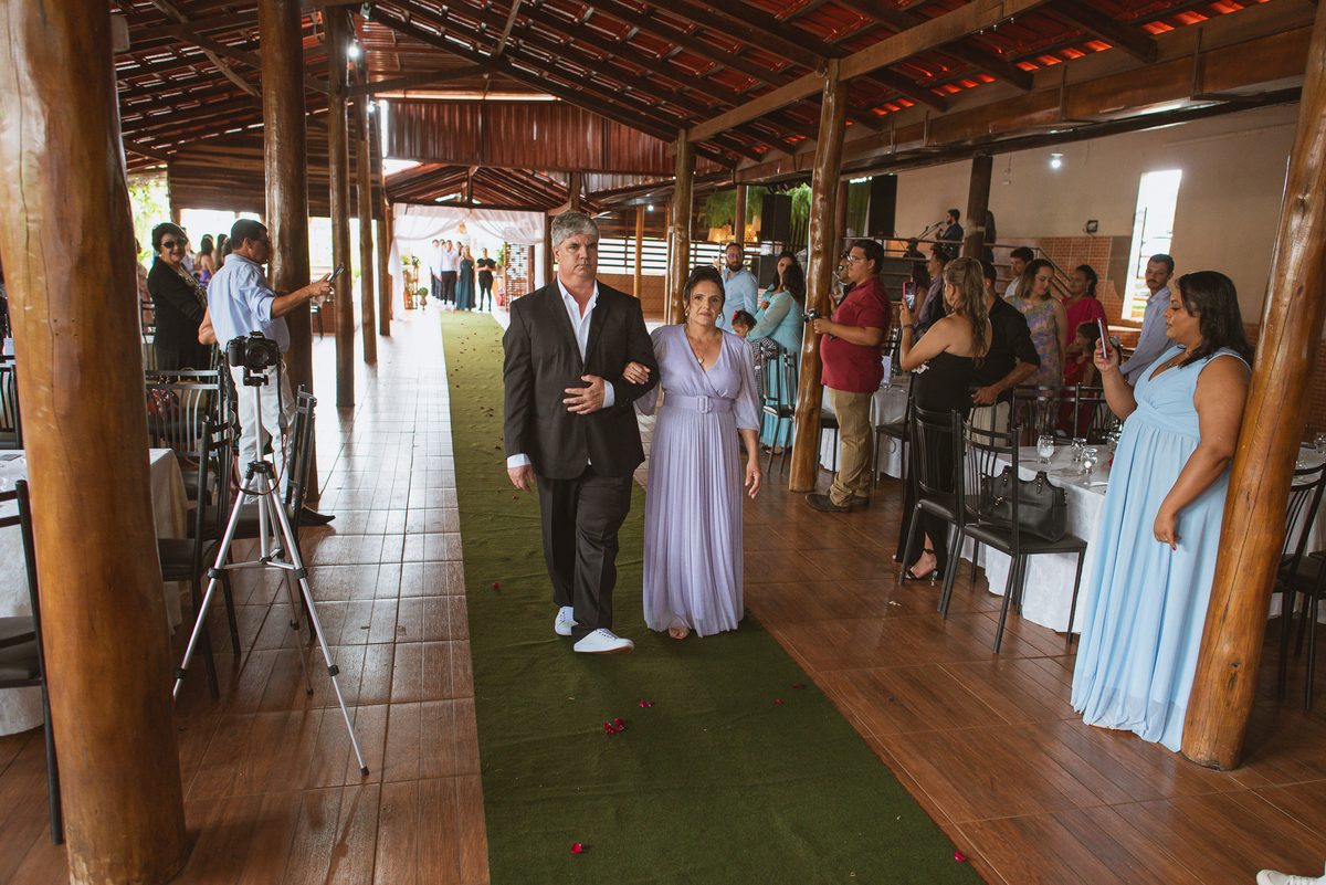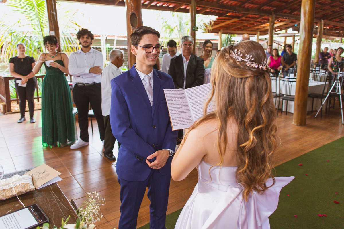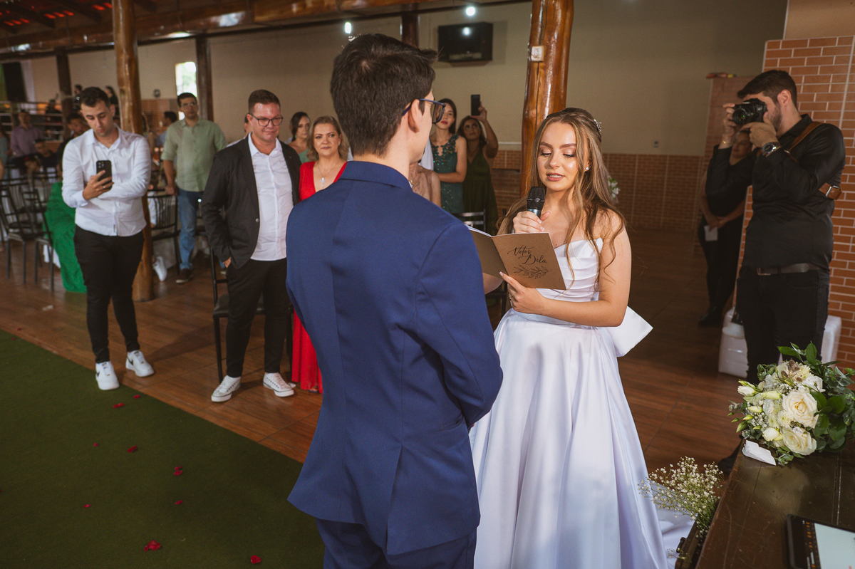 Já preparei o coração porque sabia que viriam palavras ali que os fariam se emocionar ainda mais. Dito e feito. Os votos começaram pelo noivo. Ele fez uma declaração linda pra ela. Comentou sobre como ele havia pedido a Deus uma pessoa exatamente como Eduarda. Ela, por sua vez, nos emocionou ainda mais. Disse com detalhes, tudo que havia conversado com Deus sobre o esposo desejado. Contou algumas partes engraçadas sobre o relacionamento dos dois até aquele dia e sobre todo seu sentimento de felicidade em que estava sentindo naquele momento. Eu olhei para todos os convidados que consegui, podia contar nos dedos os que não estavam chorando... Foi forte! Assim, depois de toda essa emoção novamente, eles foram declarados casados perante Deus e as testemunhas. Fizemos nossas fotos tradicionais e os padrinhos os receberam no final do corredor com bastante festa.