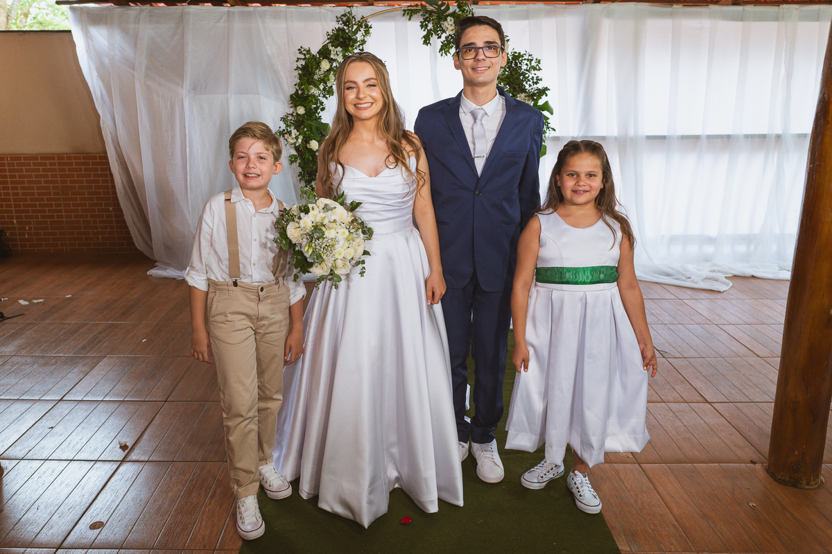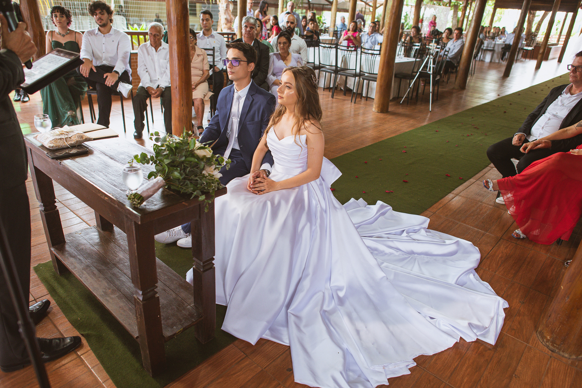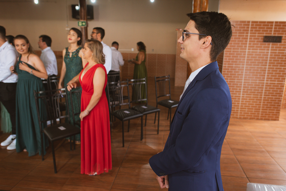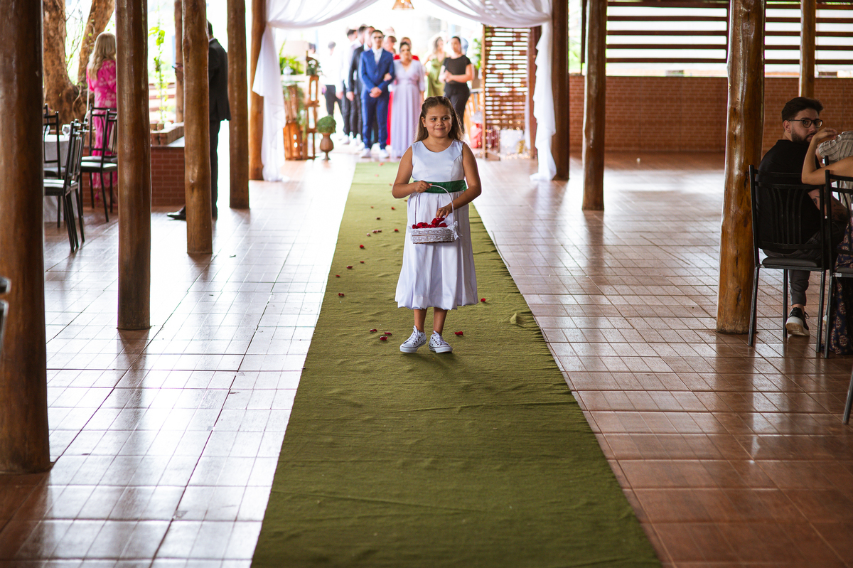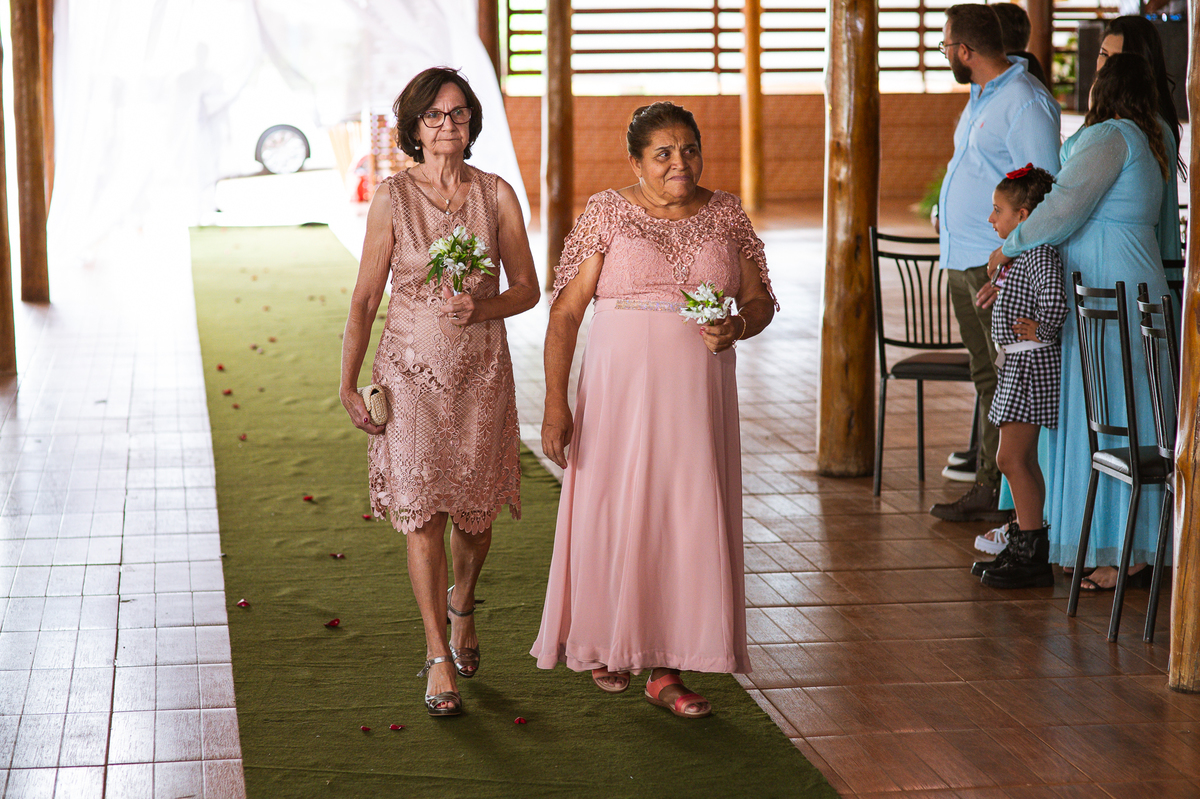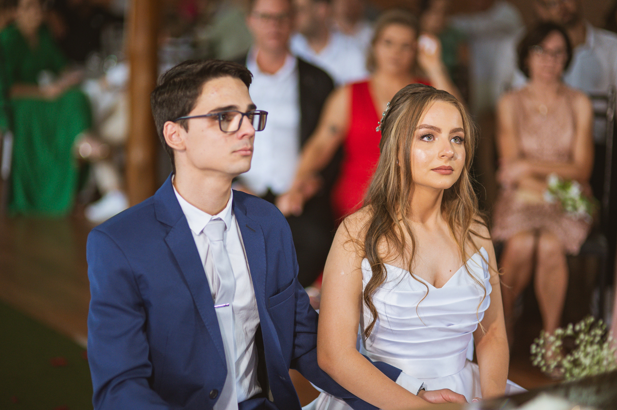 Já preparei o coração porque sabia que viriam palavras ali que os fariam se emocionar ainda mais. Dito e feito. Os votos começaram pelo noivo. Ele fez uma declaração linda pra ela. Comentou sobre como ele havia pedido a Deus uma pessoa exatamente como Eduarda. Ela, por sua vez, nos emocionou ainda mais. Disse com detalhes, tudo que havia conversado com Deus sobre o esposo desejado. Contou algumas partes engraçadas sobre o relacionamento dos dois até aquele dia e sobre todo seu sentimento de felicidade em que estava sentindo naquele momento. Eu olhei para todos os convidados que consegui, podia contar nos dedos os que não estavam chorando... Foi forte! Assim, depois de toda essa emoção novamente, eles foram declarados casados perante Deus e as testemunhas. Fizemos nossas fotos tradicionais e os padrinhos os receberam no final do corredor com bastante festa.