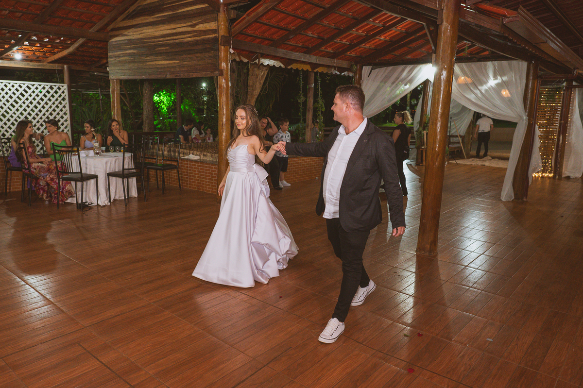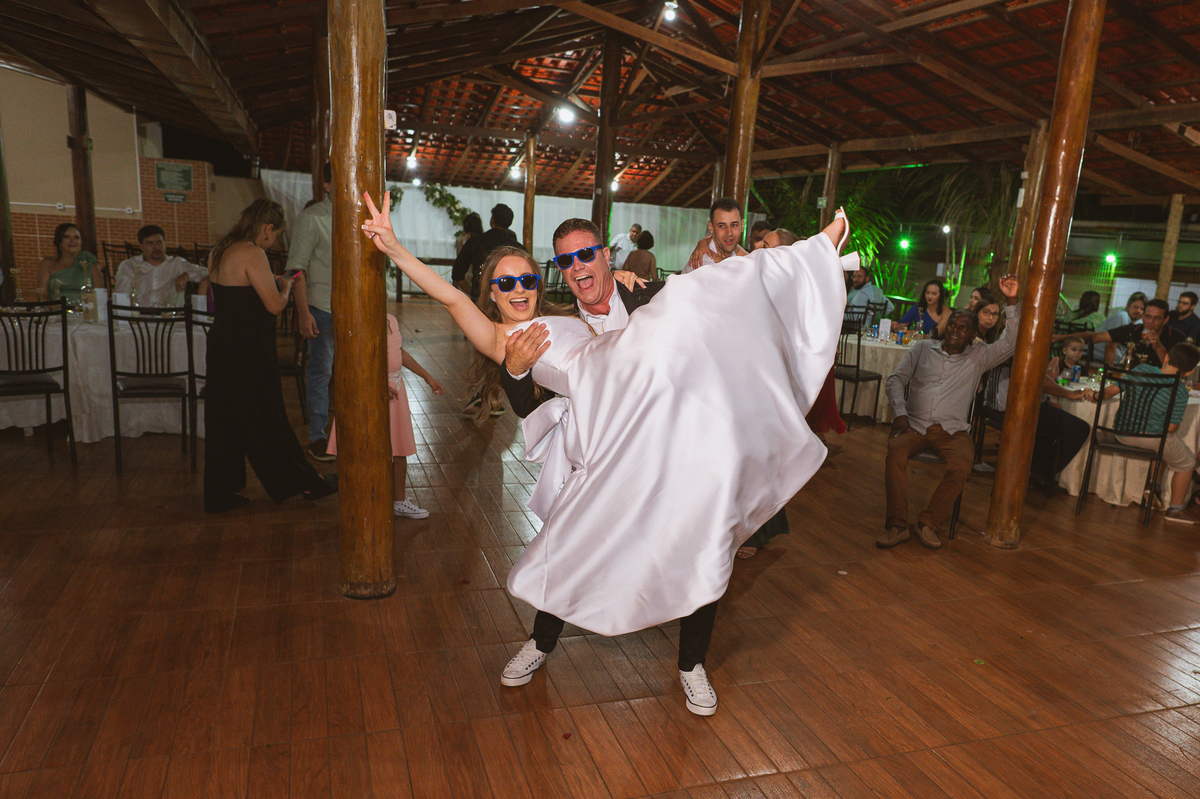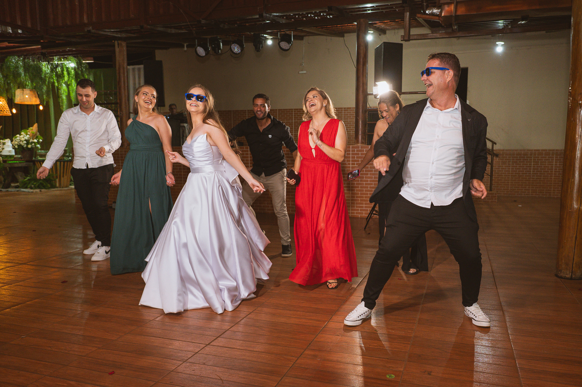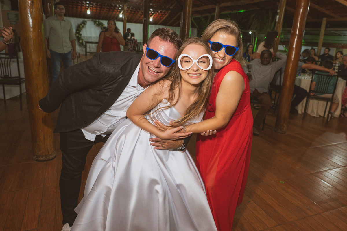 Depois da cerimônia maravilhosa que tivemos, nós realizamos um mini ensaio dos noivos. Convidamos também as madrinhas e os padrinhos para fotografar com eles. Foi muito legal contar com todos. Por fim, era chegada a hora dos noivos entrarem na festa. Além da entrada tradicional, eles brindaram e fizeram o corte do bolo. Posteriormente, eles prepararam a sua primeira dança de casados. Uma valsa linda e cheia de movimentos devidamente treinados. O pai da noiva também participou dessa primeira dança, recebendo a mão de sua filha novamente do noivo. Eles dançaram lindamente, uma valsa bem tradicional. Quando pensávamos que tudo estava finalizado e que a valsa havia terminado, uma reviravolta na música. Do nada, o DJ parou a música repentinamente e soltou um batidão das antigas. Os dois olharam um pro outro e já pegaram os óculos escuros no bolso e colocaram, acenando para os convidados que não tinha acabado!