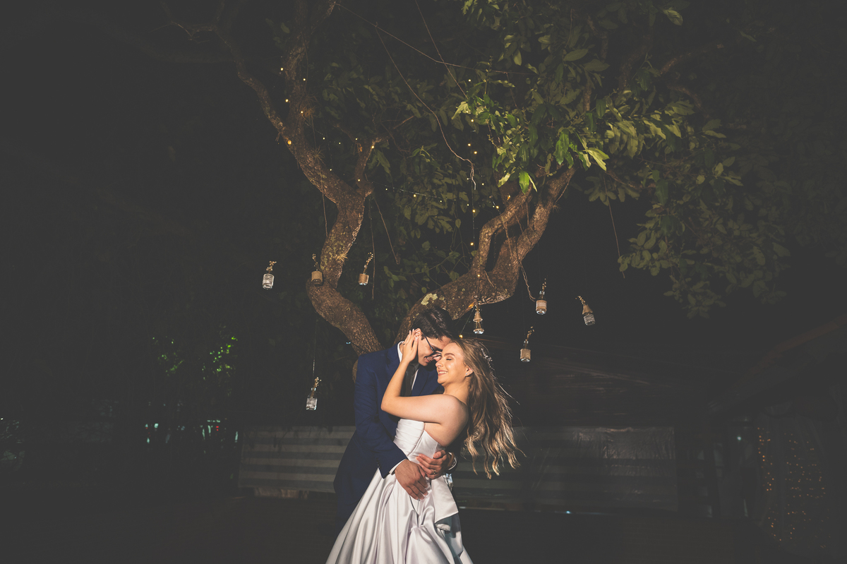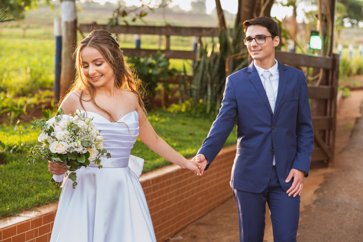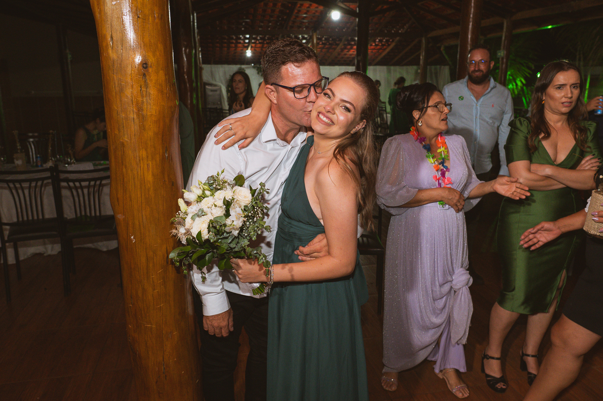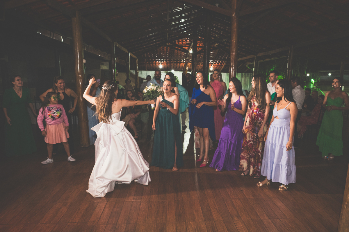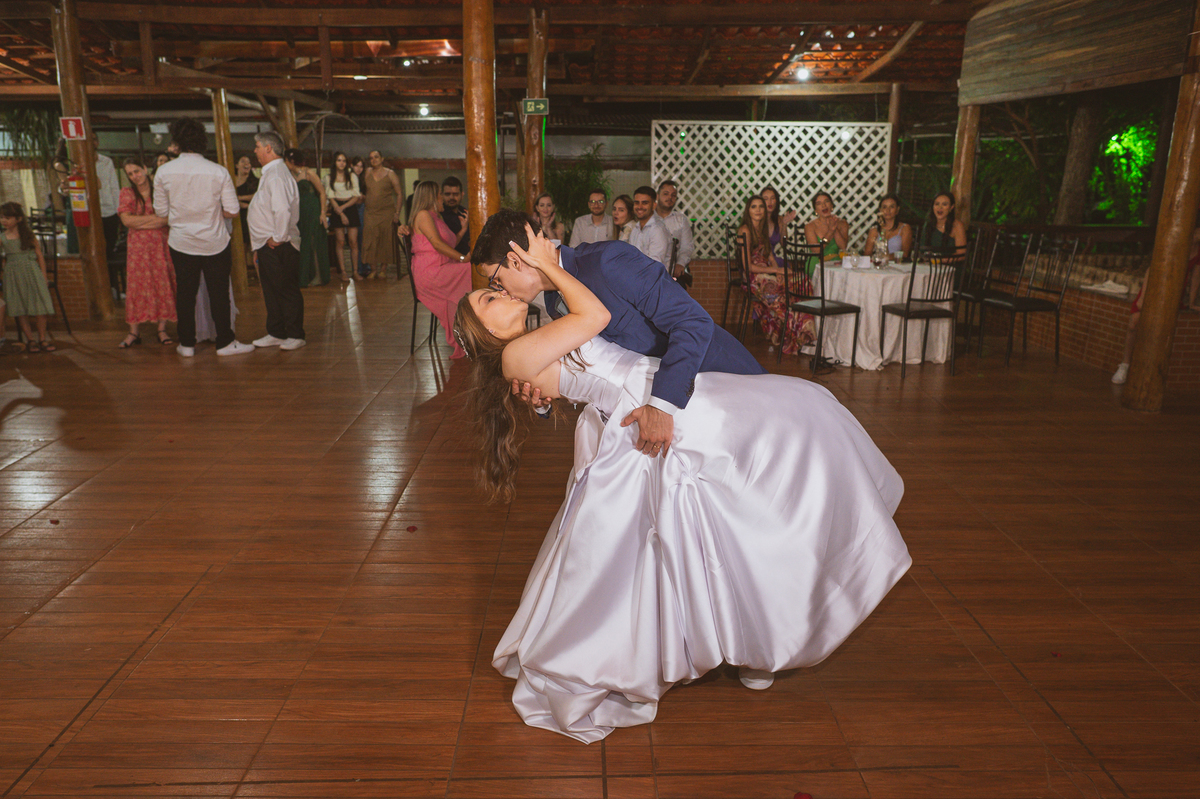 Depois da cerimônia maravilhosa que tivemos, nós realizamos um mini ensaio dos noivos. Convidamos também as madrinhas e os padrinhos para fotografar com eles. Foi muito legal contar com todos. Por fim, era chegada a hora dos noivos entrarem na festa. Além da entrada tradicional, eles brindaram e fizeram o corte do bolo. Posteriormente, eles prepararam a sua primeira dança de casados. Uma valsa linda e cheia de movimentos devidamente treinados. O pai da noiva também participou dessa primeira dança, recebendo a mão de sua filha novamente do noivo. Eles dançaram lindamente, uma valsa bem tradicional. Quando pensávamos que tudo estava finalizado e que a valsa havia terminado, uma reviravolta na música. Do nada, o DJ parou a música repentinamente e soltou um batidão das antigas. Os dois olharam um pro outro e já pegaram os óculos escuros no bolso e colocaram, acenando para os convidados que não tinha acabado!