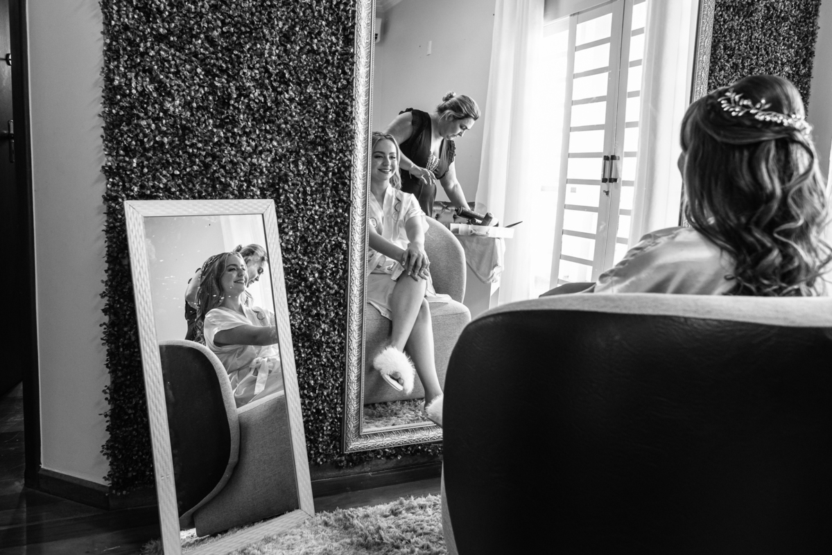 O tempo foi passando, as coisas foram mudando e a história do casamento mudou completamente. Eles ganharam a locação da recepção, logo teríamos fotos da festa também. Combinamos tudo direitinho e eles mal sabiam as surpresas que estavam por vir. Fizemos nosso ensaio de pré-casamento e ficou lindo. Ali mesmo já foi possível enxergar o que Deus queria fazer no casamento dos dois. Tivemos chuva, sol, pôr do sol... Enfim, tudo conforme Deus quis. E eis que a mãe da noiva me procura dizendo que gostaria de presentear os noivos com mais horas de fotos da recepção. Mais uma vez Deus fazendo os milagres acontecer. Eis que o grande dia chega, começamos os preparativos do making of no salão Keulla Pereira Makeup. Eduarda estava se arrumando, com um sorriso de canto a canto do rosto, já tradicional dela.