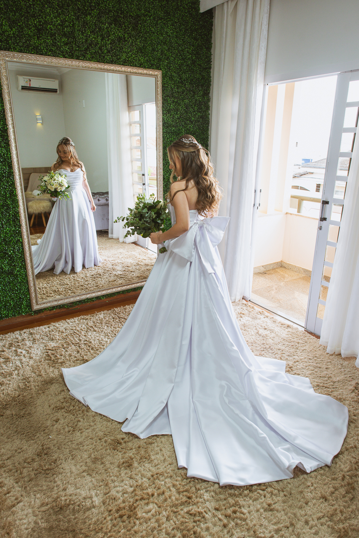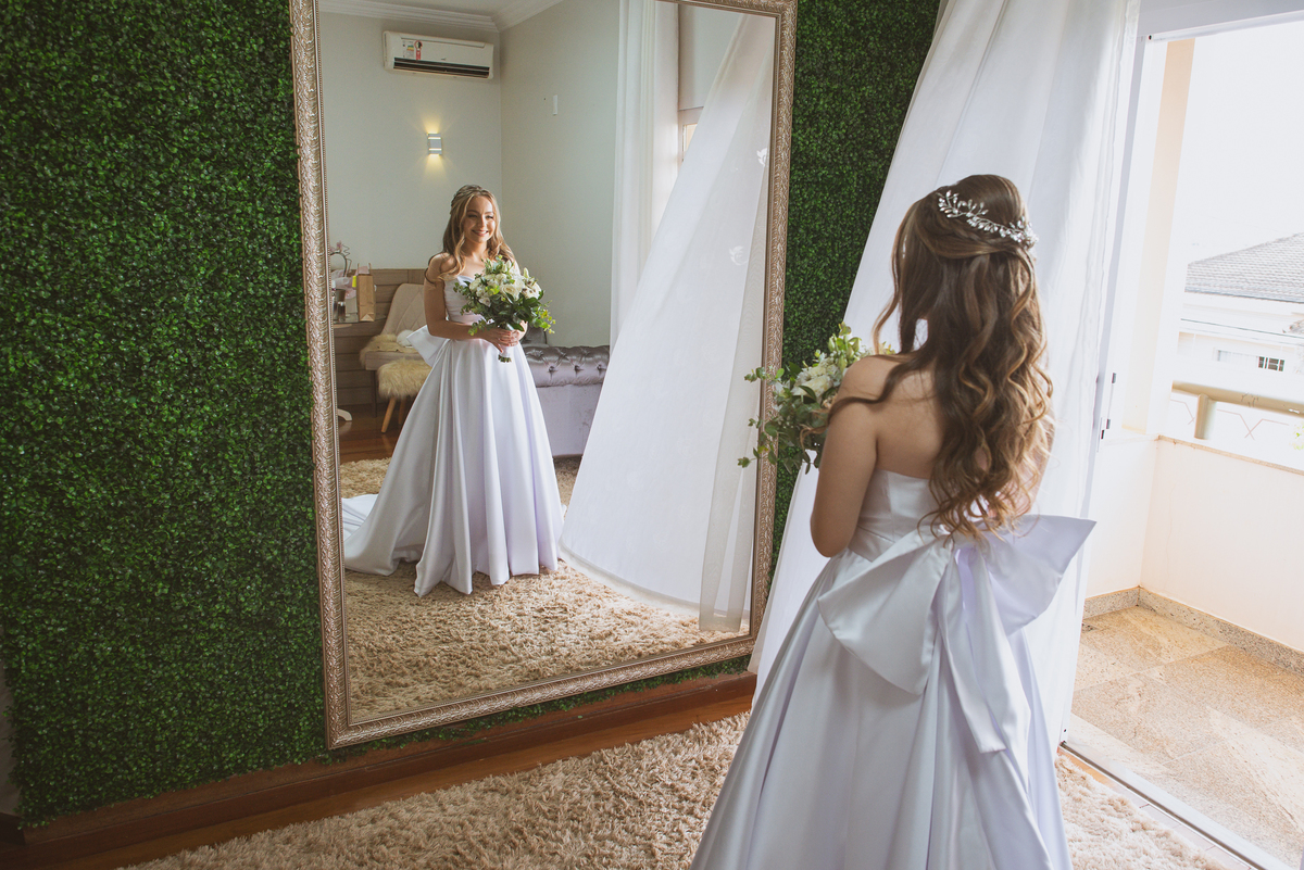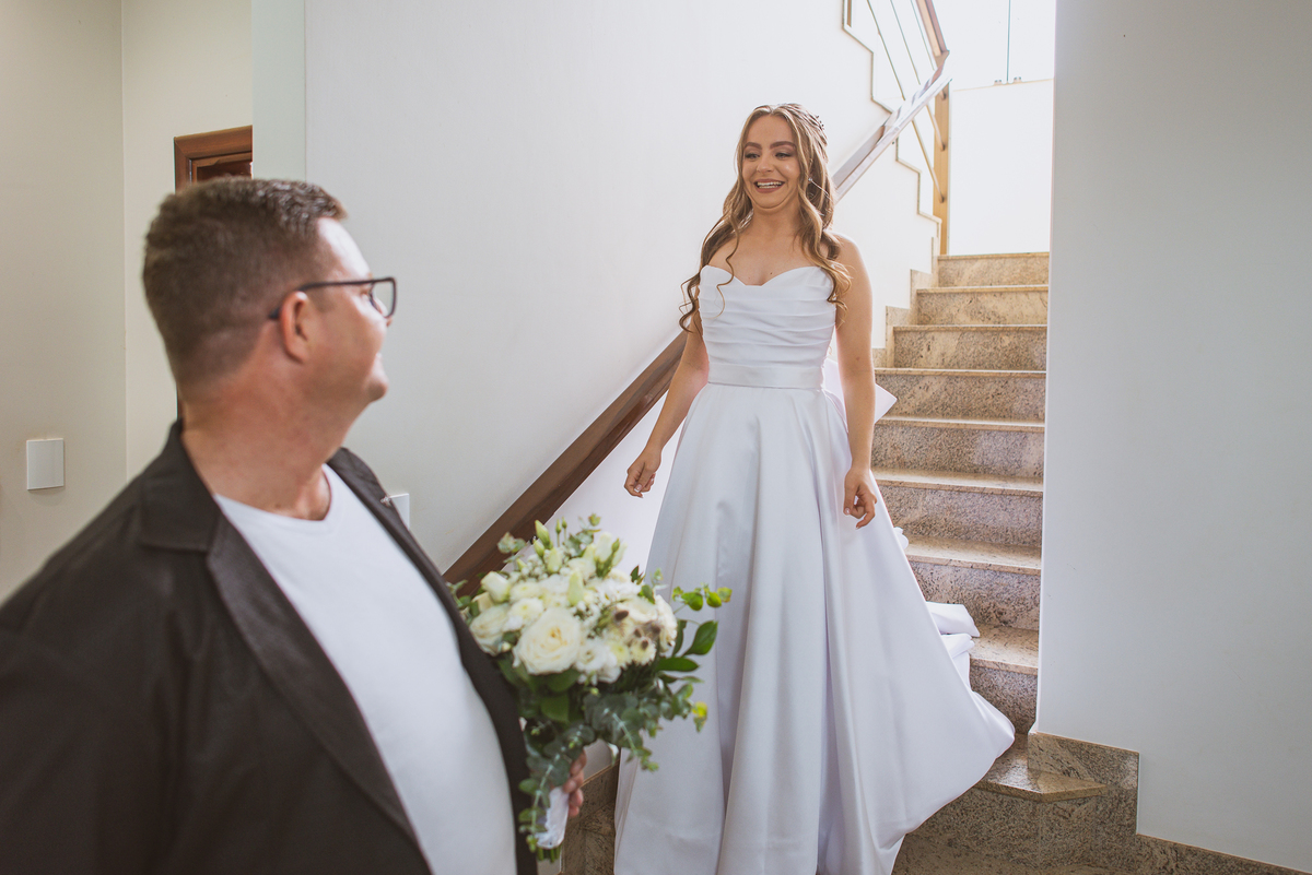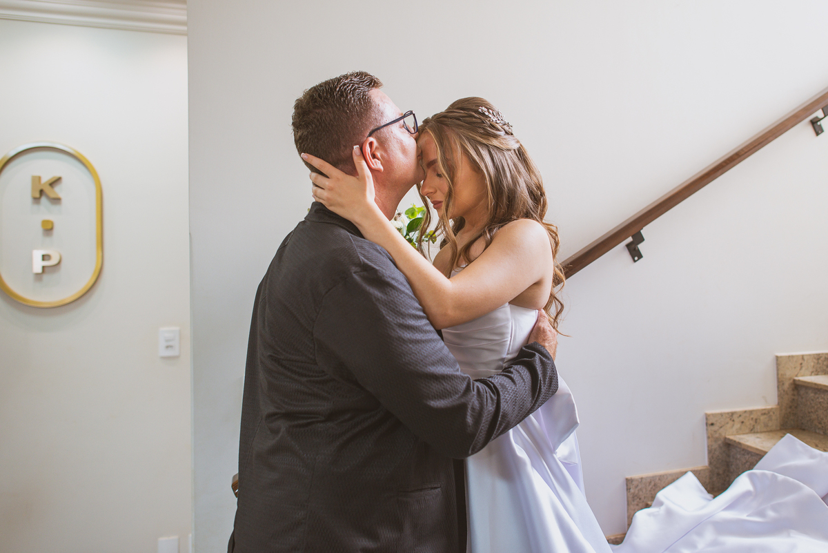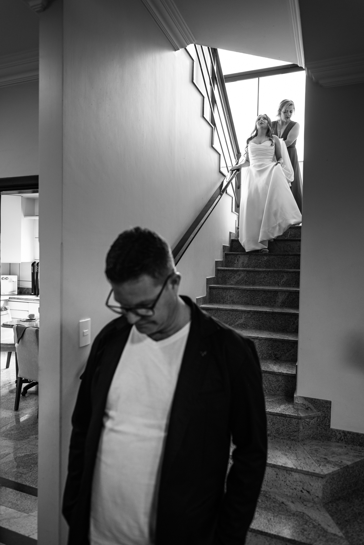 Quando a porta se abriu novamente e vimos a noiva pronta, foi uma surpresa maravilhosa. Eduarda estava simplesmente deslumbrante, com um vestido charmosíssimo e com a produção impecável. Além de tudo, seu sorriso compunha a cena como um filme de princesa. Fizemos alguns retratos, posamos de todos os jeitos possíveis dentro do nosso curto tempo. Tudo estava lindíssimo. Eduarda havia me dito que gostaria muito de fazer uma surpresa para seu pai. Queria que registrássemos o momento em que ele a visse vestida de noiva. Esse momento é chamado First Look e confesso para vocês que até eu me emocionei com essa cena. Ela foi descendo as escadas com a ajuda da mamãe enquanto seu pai a aguardava no primeiro degrau, de costas para a escada. Passo a passo, o coração ia apertando e os olhos mal conseguiam segurar as lágrimas. A energia daquele momento era indescritível...