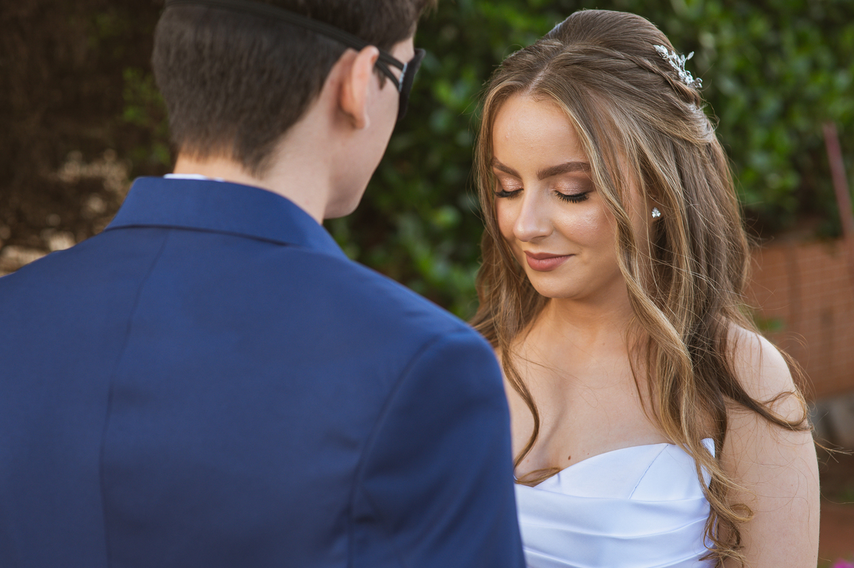 Depois de mais alguns passos, Eduarda e seu pai chegaram ao final do corredor. Eduardo foi ao encontro dos dois, seu sogro despediu-se de sua filha e entregou a mão dela para o noivo. Agora frente a frente, eles olharam nos olhos, sorriram um para o outro e com um beijo respeitoso, Eduardo selou aquele momento único. Agora juntos, eles caminharam para receber a bênção de Deus sobre a sua união. O Pastor celebrante os recebeu com muito carinho. Ele ministrou uma palavra maravilhosa, deixou os noivinhos muito à vontade, os fez rir bastante. Além disso, deixou uma mensagem muito forte a respeito do casamento para os dois. As alianças foram abençoadas, os noivos trocaram um com o outro e era chegada a hora dos votos. Oh bendita hora! Como não bastasse toda a emoção que já vivenciamos até aquele momento, eis que os dois me surgem com os votos escritos um para o outro.