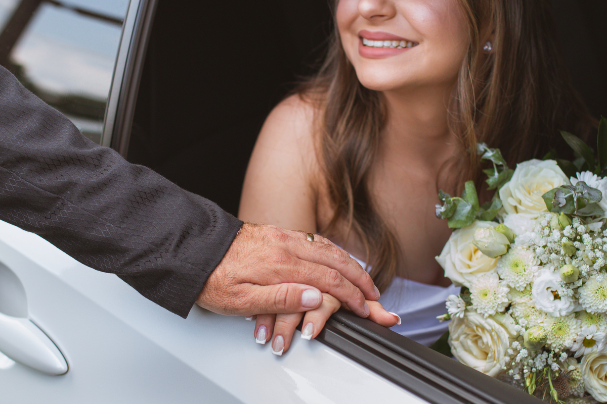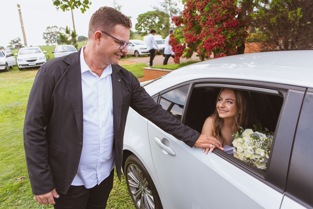 Quando ela chegou no penúltimo degrau, sua mãe entregou o buquê nas mãos do papai. Ela disse: "Amor, entregue o buquê para ela". Ele se virou, olhou nos olhos dela e abriu um sorriso imenso. Quase que ao mesmo tempo seus olhos se encheram de lágrimas. Ele pegou a mão de sua filha, beijou com o rosto já molhado pela sua emoção. Olhou mais uma vez em seus olhos e a abraçou. Aqueles segundos pareciam não ter fim. Foi uma emoção difícil até de escrever aqui. Digo isso porque muita das vezes, as palavras por si só não conseguem transmitir a mensagem do que queremos passar. Mas através da junção entre o texto, as fotos e o vídeo vocês poderão ter uma noção de quão especial foi esse momento. Depois de se abraçarem, era hora de ir para a chácara.