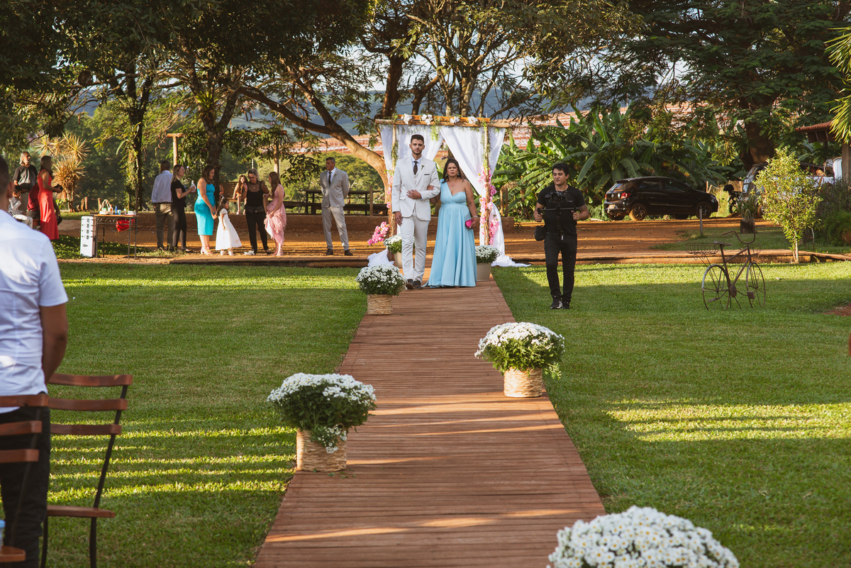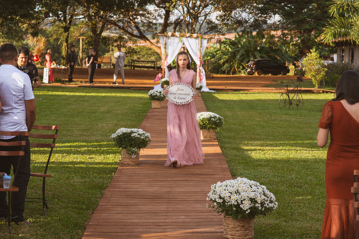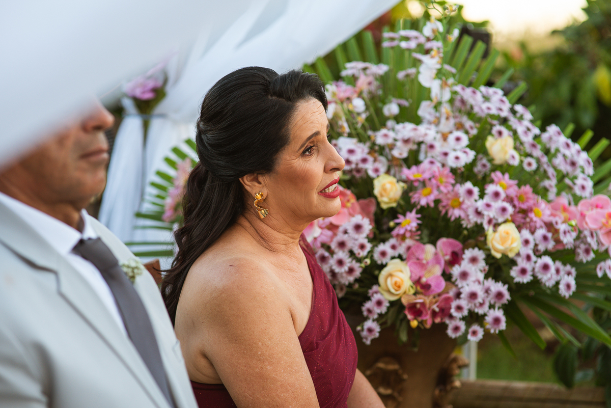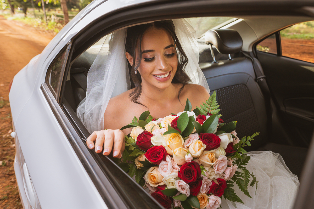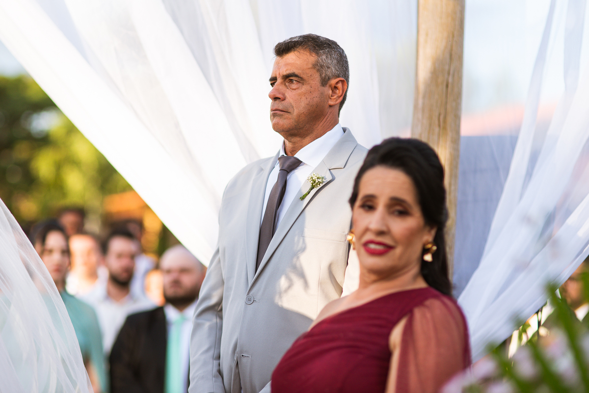 Os padrinhos todos já estavam alinhados e prontos para que a cerimônia começasse. Os músicos do Som do Coração já estavam entoando suas lindíssimas canções e embalavam o andamento da organização. O celebrante já se posicionou em frente ao altar e aguardou que tudo ficasse pronto para iniciar. Fizemos as fotografias da noiva no carro, com toda a calma do mundo. Ela estava lindíssima, com seu buquê nas mãos e o sorriso característico dela no rosto. Deixamos ela por lá e fomos para o altar aguardar o início. O cerimonial deu inicio à celebração. Os músicos começaram a tocar as músicas escolhidas pela noiva e os padrinhos começaram a entrar, casal por casal. Foi um verdadeiro desfile de beleza.
